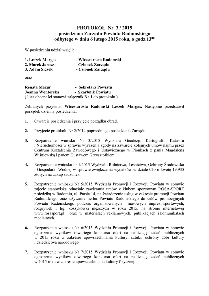 PROTOKÓŁ Nr 3 / 2015 posiedzenia Zarządu Powiatu Radomskiego odbytego w dniu 6 lutego 2015 roku, o godz.1300 W posiedzeniu udział wzięli: 1. Leszek Margas 2. Marek Jarosz 3. Adam Siczek - Wicestarosta Radomski - Członek Zarządu - Członek Zarządu oraz Renata Mazur - Sekretarz Powiatu Joanna Wontorska - Skarbnik Powiatu ( lista obecności stanowi załącznik Nr 1 do protokołu ) Zebranych przywitał Wicestarosta Radomski Leszek Margas. Następnie przedstawił porządek dzienny posiedzenia: 1. Otwarcie posiedzenia i przyjęcie porządku obrad. 2. Przyjęcie protokołu Nr 2/2014 poprzedniego posiedzenia Zarządu. 3. Rozpatrzenie wniosku Nr 3/2015 Wydziału Geodezji, Kartografii, Katastru i Nieruchomości w sprawie wyrażenia zgody na zawarcie kolejnych umów najmu przez Centrum Kształcenia Zawodowego i Ustawicznego w Pionkach z panią Magdaleną Wiśniewską i panem Gustawem Krzysztofkiem. 4. Rozpatrzenie wniosku nr 1/2015 Wydziału Rolnictwa, Leśnictwa, Ochrony Środowiska i Gospodarki Wodnej w sprawie zwiększenia wydatków w dziale 020 o kwotę 19.935 złotych na zakup sadzonek. 5. Rozpatrzenie wniosku Nr 5/2015 Wydziału Promocji i Rozwoju Powiatu w sprawie zajęcie stanowiska odnośnie zawierania umów z klubem sportowym ROSA-SPORT z siedzibą w Radomiu, ul. Ptasia 14, na świadczenie usług w zakresie promocji Powiatu Radomskiego oraz używanie herbu Powiatu Radomskiego do celów promocyjnych Powiatu Radomskiego podczas organizowanych masowych imprez sportowych, rozgrywek I ligi koszykówki mężczyzn w roku 2015, na stronie internetowej www.rosasport.pl oraz w materiałach reklamowych, publikacjach i komunikatach medialnych. 6. Rozpatrzenie wniosku Nr 6/2015 Wydziału Promocji i Rozwoju Powiatu w sprawie ogłoszenia wyników otwartego konkursu ofert na realizację zadań publicznych w 2015 roku w zakresie upowszechniania kultury, sztuki, ochrony dóbr kultury i dziedzictwa narodowego. 7. Rozpatrzenie wniosku Nr 7/2015 Wydziału Promocji i Rozwoju Powiatu w sprawie ogłoszenia wyników otwartego konkursu ofert na realizację zadań publicznych w 2015 roku w zakresie upowszechniania kultury fizycznej. 8. Rozpatrzenie wniosku Nr 8/2015 Wydziału Promocji i Rozwoju Powiatu w sprawie Konkursu Gospodarczego Starosty Radomskiego „Perła Powiatu” organizowanego przez Starostę Radomskiego. 9. Rozpatrzenie wniosku Nr 9/2015 Wydziału Promocji i Rozwoju Powiatu w sprawie opinii do analizy powiązania drogi z innymi drogami publicznymi w ramach zadania realizowanego przez Gminę Zakrzew pn.: Przebudowa drogi gminnej w m. Marianowice, gm. Zakrzew. 10. Rozpatrzenie wniosku Nr 2/2015 Wydziału Edukacji w sprawie wyrażenia zgody na wprowadzenie zmian w budżecie powiatu na 2015 rok oraz dokonanie zmiany dotyczącej Wieloletniej Prognozy Finansowej powiatu radomskiego. 11. Rozpatrzenie wniosku Nr 3/2015 Wydziału Edukacji w sprawie wyrażenia zgody na wprowadzenie zmian w budżecie powiatu na 2015 rok oraz dokonanie zmiany dotyczącej Wieloletniej Prognozy Finansowej powiatu radomskiego. 12. Podjęcie uchwały w sprawie ustalenia planu finansowego zadań z zakresu administracji rządowej na 2015 rok. 13. Podjęcie uchwały w sprawie przekazania ostatecznych kwot dochodów i wydatków podległym jednostkom powiatu radomskiego na 2015 rok. 14. Podjęcie uchwały w sprawie zmian w planie wydatków budżetu powiatu na 2015 rok i planie finansowym zadań z zakresu administracji rządowej. 15. Sprawy różne. W/w porządek dzienny posiedzenia został przyjęty jednogłośnie. Przystąpiono do realizacji 2 pktu porządku dziennego posiedzenia – przyjęcie protokołu Nr 2/2014 poprzedniego posiedzenia Zarządu. Protokół Nr 2/2014 poprzedniego posiedzenia Zarządu został przyjęty jednogłośnie, bez uwag. Przystąpiono do realizacji 3 pktu porządku dziennego posiedzenia – rozpatrzenie wniosku Nr 3/2015 Wydziału Geodezji, Kartografii, Katastru i Nieruchomości w sprawie wyrażenia zgody na zawarcie kolejnych umów najmu przez Centrum Kształcenia Zawodowego i Ustawicznego w Pionkach z panią Magdaleną Wiśniewską i panem Gustawem Krzysztofkiem. Wicestarosta Radomski Leszek Margas poinformował, że wniosek dotyczy wyrażenia przez Zarząd Powiatu zgody na zawarcie umowy najmu na czas oznaczony do lat 3, przez Centrum Kształcenia Zawodowego i Ustawicznego w Pionkach z Panią Magdaleną Wiśniewską i Panem Gustawem Krzysztofek na oddanie w najem pomieszczeń 2 gospodarczych o powierzchni 15 m2 każdy, z przeznaczeniem na garażowanie samochodów prywatnych. Zarząd Powiatu podjął uchwały: - Nr 9/2015 w sprawie wyrażenia zgody na zawarcie kolejnej umowy najmu na czas oznaczony ( z panią Magdaleną Wiśniewską ), która stanowi załącznik Nr 2 do protokołu oraz - Nr 10/2015 w sprawie wyrażenia zgody na zawarcie kolejnej umowy najmu na czas oznaczony ( z panem Gustawem Krzysztofek ), która stanowi załącznik Nr 3 do protokołu. Przystąpiono do realizacji 4 pktu porządku dziennego posiedzenia – rozpatrzenie wniosku nr 1/2015 Wydziału Rolnictwa, Leśnictwa, Ochrony Środowiska i Gospodarki Wodnej w sprawie zwiększenia wydatków w dziale 020 o kwotę 19.935 złotych na zakup sadzonek. Wicestarosta Radomski Leszek Margas poinformował, że wniosek dotyczy wprowadzenia do planu budżetu powiatu na 2015r. środków w wysokości 19 935 zł. na zalesianie gruntów porolnych stanowiących własność osób fizycznych na terenie powiatu radomskiego. Poinformował, że do Wojewódzkiego Funduszu Ochrony Środowiska i Gospodarki Wodnej w Warszawie zostanie złożony wniosek o dofinansowanie powyższego zadania w wysokości 50% tj. w kwocie 19 935 zł. W związku z powyższym konieczne jest zabezpieczenie w budżecie powiatu środków własnych. Zarząd Powiatu w/w wniosek rozpatrzył pozytywnie. Środki na realizację wniosku pochodzić będą z rezerwy ogólnej. Przystąpiono do realizacji 5 pktu porządku dziennego posiedzenia – rozpatrzenie wniosku Nr 5/2015 Wydziału Promocj