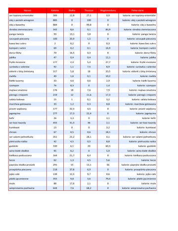 Nazwa Kalorie Białka Tłuszcze Węglowodany Pełne dane ser topiony ementaler 306 12,8 27,1 0,9 kalorie: ser topiony ementaler olej z pestek winogron 885 0 100 0 kalorie: olej z pestek winogron olej z bawełny 884 0 99,8 0 kalorie: olej z bawełny skrobia ziemniaczana 342 0,6 0,1 83,9 panga świeża 93 13,1 3,8 0 kalorie: panga świeża szczupak pieczony 100 20,9 1,5 0 kalorie: szczupak pieczony kawa bez cukru 2 0,2 0 0,3 kalorie: kawa bez cukru kompot z wiśni 69 0,2 0,1 16,9 kalorie: kompot z wiśni dorsz filety 70 16,5 0,3 0 jabłka 47 0,4 0,4 12,1 kalorie: jabłka frytki mrożone 177 2,4 5,4 27,7 kalorie: frytki mrożone surówka z selerów 92 1,1 7,5 8,9 kalorie: surówka z selerów eklerki z bitą śmietaną 317 5,8 18 33,5 kalorie: eklerki z bitą śmietaną ćwikła 40 1,6 0,1 10,2 kalorie: ćwikła kiełki lucerny 33 4,6 0,6 2,9 kalorie: kiełki lucerny szampan 76 0,3 0 1,4 kalorie: szampan mątwa smażona 176 18 7,6 7,9 kalorie: mątwa smażona pierogi z mięsem 219 12 11,6 17,3 kalorie: pierogi z mięsem sałata lodowa 15 1 0,1 3,2 kalorie: sałata lodowa marchew gotowana 33 1,2 0,3 8,8 kalorie: marchew gotowana jesiotr wędzony 177 32,3 4,5 0 kalorie: jesiotr wędzony jagnięcina 277 17,3 22,4 0 kalorie: jagnięcina kefir 26 3,3 0 3,1 kalorie: kefir ser kozi twardy 455 31,3 36 2,1 kalorie: ser kozi twardy kumkwat 13 0 0 3,2 kalorie: kumkwat chrzan 67 4,5 0,6 18,1 kalorie: chrzan ser salami pełnotłusty 351 25,2 28,1 0,1 kalorie: ser salami pełnotłusty pietruszka natka 42 4,5 0,5 8,8 kalorie: pietruszka natka goździki 330 6,1 20 60,3 kalorie: goździki wino białe słodkie 95 0,2 0 5,9 kalorie: wino białe słodkie kiełbasa podsuszana 164 21,7 8,4 0 leczo 62 1,3 4,5 5,6 kalorie: leczo papryka słodka proszek 291 15 13,1 56 kalorie: papryka słodka proszek przepiórka pieczona 218 37,8 6,9 0 kalorie: przepiórka pieczona jajko całe 139 12,5 9,7 0,6 kalorie: jajko całe płatki jęczmienne 355 9,8 3,6 79,4 kalorie: płatki jęczmienne mule 88 17,6 2,1 0 kalorie: mule wieprzowina pachwina 644 7,6 68,2 0 kalorie: wieprzowina pachwina kalorie: skrobia ziemniaczana kalorie: dorsz filety kalorie: kiełbasa podsuszana