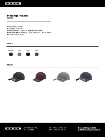 Melange Flexfit 6277ML • Wygląd sportowy • Sztywny bukram • Dopasowana czapka w wykonaniu Flexfit • Materiał: 66% wiskoza / 31% poliester / 3% elastan • Rozmiar: S/M, L/XL Kolory Burgundy Grey Black Navy Zdjęcia ul. Plonowa 20 B, 91-156 Łódź tel.: 48 42 650-97-60 fax: 48 42 650-97-70 Biuro obsługi klienta e-mail: [email protected]