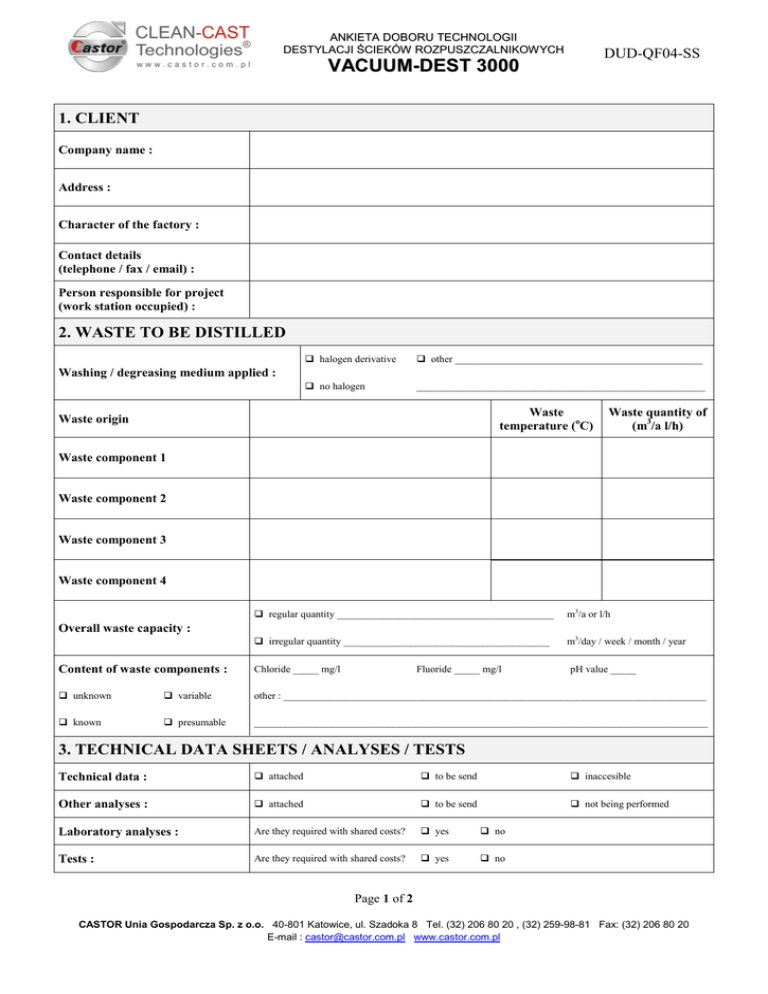 ANKIETA DOBORU TECHNOLOGII DESTYLACJI ŚCIEKÓW ROZPUSZCZALNIKOW YCH DUD-QF04-SS VACUUM-DEST 3000 1. CLIENT Company name : Address : Character of the factory : Contact details (telephone / fax / email) : Person responsible for project (work station occupied) : 2. WASTE TO BE DISTILLED halogen derivative other ________________________________________________ no halogen ________________________________________________________ Washing / degreasing medium applied : Waste temperature (oC) Waste origin Waste quantity of (m3/a l/h) Waste component 1 Waste component 2 Waste component 3 Waste component 4 regular quantity __________________________________________ m3/a or l/h irregular quantity ________________________________________ m3/day / week / month / year Overall waste capacity : Content of waste components : Chloride _____ mg/l unknown variable other : __________________________________________________________________________________ known presumable ________________________________________________________________________________________ Fluoride _____ mg/l pH value _____ 3. TECHNICAL DATA SHEETS / ANALYSES / TESTS Technical data : attached to be send inaccesible Other analyses : attached to be send not being performed Laboratory analyses : Are they required with shared costs? yes no Tests : Are they required with shared costs? yes no Page 1 of 2 CASTOR Unia Gospodarcza Sp. z o.o. 40-801 Katowice, ul. Szadoka 8 Tel. (32) 206 80 20 , (32) 259-98-81 Fax: (32) 206 80 20 E-mail : [email protected] www.castor.com.pl ANKIETA DOBORU TECHNOLOGII DESTYLACJI ŚCIEKÓW ROZPUSZCZALNIKOW YCH VACUUM-DEST 3000 DUD-QF04-SS 4. ADDITIONAL INFORMATION Remarks : Date and signatureof the person filling questionnaire : Page 2 of 2 CASTOR Unia Gospodarcza Sp. z o.o. 40-801 Katowice, ul. Szadoka 8 Tel. (32) 206 80 20 , (32) 259-98-81 Fax: (32) 206 80 20 E-mail : [email protected] www.castor.com.pl
