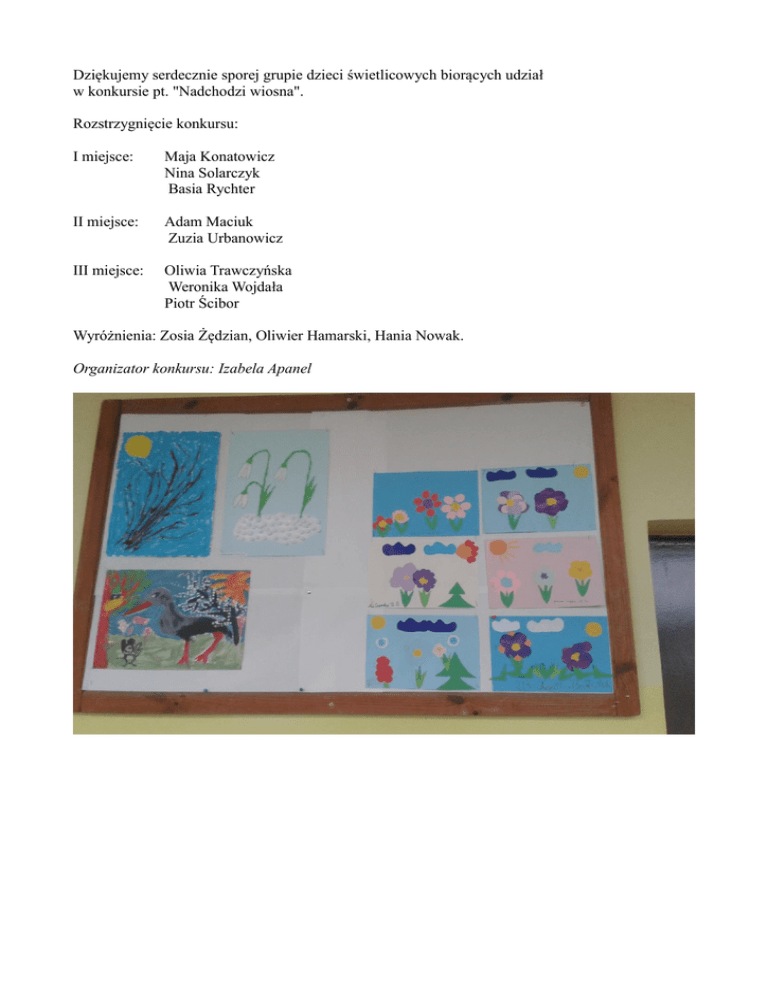 Dziękujemy serdecznie sporej grupie dzieci świetlicowych biorących udział w konkursie pt. "Nadchodzi wiosna". Rozstrzygnięcie konkursu: I miejsce: Maja Konatowicz Nina Solarczyk Basia Rychter II miejsce: Adam Maciuk Zuzia Urbanowicz III miejsce: Oliwia Trawczyńska Weronika Wojdała Piotr Ścibor Wyróżnienia: Zosia Żędzian, Oliwier Hamarski, Hania Nowak. Organizator konkursu: Izabela Apanel