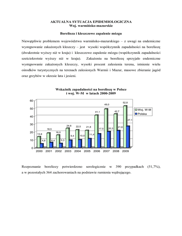AKTUALNA SYTUACJA EPIDEMIOLOGICZNA Woj. warmińsko-mazurskie Borelioza i kleszczowe zapalenie mózgu Niewątpliwie problemem województwa warmińsko-mazurskiego – z uwagi na endemiczne występowanie zakażonych kleszczy – jest wysoki współczynnik zapadalności na boreliozę (dwukrotnie wyższy niż w kraju) i kleszczowe zapalenie mózgu (współczynnik zapadalności sześciokrotnie wyższy niż w kraju). Zakażeniu na boreliozę sprzyjało endemiczne występowanie zakażonych kleszczy, wysoki procent zalesienia terenu, istnienie wielu ośrodków turystycznych na terenach zalesionych Warmii i Mazur, masowe zbieranie jagód oraz grzybów w okresie lata i jesieni. Wskaźnik zapadalności na boreliozę w Polsce i woj. W-M w latach 2000-2009 60 52,8 49,0 50 Woj. W-M 42,7 41,1 Polska 40 27,1 30 24,6 22,5 21,8 18,5 20 20,3 21,6 16,0 13,8 10 17,5 9,4 4,8 6,4 10,0 11,4 5,3 0 2000 2001 2002 2003 2004 2005 2006 2007 2008 2009 Rozpoznanie boreliozy potwierdzono serologicznie w 390 przypadkach a w pozostałych 364 zachorowaniach na podstawie rumienia wędrującego. (51,7%), Zachorowania i wskaźniki zapadalności na boreliozę w woj. W-M w latach 2006-2009. PSSE 2006 2007 2008 2009 zach. zapad. zach. zapad. zach. zapad. zach. zapad. Województwo 586 41,1 699 49,0 609 42,7 754 52,8 Bartoszyce 18 29,3 24 39,3 37 61,1 18 29,9 Braniewo 3 6,9 - - - - 1 2,3 Działdowo 26 39,9 23 35,4 12 18,5 24 36,8 Elbląg 52 28,3 47 25,6 23 12,6 30 16,4 Ełk 73 86,1 69 81,1 94 109,8 35 40,6 Giżycko 24 42,2 22 38,7 19 33,5 6 10,6 Gołdap 7 25,9 9 33,8 12 44,7 13 49,1 Iława 67 74,5 61 67,7 46 51,0 61 67,4 Kętrzyn 1 1,5 11 16,6 1 1,5 11 16,9 Lidzbark W. 7 16,3 18 42,2 5 11,7 17 39,9 Mrągowo 22 43,9 18 36,0 20 39,9 18 35,8 Nidzica 23 67,7 22 65,0 8 23,8 6 17,9 N.M.L. 15 34,6 14 32,1 12 27,6 22 50,3 Olecko 16 46,8 17 49,6 20 58,8 18 52,7 Olsztyn 72 25,0 153 52,9 124 42,6 145 49,5 Ostróda 117 111,1 118 112,4 114 108,7 218 208,5 Pisz 22 38,2 38 66,1 35 61,0 78 136,3 Szczytno 17 24,5 29 41,8 26 37,5 28 40,4 Wegorzewo 4 16,9 6 25,7 1 4,2 5 21,4 6680 17,5 7723 20,3 8248 21,6 10313 27,1 Polska W 2009 roku najwyższy wsk. zap. na boreliozę wystąpił w powiecie: Ostróda – 208,5; Pisz – 136,3; Iława – 67,4; Olecko – 52,7; Nowe Miasto Lubawskie – 50,3; Olsztyn – 49,5; Wskaźniki zapadalności na wirusowe zapalenie mózgu przenoszone przez kleszcze w Polsce i woj. W-M w latach 2000-2009 8,8 9 8 7,4 6,3 7 6 6,4 5,0 5 WOJ. W-M Polska 5,5 4,4 3,8 4 3,3 2,2 3 2 0,9 0,4 1 0,5 0,3 0,9 0,8 0,7 0,5 0,6 0,5 0 2000 2001 2002 2003 2004 2005 2006 2007 2008 2009 Zachorowania i wskaźniki zapadalności na wirusowe zapalenie mózgu przenoszone przez kleszcze w woj. W-M w latach 2006-2009. PSSE Województwo Bartoszyce Braniewo Działdowo Elbląg Ełk Giżycko Gołdap Iława Kętrzyn Lidzbark W. Mrągowo Nidzica Nowe Miasto L. Olecko Olsztyn Ostróda Pisz Szczytno Węgorzewo 2006 zach. 90 1 9 9 5 9 3 4 26 21 3 2007 zapad. zach. zapad. 6,3 92 6,4 1 1,6 2,3 4 9,1 1 0,5 10,6 15 17,7 15,8 10 17,6 18,5 4 14,8 2 3,0 4 9,2 18,0 3 5,9 8,8 2 5,8 1,4 2 0,7 45,2 22 38,1 30,3 19 27,3 12,7 3 12,6 2008 zach. 54 2 1 4 5 2 1 3 3 4 2 12 15 - 2009 zapad. zach. zapad. 3,8 5,5 3,3 3 5,0 0,5 3 5,3 4,7 10 12,0 8,8 4 7,0 7,5 4 15,1 1 1,5 2,3 3 7,0 6,0 5 9,9 8,8 4 12,0 1,4 4 1,7 1,9 20,9 21 37,0 21,7 15 22,0 2 8,6 Polska 316 0,8 233 0,6 200 0,5 - 0,9 Położenie w terenie endemicznego występowania zakażonych kleszczy przekłada się również na liczbę zachorowań na kleszczowe zapalenie mózgu. Przypadki zachorowań koncentrują się głównie w powiatach wschodnich województwa. Przed kleszczowym zapaleniem mózgu może nas uchronić szczepienie.