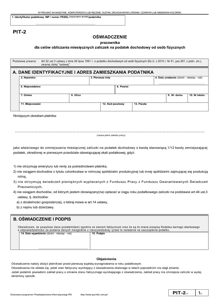 WYPEŁNIAĆ NA MASZYNIE, KOMPUTEROWO LUB RĘCZNIE, DUŻYMI, DRUKOWANYMI LITERAMI, CZARNYM LUB NIEBIESKIM KOLOREM. 1. Identyfikator podatkowy NIP / numer PESEL (niepot rzebne skreślić) podatnika PIT-2 OŚWIADCZENIE pracownika dla celów obliczania miesięcznych zaliczek na podatek dochodowy od osób fizycznych Podstawa prawna: Art.32 ust.3 ustawy z dnia 26 lipca 1991 r. o podatku dochodowym od osób fizycznych (Dz.U. z 2010 r. Nr 51, poz.307, z późn. zm.), zwanej dalej "ustawą". A. DANE IDENTYFIKACYJNE I ADRES ZAMIESZKANIA PODATNIKA 2. Nazwisko 3. Pierwsze imię 5. Województwo 7. Gmina 4. Data urodzenia (dzień - miesiąc - rok) 6. Powiat 8. Ulica 11. Miejscowość 9. Nr domu 12. Kod pocztowy 10. Nr lokalu 13. Poczta Niniejszym określam płatnika: (nazwa pełna zakładu pracy) jako właściwego do zmniejszania miesięcznej zaliczki na podatek dochodowy o kwotę stanowiącą 1/12 kwoty zmniejszającej podatek, określonej w pierwszym przedziale obowiązującej skali podatkowej, gdyż: 1) nie otrzymuję emerytury lub renty za pośrednictwem płatnika, 2) nie osiągam dochodów z tytułu członkostwa w rolniczej spółdzielni produkcyjnej lub innej spółdzielni zajmującej się produkcją rolną, 3) ni e otrzym uj ę św ia dc ze ń pi enię żn yc h w ypł acanyc h z Fu ndu szu Pracy z Fun duszu Gwaran towanych Świ adczeń Pracowniczych, 4) nie osiągam dochodów, od których jestem obowiązany(na) opłacać w ciągu roku podatkowego zaliczki na podstawie art.44 ust.3 ustawy, tj. dochodów: a) z działalności gospodarczej, o której mowa w art.14 ustawy, b) z najmu lub dzierżawy. B. OŚWIADCZENIE I PODPIS Oświadczam, że powyższe dane podałem(łam) zgodnie ze stanem faktycznym oraz że są mi znane przepisy Kodeksu karnego skarbowego o odpowiedzialności za podanie danych niezgodnie z rzeczywistością i przez to narażenie na uszczuplenie podatku. 14. Data wypełnienia (dzień - miesiąc - rok) 15. Podpis Objaśnienia Oświadczenie należy złożyć płatnikowi przed pierwszą wypłatą wynagrodzenia w roku podatkowym. Oświadczenia nie składa się, jeżeli stan faktyczny wynikający z oświadczenia złożonego w latach poprzednich nie uległ zmianie. Jeżeli podatnik powiadomi zakład pracy o zmianie stanu faktycznego wynikającego z oświadczenia, zakład pracy nie zmniejsza zaliczki w wyżej określony sposób. Drukowane programem Przedsiębiorstwa Informatycznego IPS http://www.ips-infor.com.pl/ PIT-2 (3) 1/1