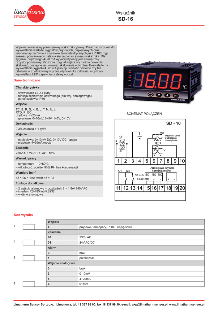 Wskaźnik SENSOR SD-16 W pełni uniwersalny przemysłowy wskaźnik cyfrowy. Przeznaczony jest do wyświetlania wartości sygnałów prądowych, napięciowych oraz temperatury zarówno z czujników termoelektrycznych jak i Pt100. Typ zakresu pomiarowego ustawia się za pomocą menu wskaźnika. Dla sygnału prądowego 4÷20 mA wykorzystywany jest zewnętrzny rezystor pomiarowy 250 Ohm. Sygnał wejściowy można dowolnie skalować, dostępne jest również skalowanie odwrotne. Pozwala to na wyświetlanie sygnału 4÷20 mA jako np. wartość poziomu czy też ciśnienia w zdefiniowanym przez użytkownika zakresie. 4-cyfrowy wyświetlacz LED zapewnia czytelny odczyt. Dane techniczne Charakterystyka – wyświetlacz LED 4 cyfry – funkcja skalowania odwrotnego (dla wej. analogowego) – panel czołowy: IP66 Wejście TC: B, R, S, K, E, J, T, N, U, L RTD: Pt100 prądowe: 4÷20mA napieciowe: 0÷10mV, 0÷5V, 1÷5V, 0÷10V SCHEMAT POŁĄCZEŃ Dokładność 0,3% zakresu + 1 cyfra Wyjście – napięciowe: 0÷10mV DC, 0÷10V DC (opcja) – prądowe: 4÷20mA (opcja) Zasilanie 230V AC, 24V DC / AC ±10% Warunki pracy – temperatura: -10÷50ºC – wilgotność: poniżej 90% RH bez kondensacji Wymiary [mm] 48 × 96 × 110; otwór 45 × 92 Funkcje dodatkowe – 2 wyjścia alarmowe – przekaźnik 2 × 1,5A/ 240V AC – interfejs RS-485 lub RS232 – wyjście analogowe Kod wyrobu 1 Wejście 4 prądowe, termopary, Pt100, napięciowe Zasilanie 2 90 230V AC 08 24V AC/DC Alarm 3 0 brak 1 przekaźnik Wejście analogowe 4 0 brak 3 0-10mV 4 4÷20mA 6 0÷10V Limatherm Sensor Sp. z o.o. Limanowa, tel. 18 337 99 00, fax 18 337 99 10, e-mail: [email protected], www.limathermsensor.pl Wskaźnik SENSOR SD-16 Komunikacja 5 0 brak 5 RS-485 7 RS232C 2 1 SD-16 – Przykład zamówienia: – 3 – 4 – 5 – Wskaźnik SD-16–4–08–1–3–5 Limatherm Sensor Sp. z o.o. Limanowa, tel. 18 337 99 00, fax 18 337 99 10, e-mail: [email protected], www.limathermsensor.pl