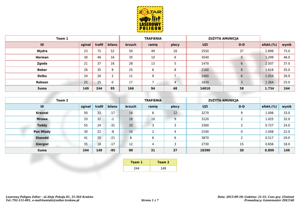 Team 1 TRAFIENIA ZUŻYTA AMUNICJA ID zginał trafił bilans brzuch ramię plecy UZI D-D efekt.(%) wynik Wydra 23 75 52 50 49 18 2550 37 2.899 75.0 Herman 30 46 16 35 10 6 3540 0 1.299 46.0 Zgoda 21 37 16 28 13 5 1470 6 2.507 37.0 Bober 26 35 9 25 6 8 2160 6 1.616 35.0 Dzibu 24 26 2 11 9 7 2460 6 1.054 26.0 Robson 25 25 0 17 7 4 1830 3 1.364 25.0 Suma 149 244 95 166 94 48 14010 58 1.734 244 Team 2 TRAFIENIA ZUŻYTA AMUNICJA ID zginał trafił bilans brzuch ramię plecy UZI D-D efekt.(%) wynik Krasnal 50 33 -17 16 6 12 3270 9 1.006 33.0 Mrowa 33 32 -1 18 10 9 3120 2 1.025 32.0 Teddy 55 24 -31 20 3 3 3300 2 0.727 24.0 Pan Mlody 30 22 -8 16 2 4 2100 0 1.048 22.0 Stassdd 41 20 -21 8 6 6 3870 2 0.517 20.0 Giergiel 35 18 -17 12 4 3 2730 15 0.656 18.0 Suma 244 149 -95 90 31 37 18390 30 0.809 149 Laserowy Poligon Zoltar - ul.Aleja Pokoju 81, 31-564 Kraków Tel.:792-111-091, e-mail:[email protected] Team 1 Team 2 244 149 Strona 1 z 7 Data: 2015-09-10; Godzina: 21:31; Czas gry: 25minut Prowadzący: Gamemaster ZOLTAR Team 1 TRAFIENIA ZUŻYTA AMUNICJA ID zginał trafił bilans brzuch ramię plecy UZI D-D Mhgun Shg Snp Wydra 31 61 30 42 45 12 3570 0 0 0 0 0 1.709 61.0 Zgoda 15 46 31 34 32 5 1500 41 0 0 0 0 2.985 46.0 Robson 18 43 25 29 8 7 3360 2 0 0 0 0 1.279 43.0 Herman 10 38 28 22 13 5 4470 5 0 0 0 0 0.849 38.0 Bober 18 26 8 16 5 5 2520 5 0 0 0 0 1.030 26.0 Dzibu 25 21 -4 18 8 2 1170 65 0 0 0 0 1.700 21.0 Suma 117 235 118 161 111 36 16590 118 0 0 0 0 1.407 235 Team 2 TRAFIENIA ATank efekt.(%) wynik ZUŻYTA AMUNICJA ID zginał trafił bilans brzuch ramię plecy UZI D-D Mhgun Shg Snp Krasnal 18 42 24 25 5 13 5100 0 0 0 0 0 0.824 42.0 Mrowa 55 25 -30 13 5 7 0 0 870 14 3 3 2.809 25.0 Stassdd 41 24 -17 12 7 5 0 0 3000 0 0 0 0.800 24.0 Pan Mlody 34 12 -22 7 2 3 1800 10 60 8 0 0 0.639 12.0 Giergiel 36 7 -29 5 2 1 0 0 180 94 3 4 2.491 7.0 Teddy 51 7 -44 3 0 4 0 0 750 29 52 2 0.840 7.0 Suma 235 117 -118 65 21 33 6900 10 4860 145 58 9 0.976 117 Laserowy Poligon Zoltar - ul.Aleja Pokoju 81, 31-564 Kraków Tel.:792-111-091, e-mail:[email protected] Team 1 Team 2 235 117 Strona 2 z 7 ATank efekt.(%) wynik Data: 2015-09-10; Godzina: 22:09; Czas gry: 25minut Prowadzący: Gamemaster ZOLTAR Team 1 TRAFIENIA ZUŻYTA AMUNICJA ID zginał trafił bilans brzuch ramię plecy UZI D-D efekt.(%) wynik Wydra 26 37 12 25 26 9 2550 0 1.451 37.0 Robson 19 37 18 23 8 8 2640 0 1.402 37.0 Zgoda 16 35 19 17 20 8 1560 0 2.244 35.0 Bober 23 28 5 16 6 6 1830 0 1.530 28.0 Herman 16 28 12 16 11 4 2640 0 1.061 28.0 Dzibu 42 25 -17 16 14 4 1110 46 2.163 25.0 Suma 142 190 49 113 85 39 12330 46 1.535 190 Team 2 TRAFIENIA ZUŻYTA AMUNICJA ID zginał trafił bilans brzuch ramię plecy UZI D-D efekt.(%) wynik Stassdd 32 47 15 29 17 13 3540 1 1.327 47.0 Krasnal 42 24 -18 12 7 6 3270 0 0.734 24.0 Mrowa 48 22 -26 14 6 3 2220 1 0.991 22.0 Giergiel 16 21 5 15 3 5 3390 1 0.619 21.0 Teddy 29 16 -13 10 4 2 2340 0 0.684 16.0 Pan Mlody 23 11 -12 6 2 3 1710 0 0.643 11.0 Suma 190 141 -49 86 39 32 16470 3 0.856 141 Laserowy Poligon Zoltar - ul.Aleja Pokoju 81, 31-564 Kraków Tel.:792-111-091, e-mail:[email protected] Team 1 Team 2 190 141 Strona 3 z 7 Data: 2015-09-10; Godzina: 22:39; Czas gry: 15minut Prowadzący: Gamemaster ZOLTAR Drużyny Miejsce Laserowy Poligon Zoltar - ul.Aleja Pokoju 81, 31-564 Kraków Tel.:792-111-091, e-mail:[email protected] Rozgrywki Nazwa 1 2 3 Suma Team 1 244 235 190 669 Team 2 149 117 141 407 Strona 4 z 7 Data: 2015-09-10 Prowadzący: Gamemaster ZOLTAR Zestawienie wg wyniku Miejsce TRAFIENIA ZUŻYTA AMUNICJA ID zginał trafił bilans brzuch ramię plecy UZI D-D Mhgun Shg Snp aTank efekt.(%) wynik Wydra 77.87 158.13 80.27 106.93 109.87 36.00 8296.00 29.60 0.00 0.00 0.00 0.00 1.899 158.13 Zgoda 50.13 113.07 62.93 72.27 62.67 18.67 4456.00 37.60 0.00 0.00 0.00 0.00 2.516 113.07 Herman 53.33 104.53 51.20 66.93 33.07 14.13 9928.00 4.00 0.00 0.00 0.00 0.00 1.052 104.53 4 Robson 59.73 103.73 44.00 67.47 22.67 19.47 7672.00 4.00 0.00 0.00 0.00 0.00 1.351 103.73 5 Stassdd 108.27 97.87 -10.40 54.67 33.07 26.13 7816.00 2.93 2400.00 0.00 0.00 0.00 0.958 97.87 6 Krasnal 110.40 92.00 -18.40 48.80 18.13 28.00 11056.00 7.20 0.00 0.00 0.00 0.00 0.832 92.00 7 Bober 65.87 86.13 20.27 54.13 16.80 18.40 6184.00 8.80 0.00 0.00 0.00 0.00 1.391 86.13 8 Mrowa 134.40 74.93 -59.47 43.47 20.00 16.80 5456.00 2.93 696.00 11.20 2.40 2.40 1.214 74.93 9 Dzibu 95.20 70.93 -24.27 44.53 32.27 12.53 4384.00 118.13 0.00 0.00 0.00 0.00 1.576 70.93 10 Giergiel 78.13 48.00 -30.13 33.60 8.80 9.87 6704.00 13.33 144.00 75.20 2.40 3.20 0.691 48.00 11 Teddy 123.47 46.13 -77.33 31.73 7.73 8.27 5760.00 1.60 600.00 23.20 41.60 1.60 0.718 46.13 12 Pan Mlody 81.87 41.87 -40.00 26.40 5.87 9.60 5400.00 8.00 48.00 6.40 0.00 0.00 0.766 41.87 Laserowy Poligon Zoltar - ul.Aleja Pokoju 81, 31-564 Kraków Tel.:792-111-091, e-mail:[email protected] Strona 5 z 7 Data: 2015-09-10 Prowadzący: Gamemaster ZOLTAR Zestawienie wg bilansu Miejsce TRAFIENIA ZUŻYTA AMUNICJA ID zginał trafił bilans brzuch ramię plecy UZI D-D Mhgun Shg Snp aTank efekt.(%) wynik Wydra 77.87 158.13 80.27 106.93 109.87 36.00 8296.00 29.60 0.00 0.00 0.00 0.00 1.899 158.13 Zgoda 50.13 113.07 62.93 72.27 62.67 18.67 4456.00 37.60 0.00 0.00 0.00 0.00 2.516 113.07 Herman 53.33 104.53 51.20 66.93 33.07 14.13 9928.00 4.00 0.00 0.00 0.00 0.00 1.052 104.53 4 Robson 59.73 103.73 44.00 67.47 22.67 19.47 7672.00 4.00 0.00 0.00 0.00 0.00 1.351 103.73 5 Bober 65.87 86.13 20.27 54.13 16.80 18.40 6184.00 8.80 0.00 0.00 0.00 0.00 1.391 86.13 6 Stassdd 108.27 97.87 -10.40 54.67 33.07 26.13 7816.00 2.93 2400.00 0.00 0.00 0.00 0.958 97.87 7 Krasnal 110.40 92.00 -18.40 48.80 18.13 28.00 11056.00 7.20 0.00 0.00 0.00 0.00 0.832 92.00 8 Dzibu 95.20 70.93 -24.27 44.53 32.27 12.53 4384.00 118.13 0.00 0.00 0.00 0.00 1.576 70.93 9 Giergiel 78.13 48.00 -30.13 33.60 8.80 9.87 6704.00 13.33 144.00 75.20 2.40 3.20 0.691 48.00 10 Pan Mlody 81.87 41.87 -40.00 26.40 5.87 9.60 5400.00 8.00 48.00 6.40 0.00 0.00 0.766 41.87 11 Mrowa 134.40 74.93 -59