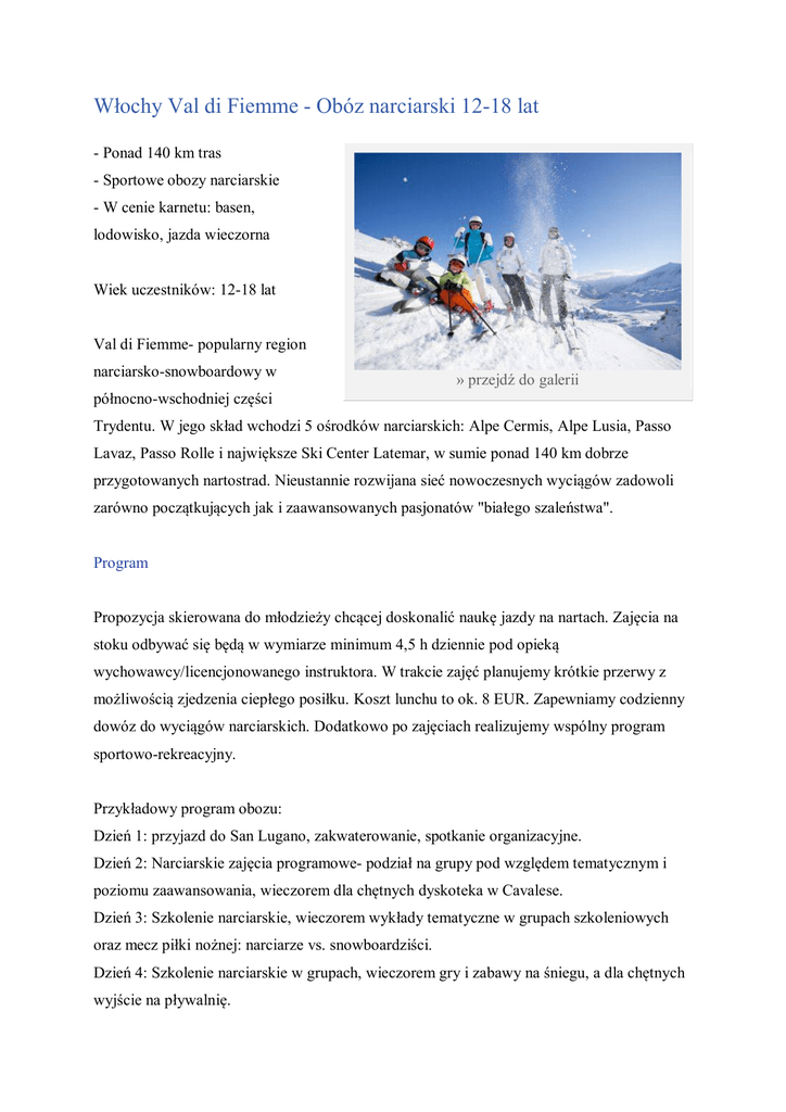Włochy Val di Fiemme - Obóz narciarski 12-18 lat - Ponad 140 km tras - Sportowe obozy narciarskie - W cenie karnetu: basen, lodowisko, jazda wieczorna Wiek uczestników: 12-18 lat Val di Fiemme- popularny region narciarsko-snowboardowy w » przejdź do galerii północno-wschodniej części Trydentu. W jego skład wchodzi 5 ośrodków narciarskich: Alpe Cermis, Alpe Lusia, Passo Lavaz, Passo Rolle i największe Ski Center Latemar, w sumie ponad 140 km dobrze przygotowanych nartostrad. Nieustannie rozwijana sieć nowoczesnych wyciągów zadowoli zarówno początkujących jak i zaawansowanych pasjonatów "białego szaleństwa". Program Propozycja skierowana do młodzieży chcącej doskonalić naukę jazdy na nartach. Zajęcia na stoku odbywać się będą w wymiarze minimum 4,5 h dziennie pod opieką wychowawcy/licencjonowanego instruktora. W trakcie zajęć planujemy krótkie przerwy z możliwością zjedzenia ciepłego posiłku. Koszt lunchu to ok. 8 EUR. Zapewniamy codzienny dowóz do wyciągów narciarskich. Dodatkowo po zajęciach realizujemy wspólny program sportowo-rekreacyjny. Przykładowy program obozu: Dzień 1: przyjazd do San Lugano, zakwaterowanie, spotkanie organizacyjne. Dzień 2: Narciarskie zajęcia programowe- podział na grupy pod względem tematycznym i poziomu zaawansowania, wieczorem dla chętnych dyskoteka w Cavalese. Dzień 3: Szkolenie narciarskie, wieczorem wykłady tematyczne w grupach szkoleniowych oraz mecz piłki nożnej: narciarze vs. snowboardziści. Dzień 4: Szkolenie narciarskie w grupach, wieczorem gry i zabawy na śniegu, a dla chętnych wyjście na pływalnię. Dzień 5: Szkolenie narciarskie w grupach, wieczorem ABC serwisowania sprzętu oraz dla chętnych wyjście na łyżwy. Dzień 6: Szkolenie w grupach, wieczorem seans filmów narciarskich, a dla chętnych jazda wieczorna na nartach/snowboardzie. Dzień 7: Szkolenie narciarskie w grupach, podsumowanie zajęć, wieczorem mini igrzyska zimowe na śniegu z nagrodami. Dla chętnych wyjście do dyskoteki. Dzień 8: Po śniadaniu wyjazd do Polski. Program fakultatywny - dyskoteka w Cavalese - ok. 7 EUR, - koszt wypożyczenia łyżew - ok. 7 EUR, - wyprawa na Sella Rondę - ok. 25 EUR. Zakwaterowanie Hotel Piccolo *** w dolinie Val di Fiemme w miejscowości San Lugano. Pokoje 3-, 4-, 5osobowe z łazienką, telefonem i TV Sat. W hotelu restauracja, bar, narciarnia. Uwagi Obóz nie jest przeznaczony dla osób, które rozpoczynają naukę jazdy na nartach. W przypadku złych warunków pogodowych zajęcia programowe oraz uzupełniające mogą ulec modyfikacji. Na obóz należy zabrać ze sobą paszport/dowód osobisty, kaski ochronne,które są obowiązkowe poniżej 18 roku życia, stroje kąpielowe. Cena nie obejmuje napojów do obiadokolacji oraz dopłaty za transport z miast wyszczególnionych w planie podróży oraz kosztów karnetów. Świadczenia Zakwaterowanie: 7 noclegów. Wyżywienie: śniadania w formie bufetu, serwowane obiadokolacje. Pierwszy posiłek: obiadokolacja w dniu przyjazdu, ostatni posiłek: śniadanie w dniu wyjazdu. Transport: autokar turystyczny. Ubezpieczenie: Signal Iduna - SKI. Opieka wychowawcy/instruktora. Realizacja programu. Informacje praktyczne Cena karnetu: dzieci urodzone po 28.11.1999 r. - 144 EUR/6dni (PIOV01) i 164 EUR/6dni (PIOV02,03), a pozostali 206 EUR/6dni (PIOV01) i 234 EUR/6dni (PIOV02,03). Wypożyczenie sprzętu narciarskiego: 50-200 EUR/6dni. Sugerowane kieszonkowe: ok. 50 EUR (nie dotyczy kosztu karnetu i kaucji). Przy zakwaterowaniu pobierana jest kaucja 25 EUR zwracana w dniu wyjazdu, o ile nie zostały wyrządzone żadne szkody. Terminy i ceny Nr grupy Obóz narciarski 12-18 lat Data Cena 15.01 - 24.01 1749 zł 1599 zł Promocja (skrót: PICC_SKI) Cena ISIC Rezerwuj PIOV01 Plan podróży 1549 zł 10 dni kalkulator Rezerwuj PIOV02 29.01 - 07.02 1849 zł 1699 zł Promocja Plan podróży 1649 zł 10 dni kalkulator Rezerwuj PIOV03 12.02 - 21.02 1849 zł 1699 zł Promocja Plan podróży 1649 zł 10 dni kalkulator