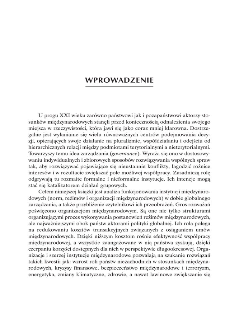 WPROWADZENIE U progu XXI wieku zarówno państwowi jak i pozapaństwowi aktorzy stosunków międzynarodowych stanęli przed koniecznością odnalezienia swojego miejsca w rzeczywistości, która jawi się jako coraz mniej klarowna. Dostrzegalne jest wyłanianie się wielu równoważnych centrów podejmowania decyzji, opierających swoje działanie na pluralizmie, współdziałaniu i odejściu od hierarchicznych relacji między podmiotami terytorialnymi a nieterytorialnymi. Towarzyszy temu idea zarządzania (governance). Wyraża się ono w dostosowywaniu indywidualnych i zbiorowych sposobów rozwiązywania wspólnych spraw tak, aby rozwiązywać pojawiające się nieustannie konflikty, łagodzić różnice interesów i w rezultacie zwiększać pole możliwej współpracy. Zasadniczą rolę odgrywają tu rozmaite formalne i nieformalne instytucje. Ich intencje mogą stać się katalizatorem działań grupowych. Celem niniejszej książki jest analiza funkcjonowania instytucji międzynarodowych (norm, reżimów i organizacji międzynarodowych) w dobie globalnego zarządzania, a także przybliżenie czytelnikowi ich przeobrażeń. Gros rozważań poświęcono organizacjom międzynarodowym. Są one nie tylko strukturami organizującymi proces wykonywania postanowień reżimów międzynarodowych, ale najważniejszymi obok państw aktorami polityki globalnej. Ich rola polega na redukowaniu kosztów transakcyjnych związanych z osiąganiem umów międzynarodowych. Dzięki niższym kosztom rośnie efektywność współpracy międzynarodowej, a wszystkie zaangażowane w nią państwa zyskują, dzięki czerpaniu korzyści dostępnych dla nich w perspektywie długookresowej. Organizacje i szerzej instytucje międzynarodowe pozwalają na szukanie rozwiązań takich kwestii jak: wzrost roli państw niezachodnich w stosunkach międzynarodowych, kryzysy finansowe, bezpieczeństwo międzynarodowe i terroryzm, energetyka, zmiany klimatyczne, zdrowie, a nawet lawinowe zwiększanie się 12 Wprowadzenie liczby interakcji między państwami i ich obywatelami wywołane przez rewolucję w technologiach komunikacyjnych i pojawienie się cyberprzestrzeni. Na uwagę zasługuje fakt pojawiania się nowych struktur wykraczających poza charakterystykę organizacji międzynarodowych, takich jak fora czy też kluby współpracy międzynarodowej. Wskazuje to na dynamiczny rozwój globalnych sieci powiązań, które odgrywają zasadniczą rolę w tworzeniu, rozwijaniu, dyfuzji i implementacji rozmaitych norm, zasad i regulacji obejmujących coraz to nowe dziedziny począwszy od nadzoru bankowego a skończywszy na polityce ochrony zdrowia. Przykładem centrum globalnej struktury sieciowej będącego forum dialogu między państwami a podmiotami niepaństwowymi w zakresie globalnego zarządzania (global governance), jest grupa dwudziestu (G20). W sieci G20 znajdują się nie tylko państwa ale również ważne instytucje międzynarodowe – Międzynarodowy Fundusz Walutowy, G8, Organizacja Współpracy Islamskiej czy Szanghajska Organizacja Współpracy. Dążąc do osiągniecia celu badawczego autorzy nie tylko skupili się na genezie, ewolucji, podstawach prawnych, strukturze, misji, zasadach, środkach funkcjonowania i celach charakteryzowanych struktur, ale próbując wyjść poza deskrypcję, czyli opis tego jaka była i jaka jest obecnie rzeczywistość, w której przyszło funkcjonować instytucjom międzynarodowym, dążyli do realizacji szeregu innych funkcji badawczych. Skupiając się na realizacji funkcji eksplanacyjnej, a więc pytając o przyczyny zaistnienia danego zjawiska i jego skutki zarówno w wymiarze regionalnym jak również globalnym, podjęli trud wyjaśniania m.in. istoty globalnego zarządzania i zjawiska instytucjonalizacji stosunków międzynarodowych, przy uwzględnieniu odmiennych ujęć teoretycznych, zanalizowali stanowisko i działalność Organizacji Współpracy Islamskiej w odniesieniu do stosunkowo nowych, pojawiających się kwestii takich jak konflikt w Syrii czy pojawienie się Państwa Islamskiego, dokonali oglądu „miękkiego wymiaru zarządzania” na przykładzie oddziaływania OECD na funkcjonowanie przedsiębiorstw międzynarodowych a także podjęli temat wpływu działań podejmowanych przez WTO na bezpieczeństwo żywnościowe i regulację cen towarów rolnospożywczych. Realizując funkcję prognostyczną szukali odpowiedzi na pytanie o to, w jaki sposób wybrane instytucje będą wpływać na rzeczywistość międzynarodową w przyszłości. Wskazano m.in. ma scenariusze relacji między G8 i G20 – dwoma głównymi forami zachodzenia globalnego zarządzania, a także określono uwarunkowania i perspektywy rozwoju Organizacji Narodów Zjednoczonych. Wiele uwagi poświęcono też poszukiwaniu odpowiedzi na pytania związane z doborem najwłaściwszych środków osiągnięcia zamierzonych rezulta- Wprowadzenie 13 tów. Pytając: na ile reforma systemu głosów ważonych w MFW może zwiększyć jej efektywność w walce z kryzysami finansowymi? czy Bank Światowy adekwatnie alokuje środki na rozwój państw biednych? czy regionalne i globalne szczyty liderów są skuteczniejszą metodą zarządzania globalnymi dobrami publicznymi od tzw. „twardego prawa”?, starano się uwypuklić funkcję instrumentalną, która w politologii i nauce o stosunkach międzynarodowych łączy się z procesem decydowania politycznego, w szczególności zapewniania efektywności podejmowanych decyzji. Niemałą rolę odgrywają tutaj liderzy – ich doświadczenie, autorytet (bądź jego brak), poglądy i przekonania, wyznawany system wartości, słowem wielość cech składających się na osobowość każdego z przywódców. Tak sformułowany cel pracy jak i wzgląd na realizację funkcji poznawczej wpłynęły na specyfikę konstrukcyjną każdego z rozdziałów. Pod względem przedmiotowym skupiono się na najistotniejszych instytucjach globalnego zarządzania, począwszy od jego polit