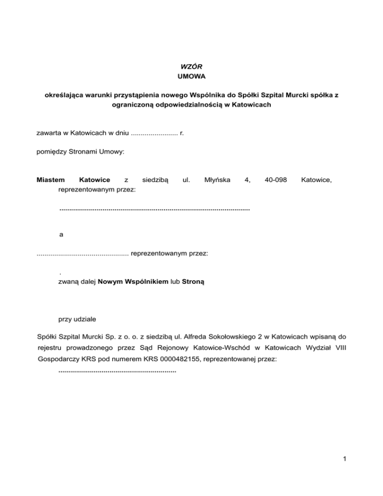 WZÓR UMOWA określająca warunki przystąpienia nowego Wspólnika do Spółki Szpital Murcki spółka z ograniczoną odpowiedzialnością w Katowicach zawarta w Katowicach w dniu ........................ r. pomiędzy Stronami Umowy: Miastem Katowice z siedzibą reprezentowanym przez: ul. Młyńska 4, 40-098 Katowice, ................................................................................................. a ............................................... reprezentowanym przez: . zwaną dalej Nowym Wspólnikiem lub Stroną przy udziale Spółki Szpital Murcki Sp. z o. o. z siedzibą ul. Alfreda Sokołowskiego 2 w Katowicach wpisaną do rejestru prowadzonego przez Sąd Rejonowy Katowice-Wschód w Katowicach Wydział VIII Gospodarczy KRS pod numerem KRS 0000482155, reprezentowanej przez: ............................................................ 1 Dział I Słowniczek Umowy Miasto: miasto Katowice - gmina mająca status miasta na prawach powiatu lub jego odpowiednie organy to jest Prezydent Miasta Katowice lub Rada Miasta Katowice Rada: Rada Miasta Katowice Prezydent: Prezydent Miasta Katowice Nowy Wspólnik: podmiot wybrany w drodze postępowania ofertowego, z którym Miasto Katowice zawrze niniejszą umowę Spółka / Szpital: Spółka Szpital Murcki spółka z ograniczoną odpowiedzialnością w Katowicach, którego jedynym wspólnikiem jest Miasto o kapitale zakładowym 17.437.000,00 złotych. Działalność lecznicza Spółki: działalność prowadzona przez Szpital w następującym zakresie: 1. oddział chirurgii ogólnej, 2. oddział chirurgii urazowo-ortopedycznej, 3. oddział internistyczny, 4. oddział neurologiczny, 5. oddział rehabilitacji, 6. oddział rehabilitacji neurologicznej, 7. oddział rehabilitacji kardiologicznej, 8. oddział reumatologiczny, 9. izba przyjęć, 10. blok operacyjny, 11. poradnia podstawowej opieki zdrowotnej, 12. ambulatoryjna opieka specjalistyczna: a) poradnia chirurgii ogólnej, b) poradnia chirurgii urazowo-ortopedycznej, c) poradnia reumatologii, d) poradnia neurologii, e) poradnia rehabilitacyjna, 13. poradnia medycyny pracy, 14. dział rehabilitacji, 15. zakład pielęgnacyjno-opiekuńczy. Ustawa: ustawa z dnia 15 kwietnia 2011r. o działalności leczniczej (Dz. U. 2015 r. poz. 618 j.t.) 2 Inwestycja: ogół przedsięwzięć o charakterze inwestycyjnym w nieruchomości Spółki oraz infrastrukturę i wyposażenie Szpitala i służących działalności leczniczej, do których realizacji Nowy Wspólnik zobowiązał się w ofercie złożonej w postępowaniu ofertowym; o podanej w ofercie łącznej wartości ............. (w złotych) i czasie realizacji ......................(w miesiącach), przy spełnieniu wymagań dotyczących utrzymania dotychczasowej liczby łóżek na poziomie 184, z uwzględnieniem wymagań wynikających z rozporządzenia z dnia 26 czerwca 2012 r. w sprawie szczegółowych wymagań, jakim powinny odpowiadać pomieszczenia i urządzenia podmiotu wykonującego działalność leczniczą. Publiczne postępowanie ofertowe: postępowanie, w ramach którego należało złożyć oferty, które podlegały ocenie przez Komisję ofertową powołaną przez Prezydenta Miasta Katowice. Celem postępowania ofertowego była ocena i wybór oferty w celu zawarcia Umowy określającej warunki przystąpienia nowego Wspólnika (Wspólników) do Spółki. Oferta: oferta złożona i wybrana w ramach postępowania ofertowego stanowiąca załącznik Nr 1 do niniejszej Umowy. Nieruchomości Spółki: nieruchomości stanowiące własność Spółki położone w Katowicach przy ul. Alfreda Sokołowskiego składające się z działek oznaczonych numerami: 211/66, 204/70, 231/160, 212/66, 205/70, 255/160, 213/66, 253/72, 256/160, 217/66, 232/73, 238/73, 875/66, 182/160, 228/59, 183/160, 229/60, 65, 64, 181/160, 230/160,78/17, 79/17 na kartach mapy 19 i 20 o powierzchni łącznej 5,2291 ha objęte księgą wieczystą prowadzoną przez Sąd Rejonowy Katowice-Wschód w Katowicach Wydział XI Ksiąg Wieczystych o numerze KA1K/00064887/9. Dział II Cel Umowy, Oświadczenia Stron §1 1. Celem niniejszej Umowy jest określenie warunków przystąpienia Nowego Wspólnika do Spółki oraz realizacja Oferty złożonej przez Nowego Wspólnika w publicznym postępowaniu ofertowym. 3 2. Zamiar Stron niniejszej Umowy obejmuje: a) przystąpienie przez Nowego Wspólnika do Spółki w ciągu 60 dni od daty zawarcia niniejszej Umowy oraz objęcie udziałów w podwyższonym kapitale tej Spółki za wkład pieniężny w wysokości .............................. złotych; b) kontynuację działalności leczniczej Spółki przez okres co najmniej 5 lat biorąc pod uwagę zakres i termin dostosowania istniejącej infrastruktury Szpitala do obowiązujących przepisów; c) realizację Inwestycji wskazanej w Ofercie złożonej przez Nowego Wspólnika w zakresie rozwoju działalności Szpitala; d) terminową realizację przez Nowego Wspólnika zobowiązań wynikających z Oferty; e) po zakończeniu realizacji zobowiązań wynikających z Oferty – przedłożenie przez Nowego Wspólnika sprawozdania, o którym mowa w § 6 ust. 2 niniejszej Umowy. §2 Miasto oświadcza, że: 1. jest jedynym wspólnikiem Spółki, 2. wyraża gotowość podjęcia wszelkich działań umożliwiających Nowemu Wspólnikowi przystąpienie do Spółki na warunkach wynikających z niniejszej Umowy. §3 Nowy Wspólnik oświadcza, że: 1. jest podmiotem krajowym, wpisanym do rejestru .........................; 2. zawarcie i wykonanie niniejszej Umowy mieści się w zakresie uprawnień i w przedmiocie działalności Nowego Wspólnika; 3. uzyskał wszelkie zgody i zezwolenia niezbędne do właściwego zawarcia i wykonania niniejszej Umowy, w tym zgody organów Nowego Wspólnika (Rady Nadzorczej, Zgromadzenia Wspólników/Walnego Zgromadzenia); 4. znajduje się w sytuacji ekonomicznej i finansowej pozwalającej na wykonanie niniejszej Umowy; 5. wobec Nowego Wspólnika, ani żadnego składnika jego maj