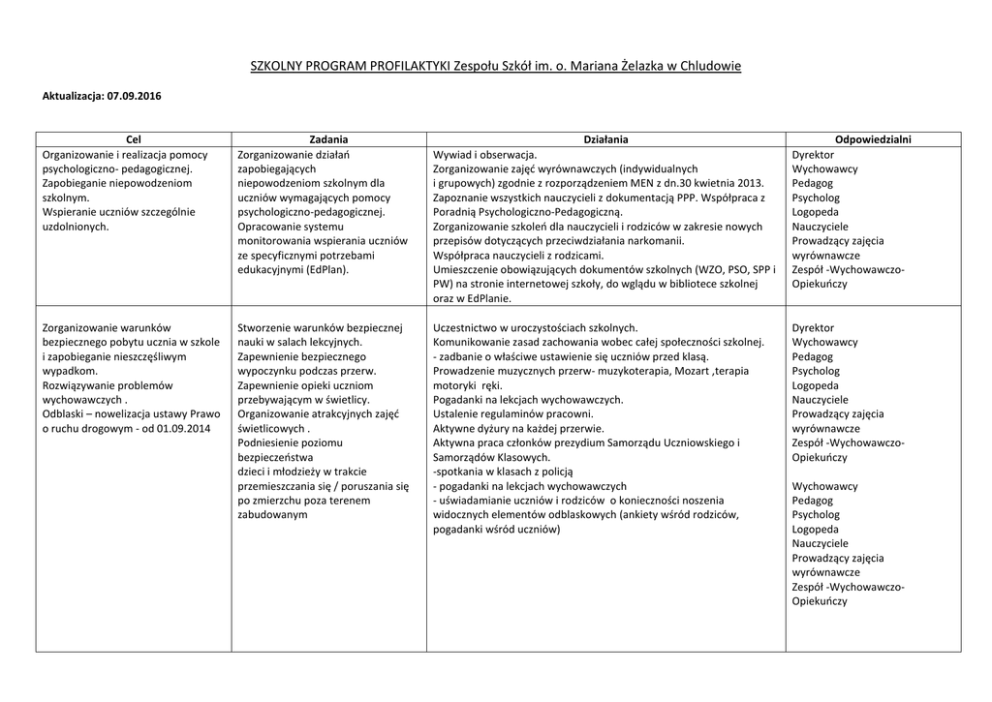 SZKOLNY PROGRAM PROFILAKTYKI Zespołu Szkół im. o. Mariana Żelazka w Chludowie Aktualizacja: 07.09.2016 Cel Organizowanie i realizacja pomocy psychologiczno- pedagogicznej. Zapobieganie niepowodzeniom szkolnym. Wspieranie uczniów szczególnie uzdolnionych. Zadania Zorganizowanie działań zapobiegających niepowodzeniom szkolnym dla uczniów wymagających pomocy psychologiczno-pedagogicznej. Opracowanie systemu monitorowania wspierania uczniów ze specyficznymi potrzebami edukacyjnymi (EdPlan). Działania Wywiad i obserwacja. Zorganizowanie zajęć wyrównawczych (indywidualnych i grupowych) zgodnie z rozporządzeniem MEN z dn.30 kwietnia 2013. Zapoznanie wszystkich nauczycieli z dokumentacją PPP. Współpraca z Poradnią Psychologiczno-Pedagogiczną. Zorganizowanie szkoleń dla nauczycieli i rodziców w zakresie nowych przepisów dotyczących przeciwdziałania narkomanii. Współpraca nauczycieli z rodzicami. Umieszczenie obowiązujących dokumentów szkolnych (WZO, PSO, SPP i PW) na stronie internetowej szkoły, do wglądu w bibliotece szkolnej oraz w EdPlanie. Odpowiedzialni Dyrektor Wychowawcy Pedagog Psycholog Logopeda Nauczyciele Prowadzący zajęcia wyrównawcze Zespół -WychowawczoOpiekuńczy Zorganizowanie warunków bezpiecznego pobytu ucznia w szkole i zapobieganie nieszczęśliwym wypadkom. Rozwiązywanie problemów wychowawczych . Odblaski – nowelizacja ustawy Prawo o ruchu drogowym - od 01.09.2014 Stworzenie warunków bezpiecznej nauki w salach lekcyjnych. Zapewnienie bezpiecznego wypoczynku podczas przerw. Zapewnienie opieki uczniom przebywającym w świetlicy. Organizowanie atrakcyjnych zajęć świetlicowych . Podniesienie poziomu bezpieczeństwa dzieci i młodzieży w trakcie przemieszczania się / poruszania się po zmierzchu poza terenem zabudowanym Uczestnictwo w uroczystościach szkolnych. Komunikowanie zasad zachowania wobec całej społeczności szkolnej. - zadbanie o właściwe ustawienie się uczniów przed klasą. Prowadzenie muzycznych przerw- muzykoterapia, Mozart ,terapia motoryki ręki. Pogadanki na lekcjach wychowawczych. Ustalenie regulaminów pracowni. Aktywne dyżury na każdej przerwie. Aktywna praca członków prezydium Samorządu Uczniowskiego i Samorządów Klasowych. -spotkania w klasach z policją - pogadanki na lekcjach wychowawczych - uświadamianie uczniów i rodziców o konieczności noszenia widocznych elementów odblaskowych (ankiety wśród rodziców, pogadanki wśród uczniów) Dyrektor Wychowawcy Pedagog Psycholog Logopeda Nauczyciele Prowadzący zajęcia wyrównawcze Zespół -WychowawczoOpiekuńczy Wychowawcy Pedagog Psycholog Logopeda Nauczyciele Prowadzący zajęcia wyrównawcze Zespół -WychowawczoOpiekuńczy Tworzenie atmosfery kształcenia człowieka świadomie wybierającego drogę życia zgodną z normami społecznymi. Podniesienie poziomu edukacji kulturalnej i sportowej poprzez stwarzanie warunków do poznawania i rozwijania talentów. Inicjowanie i propagowanie postaw altruistycznych. Inicjowanie działań związanych z planowaniem przyszłości zawodowej. Opracowanie wewnątrzszkolnego Programu Doradztwa Zawodowego w Gimnazjum. Warsztaty pedagogiczne i psychologiczne. Warsztaty doradztwa zawodowego. Realizacja, Programu Doradztwa Zawodowego w Gimnazjum. Programy rozwijające talenty. Prezentacja osiągnięć uczniów (projekty edukacyjne, wystawy prac dzieci). Indywidualna praca z uczniem zdolnym, uwzględnienie w programach dydaktyczno – wychowawczych klas programów wyzwalających aktywność twórczą uczniów. Współpraca z organizacjami działającymi w środowisku lokalnym. Indywidualna praca z uczniem ze specyficznymi potrzebami edukacyjnymi. Wycieczki, konkursy. Współpraca z organizacjami pomagającymi potrzebującym (CARITAS, REDEMPTORIS MISSIO) Dyrektor Wychowawcy Pedagog Psycholog Logopeda Nauczyciele Prowadzący zajęcia wyrównawcze Zespół -WychowawczoOpiekuńczy Tworzenie pozytywnej atmosfery do uczenia się i przebywania w szkole. Zapobieganie niepowodzeniom życiowym, redukowanie lęku, walka ze stresem. Motywowanie do podejmowania wysiłku i odnoszenia sukcesów. Realizacja programu rozwoju kompetencji informatycznych w klasach 1-3. Działania nauczycieli sprzyjające kształtowaniu właściwych postaw uczniów. Warsztaty ( np. jak opanować stres, jak radzić sobie z porażką i niepowodzeniem, jak podnosić poczucie własnej wartości, czy warto podejmować ryzyko). Udział w konkursach tematycznych. Dyrektor Wychowawcy Pedagog Psycholog Nauczyciele Prowadzący zajęcia wyrównawcze Zespół -WychowawczoOpiekuńczy Przybliżenie problemów i zagrożeń dzisiejszego świata i wyposażenie uczniów w mechanizmy pozwalające dokonywać właściwych wyborów żywieniowych. Zorganizowanie działań zapobiegających uzależnianiu się dzieci i młodzieży od Internetu i świata wirtualnego. Uświadamianie dzieciom i młodzieży realnych zagrożeń wynikających z bezkrytycznego i bezrefleksyjnego przyjmowania wszystkich treści występujących w Internecie. Działania sprzyjające rozwijaniu sprawności fizycznej uczniów Warsztaty z psychologiem i pedagogiem. Tematyczne lekcje wychowawcze. Realizacja zmodyfikowanego programu Godzin do dyspozycji wychowawcy. Rozwijanie kompetencji informatycznych dzieci i młodzieży. Kształtowanie postaw. Wychowanie do wartości. Zapobieganie chorobom cywilizacyjnym. Przybliżenie wychowawcom, uczniom i rodzicom tematyki zaburzeń odżywiania wśród dzieci. Zapobieganie uzależnieniu od Internetu, telefonów komórkowych. Zapobieganie niebezpieczeństwom grożącym w Internecie. Zajęcia warsztatowe, konkursy. Tworzenie aplikacji internetowych służących tworzeniu kart pracy przez uczniów i nauczycieli. Szkolenie dla nauczycieli. Dyrektor Wychowawcy. Nauczyciele WF Psycholog Pedagog Przybliżenie wychowawcom, uczniom i rodzicom tematyki uzależnień. Przygotowanie i przedstawienie uczniom zajęć profilaktycznych poświęconych zagrożeniom związanych ze śr