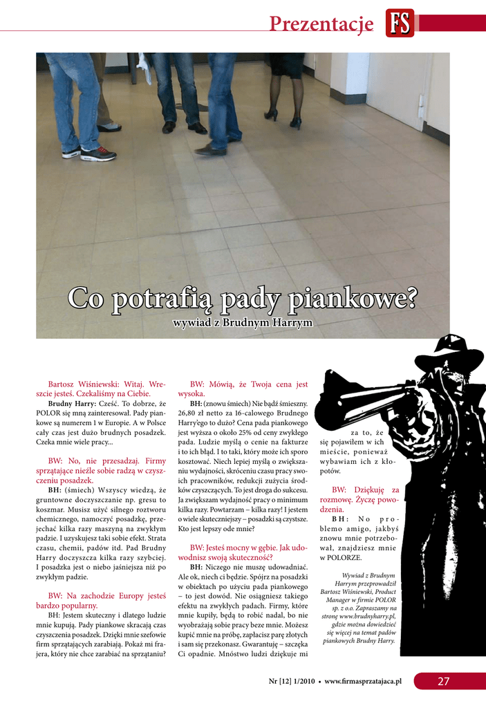 Prezentacje Co potrafią pady piankowe? wywiad z Brudnym Harrym Bartosz Wiśniewski: Witaj. Wreszcie jesteś. Czekaliśmy na Ciebie. Brudny Harry: Cześć. To dobrze, że POLOR się mną zainteresował. Pady piankowe są numerem 1 w Europie. A w Polsce cały czas jest dużo brudnych posadzek. Czeka mnie wiele pracy... BW: No, nie przesadzaj. Firmy sprzątające nieźle sobie radzą w czyszczeniu posadzek. BH: (śmiech) Wszyscy wiedzą, że gruntowne doczyszczanie np. gresu to koszmar. Musisz użyć silnego roztworu chemicznego, namoczyć posadzkę, przejechać kilka razy maszyną na zwykłym padzie. I uzyskujesz taki sobie efekt. Strata czasu, chemii, padów itd. Pad Brudny Harry doczyszcza kilka razy szybciej. I posadzka jest o niebo jaśniejsza niż po zwykłym padzie. BW: Na zachodzie Europy jesteś bardzo popularny. BH: Jestem skuteczny i dlatego ludzie mnie kupują. Pady piankowe skracają czas czyszczenia posadzek. Dzięki mnie szefowie firm sprzątających zarabiają. Pokaż mi frajera, który nie chce zarabiać na sprzątaniu? BW: Mówią, że Twoja cena jest wysoka. BH: (znowu śmiech) Nie bądź śmieszny. 26,80 zł netto za 16-calowego Brudnego Harry’ego to dużo? Cena pada piankowego jest wyższa o około 25% od ceny zwykłego pada. Ludzie myślą o cenie na fakturze i to ich błąd. I to taki, który może ich sporo kosztować. Niech lepiej myślą o zwiększaniu wydajności, skróceniu czasu pracy swoich pracowników, redukcji zużycia środków czyszczących. To jest droga do sukcesu. Ja zwiększam wydajność pracy o minimum kilka razy. Powtarzam − kilka razy! I jestem o wiele skuteczniejszy − posadzki są czystsze. Kto jest lepszy ode mnie? BW: Jesteś mocny w gębie. Jak udowodnisz swoją skuteczność? BH: Niczego nie muszę udowadniać. Ale ok, niech ci będzie. Spójrz na posadzki w obiektach po użyciu pada piankowego − to jest dowód. Nie osiągniesz takiego efektu na zwykłych padach. Firmy, które mnie kupiły, będą to robić nadal, bo nie wyobrażają sobie pracy beze mnie. Możesz kupić mnie na próbę, zapłacisz parę złotych i sam się przekonasz. Gwarantuję − szczęka Ci opadnie. Mnóstwo ludzi dziękuje mi za to, że się pojawiłem w ich mieście, ponieważ wybawiam ich z kłopotów. BW: Dziękuję za rozmowę. Życzę powodzenia. BH: No problemo amigo, ja kbyś znowu mnie potrzebował, znajdziesz mnie w POLORZE. Wywiad z Brudnym Harrym przeprowadził Bartosz Wiśniewski, Product Manager w firmie POLOR sp. z o.o. Zapraszamy na stronę www.brudnyharry.pl, gdzie można dowiedzieć się więcej na temat padów piankowych Brudny Harry. Nr [12] 1/2010 • www.firmasprzatajaca.pl 27
