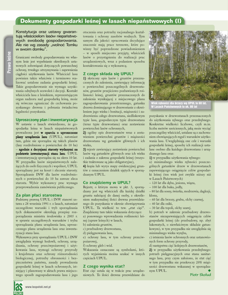 Konstytucja oraz ustawy gwarantujà w∏aÊcicielom lasów niepaƒstwowych swobod´ gospodarowania. Ale nie wg zasady „wolnoç Tomku w swoim domku”. Granicami swobody gospodarowania we w∏asnym lesie jest wype∏nianie okreÊlonych ustawowych zobowiàzaƒ dotyczàcych powszechnej ochrony, trwa∏ego utrzymywania i zapewnienia ciàg∏oÊci u˝ytkowania lasów. W∏aÊciciel lasu powinien tak˝e w∏aÊciwie i terminowo realizowaç ustalone zadania gospodarki leÊnej. Takie gospodarowanie nie wymaga uzyskiwania odr´bnych zezwoleƒ i decyzji. Kontakt w∏aÊciciela lasu z leÊnikiem, reprezentujàcym organ nadzoru nad gospodarkà leÊnà, mo˝e si´ wówczas ograniczaç do cechowania pozyskanego drewna i pobrania Êwiadectwa legalnoÊci pozyskania. Uproszczony plan i inwentaryzacja W ustawie o lasach stwierdzono, ˝e gospodarka leÊna w lasach niepaƒstwowych prowadzona jest w oparciu o uproszczone plany urzàdzenia lasu (UPUL), natomiast tam, gdzie nie sporzàdza si´ takich planów (lasy rozdrobnione o powierzchni do 10 ha) – zgodnie z decyzjami starosty wydanymi na podstawie inwentaryzacji stanu lasu. UPUL i inwentaryzacj´ sporzàdza si´ na okres 10 lat. W przypadku lasów niepaƒstwowych nale˝àcych do osób fizycznych i wspólnot, UPUL sporzàdzany jest na koszt i zlecenie starosty. Sporzàdzanie INW dla lasów rozdrobnionych o powierzchni do 10 ha zawsze zleca starosta. Wybór wykonawcy prac wymaga przeprowadzenia zamówienia publicznego. Za plan p∏aci starostwa Podstaw´ prawnà UPUL i INW stanowi ustawa z 28 wrzeÊnia 1991 r. o lasach, natomiast szczegó∏owe warunki i tryb sporzàdzania tych dokumentów okreÊlajà przepisy rozporzàdzenia ministra Êrodowiska z 2005 r. w sprawie szczegó∏owych warunków i trybu sporzàdzania planu urzàdzenia lasu, uproszczonego planu urzàdzenia lasu oraz inwentaryzacji stanu lasu. Wykonawca przy sporzàdzaniu UPUL i INW uwzgl´dnia wymogi hodowli, ochrony, urzàdzania, ochrony przeciwpo˝arowej i u˝ytkowania lasu, wymogi ochrony przyrody i krajobrazu oraz ochrony ró˝norodnoÊci biologicznej, potrzeby obronnoÊci i bezpieczeƒstwa paƒstwa, zasady prowadzenia gospodarki leÊnej w lasach ochronnych, istniejàcy i planowany w aktach prawa miejscowego sposób zagospodarowania lasu i jego otoczenia oraz potrzeby racjonalnego kszta∏towania i ochrony zasobów wodnych. Tym samym dla jakoÊci opracowania decydujàce znaczenie majà prace terenowe, które powinny byç poprzedzone powiadomieniem – w sposób miejscowo przyj´ty, w∏aÊcicieli lasów o przystàpieniu do realizacji prac urzàdzeniowych, wraz z podaniem sposobu kontaktowania si´ z wykonawcà. Z czego sk∏ada si´ UPUL? 1) skrócony opis lasów i gruntów przeznaczonych do zalesienia, zawierajàcy informacj´ o powierzchni poszczególnych drzewostanów, gruntów przejÊciowo pozbawionych roÊlinnoÊci leÊnej, gruntów przeznaczonych do zalesienia wynikajàcej z miejscowego planu zagospodarowania przestrzennego, gatunku drzewa dominujàcego w drzewostanie z okreÊleniem jego wieku i bonitacji, mià˝szoÊci i zadrzewieniu ca∏ego drzewostanu, siedliskowym typie lasu, gospodarczym typie drzewostanu (teraz typie drzewostanu) oraz zestawienie powierzchni lasów ochronnych, 2) ogólny opis drzewostanów wraz z zestawieniem powierzchni gruntów i mià˝szoÊci drzewostanu wg gatunków g∏ównych i ich wieku, 3) rejestr zawierajàcy zestawienie powierzchni lasów wg gatunków g∏ównych oraz ich wieku i zadania z zakresu gospodarki leÊnej (wszystkie traktowane sà jako obligatoryjne), 4) kopia lub wyrys mapy ewidencyjnej gruntów z oznaczeniem dzia∏ek uj´tych w sporzàdzanym UPUL. Co znajdziemy w UPUL? Rejestr, o którym mowa w pkt. 3, sporzàdzany jest wg w∏aÊcicieli dla ka˝dej dzia∏ki gruntu nale˝àcej do danej osoby, z okreÊleniem maksymalnej iloÊci drewna przewidzianego do pozyskania w okresie obowiàzywania UPUL. Ta wielkoÊç to tzw. „etat ci´ç”. Znajdziemy tam tak˝e wskazania dotyczàce: a) ponownego wprowadzenia roÊlinnoÊci leÊnej (upraw leÊnych) w lasach, b) zalesienia gruntów, c) przebudowy drzewostanu, d) piel´gnowania lasu, e) ochrony lasu, w tym ochrony przeciwpo˝arowej, f) ochrony gleb i wód. Wskazania oznaczane sà symbolami, których wyjaÊnienia mo˝na szukaç w innych cz´Êciach UPUL. Z czego wynika etat? Etat ci´ç ustala si´ w trakcie prac urzàdzeniowych. To iloÊci drewna przewidziane do Fot. RaZ Prawo leÊne Dokumenty gospodarki leÊnej w lasach niepaƒstwowych (I) Wiek r´bnoÊci dla brzozy wg UPUL to 60 lat. W Lasach Paƒstwowych to ok. 80 lat pozyskania w drzewostanach przeznaczonych do u˝ytkowania r´bnego oraz przedr´bnego. Konkretne wielkoÊci liczbowe, czyli m.in. liczba metrów szeÊciennych, jakà mo˝e wyciàç poszczególny w∏aÊciciel, ustalane sà z zachowaniem obowiàzujàcych regu∏ i warunków u˝ytkowania lasu. Uwzgl´dniajà one cele i warunki gospodarki leÊnej, sposoby ich realizacji ustalane osobno dla ka˝dego drzewostanu i urzàdzanego lasu oraz: 1) w przypadku u˝ytkowania r´bnego: a) minimalnego wieku r´bnoÊci poszczególnych gatunków drzew w drzewostanach zapewniajàcego osiàgni´cie celów gospodarki leÊnej (ten wiek jest zwykle ni˝szy ni˝ w Lasach Paƒstwowych) – 120 lat dla d´bu, jesionu, wiàzu, – 100 lat dla buka, jod∏y, – 80 lat dla sosny, Êwierka, modrzewia, daglezji, klonu, – 60 lat dla brzozy, grabu, olchy czarnej, – 40 lat dla osiki, – 30 lat dla topoli, olchy szarej. b) potrzeb w zakresie przebudowy drzewostanów niezapewniajàcych osiàgni´cia celów gospodarki leÊnej (do przebudowy, np. zbyt lukowatych, o niew∏aÊciwym sk∏adzie gatunkowym), w tym przypadku nie uwzgl´dnia si´ minimalnego wieku wyr´bu, c) istnienia lasów ochronnych oraz ustanowionych form ochrony przyrody, d) nast´pstwa ci´ç kolejnych drzewostanów, 2) w przypadku u˝ytkowania przedr´bnego: potrzeb piel´gnacyjnych oraz stanu sanitarnego lasu, przy czym za∏o˝ono, ˝e et