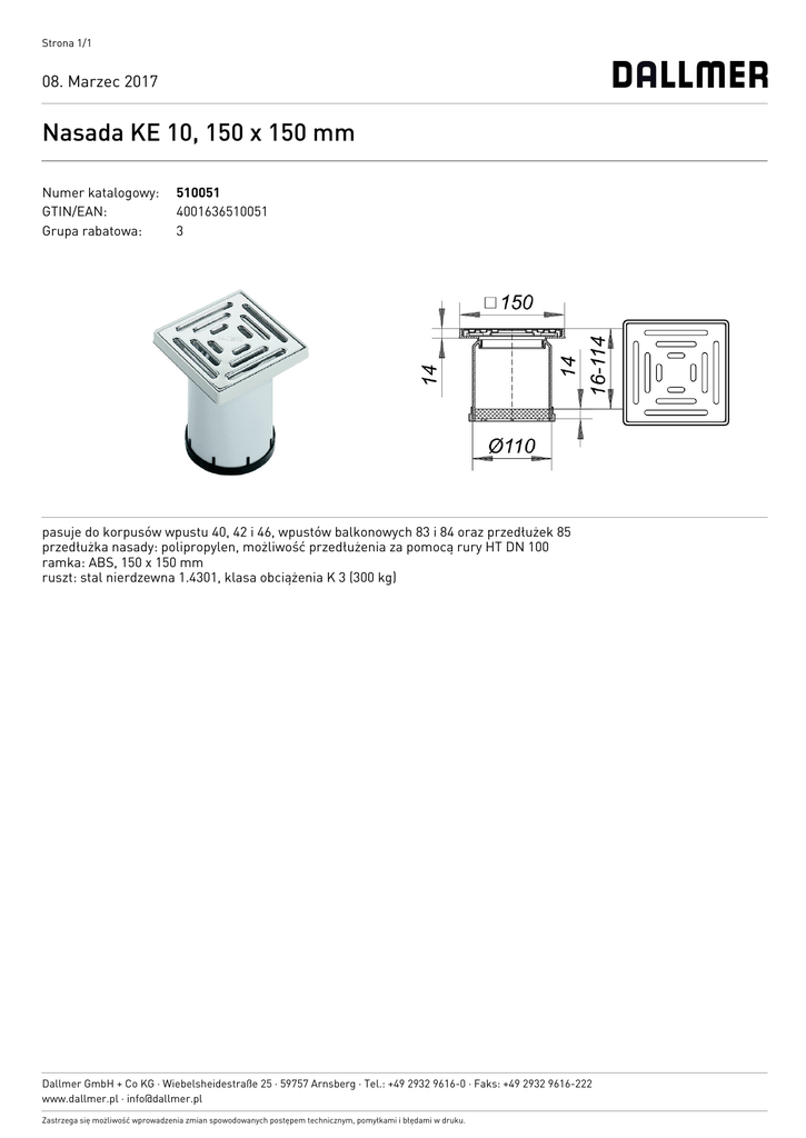 Strona 1/1 08. Marzec 2017 Nasada KE 10, 150 x 150 mm Numer katalogowy: GTIN/EAN: Grupa rabatowa: 510051 4001636510051 3 pasuje do korpusów wpustu 40, 42 i 46, wpustów balkonowych 83 i 84 oraz przedłużek 85 przedłużka nasady: polipropylen, możliwość przedłużenia za pomocą rury HT DN 100 ramka: ABS, 150 x 150 mm ruszt: stal nierdzewna 1.4301, klasa obciążenia K 3 (300 kg) Dallmer GmbH + Co KG · Wiebelsheidestraße 25 · 59757 Arnsberg · Tel.: +49 2932 9616-0 · Faks: +49 2932 9616-222 www.dallmer.pl · [email protected] Zastrzega się możliwość wprowadzenia zmian spowodowanych postępem technicznym, pomyłkami i błędami w druku.