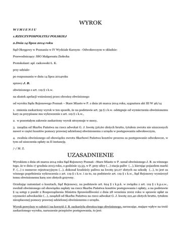 WYROK WIMIENIU 1.RZECZYPOSPOLITEJ POLSKIEJ 2.Dnia 14 lipca 2014 roku Sąd Okręgowy w Poznaniu w IV Wydziale Karnym - Odwoławczym w składzie: Przewodniczący: SSO Małgorzata Ziołecka Protokolant: apl. radcowski Ł. K. przy udzialepo rozpoznaniu w dniu 14 lipca 2014roku sprawy J. B. obwinionego z art. 119 § 1 k.w. na skutek apelacji wniesionej przez obrońcę obwinionego od wyroku Sądu Rejonowego Poznań – Stare Miasto w P. z dnia 26 marca 2014 roku, sygnatura akt III W 46/14 1. zmienia zaskarżony wyrok w ten sposób, że na podstawie art. 39 § 1 k.w. odstępuje od wymierzenia obwinionemu kary za przypisane mu wykroczenie z art. 119 § 1 k.w., 2. w pozostałym zakresie zaskarżony wyrok utrzymuje w mocy, 3. zasądza od Skarbu Państwa na rzecz adwokat G. J. kwotę 516,60 złotych brutto, tytułem zwrotu nie uiszczonych nawet w części kosztów pomocy prawnej udzielonej obwinionemu z urzędu w postępowaniu odwoławczym, 4. zwalnia obwinionego od obowiązku zwrotu Skarbowi Państwa kosztów procesu za postępowanie odwoławcze, w tym od uiszczenia opłaty za II instancję. /-/ M. Z. UZASADNIENIE Wyrokiem z dnia 26 marca 2014 roku Sąd Rejonowy Poznań –Stare Miasto w P. uznał obwinionego J. B. za winnego tego, że w dniu 17 grudnia 2013 roku, o godzinie 13.53, w P. przy ulicy (...) stacja paliw (...), kierując pojazdem marki F. (...) o numerze rejestracyjnym (...), dokonał kradzieży paliwa na kwotę 50,07 złotych na szkodę (...), to jest za winnego popełnienia wykroczenia z art. 119 § 1 k.w. i za to, na podstawie art. 119 § 1 k.w., Sąd Rejonowy wymierzył temu obwinionemu karę 100 złotych grzywny. Orzekając natomiast o kosztach, Sąd Rejonowy, na podstawie art. 624 § 1 k.p.k. w związku z art. 119 § 1 k.p.s.w., zwolnił obwinionego od obowiązku zapłaty na rzecz Skarbu Państwa kosztów postępowania i opłaty, a na podstawie § 14 ustęp 2 punkt 2 Rozporządzenia Ministra Sprawiedliwości z dnia 28 września 2002 roku w sprawie opłat za czynności adwokackie (…), zasądził od Skarbu Państwa na rzecz adwokat G. J. kwotę 221,40 złotych brutto, tytułem nieopłaconej pomocy prawnej udzielonej obwinionemu z urzędu. Wyrok powyższy w całości i na korzyść J. B. zaskarżyła obrońca tego obwinionego, zarzucając, mające wpływ na treść zaskarżonego wyroku, naruszenie przepisów postępowania, to jest: - art. 7 k.p.k., w związku z art. 8 k.p.s.w. w związku z art. 410 k.p.k. w związku z art. 82 k.p.s.w. poprzez naruszenie zasady swobodnej oceny dowodów i dokonanie tej oceny w sposób dowolny, w szczególności poprzez wydanie rozstrzygnięcia w oparciu o dowody, które nie pozwalały na prawidłowe ustalenie stanu faktycznego, w szczególności na błędnym uznaniu za jedynie w części wiarygodne wyjaśnień obwinionego oraz uznaniu za wiarygodne zeznań M. N. pomimo, że są one wewnętrznie sprzeczne, - art. 4 k.p.k. w związku z art. 8 k.p.s.w. poprzez jego nie zastosowanie, a w konsekwencji nie zbadanie i nie uwzględnienie wszystkich okoliczności przemawiających na korzyść obwinionego. - art. 5 § 2 k.p.k. w związku z art. 8 k.p.s.w. poprzez jego nie zastosowanie, a w konsekwencji nie rozstrzygnięcie nie dających usunąć się wątpliwości na korzyść oskarżonego. W uzasadnieniu wniesionej apelacji, stanowiącej w istocie rozwiniecie wskazanych wyżej zarzutów, skarżąca dodatkowo podniosła, że świadek M. N., na rozprawie zeznał, że „pan za paliwo zapłacił” co oznacza, że całość złożonych przez świadka zeznań uznać należy za wewnętrznie sprzeczne. Skarżąca, przypominając treść zeznań tego świadka zaakcentowała również, że świadek ten zeznawał odmiennie co do okoliczności zbierania przez niego materiału zdjęciowego i filmowego z monitoringu raz twierdząc, że z monitoringu zgrał on zdjęcia oraz film dla Policji, a raz, że film został skasowany, akcentując, że na przekazanych Policji zdjęciach, nie został uwidoczniony moment wyjazdu obwinionego ze stacji. Wskazując na powyższe skarżąca wniosła o uniewinnienie oskarżonego od zarzucanego mu czynu, a ewentualnie o uchylenie zaskarżonego wyroku i przekazanie sprawy Sądowi I instancji do ponownego rozpoznania. Sąd Okręgowy zważył, co następuje: Apelacja obrońcy obwinionego nie zasługiwała na uwzględnienie, niemniej inicjując kontrolę instancyjną zaskarżonego wyroku doprowadziła do korekty wydanego w dniu 26 marca 2014 roku orzeczenia, jednak nie z powodów w niej wskazanych. Sąd II instancji po zapoznaniu się z aktami niniejszej sprawy, treścią wyroku, jego pisemnym uzasadnieniem oraz lekturą apelacji podnosi, iż nie podzielił stanowiska skarżącej, że przeprowadzone postępowanie dowodowe nie dostarczyło podstaw do uznania sprawstwa i winy J. B. w zakresie przedstawionego mu zarzutu. Nie ulega wątpliwości, że zasadniczym materiałem dowodowym, wskazującym na sprawstwo i winę obwinionego były zeznania świadka M. N.. Ten pracownik stacji (...), na której obwiniony w dniu 17 grudnia 2012 roku zatankował paliwo za kwotę 50,07 złotych, zawiadomił organy ścigania o popełnionym wykroczeniu, szczegółowo opisując okoliczności jego popełnienia. Kontrola instancyjna, wbrew stanowisku skarżącej, potwierdziła słuszność stanowiska Sądu Rejonowego o uznaniu zeznań tego świadka za wiarygodne. Przede wszystkim w błędzie pozostaje apelująca dopatrując się powodu do zdyskwalifikowania tej części materiału dowodowego w stwierdzeniu świadka, że „pan za paliwo zapłacił”. Nie ulega wątpliwości, że w znajdującym się na kartach 37-42 akt protokole, utrwalającym przebieg rozprawy mającej miejsce w dniu 26 marca 2014 roku, znajduje się tego rodzaju zapis. Nie kwestionując powyższego, Sąd II instancji zaznacza jednak, że zacytowany przez skarżącą zapis jest jedynie drobnym fragmentem całej wypowiedzi świadka przed sądem rozstrzygającym. Należyte odczytanie zatem sensu całe