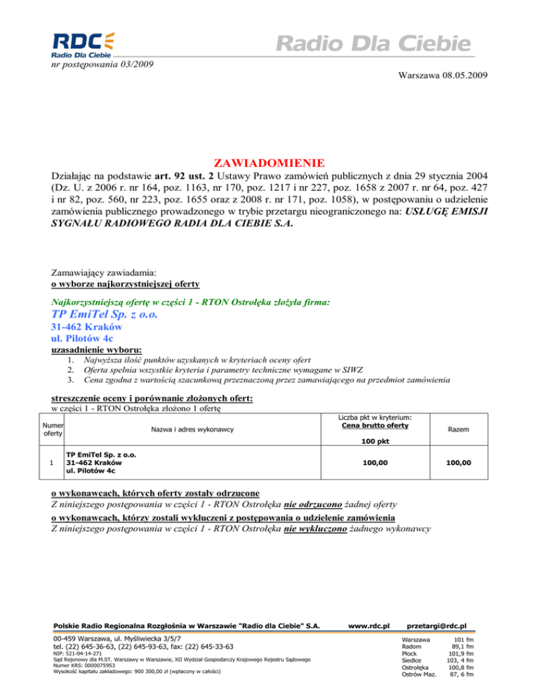 nr postępowania 03/2009 Warszawa 08.05.2009 ZAWIADOMIENIE Działając na podstawie art. 92 ust. 2 Ustawy Prawo zamówień publicznych z dnia 29 stycznia 2004 (Dz. U. z 2006 r. nr 164, poz. 1163, nr 170, poz. 1217 i nr 227, poz. 1658 z 2007 r. nr 64, poz. 427 i nr 82, poz. 560, nr 223, poz. 1655 oraz z 2008 r. nr 171, poz. 1058), w postępowaniu o udzielenie zamówienia publicznego prowadzonego w trybie przetargu nieograniczonego na: USŁUGĘ EMISJI SYGNAŁU RADIOWEGO RADIA DLA CIEBIE S.A. Zamawiający zawiadamia: o wyborze najkorzystniejszej oferty Najkorzystniejszą ofertę w części 1 - RTON Ostrołęka złożyła firma: TP EmiTel Sp. z o.o. 31-462 Kraków ul. Pilotów 4c uzasadnienie wyboru: 1. 2. 3. Najwyższa ilość punktów uzyskanych w kryteriach oceny ofert Oferta spełnia wszystkie kryteria i parametry techniczne wymagane w SIWZ Cena zgodna z wartością szacunkową przeznaczoną przez zamawiającego na przedmiot zamówienia streszczenie oceny i porównanie złożonych ofert: w części 1 - RTON Ostrołęka złożono 1 ofertę Numer oferty Nazwa i adres wykonawcy Liczba pkt w kryterium: Cena brutto oferty Razem 100 pkt 1 TP EmiTel Sp. z o.o. 31-462 Kraków ul. Pilotów 4c 100,00 100,00 o wykonawcach, których oferty zostały odrzucone Z niniejszego postępowania w części 1 - RTON Ostrołęka nie odrzucono żadnej oferty o wykonawcach, którzy zostali wykluczeni z postępowania o udzielenie zamówienia Z niniejszego postępowania w części 1 - RTON Ostrołęka nie wykluczono żadnego wykonawcy Polskie Radio Regionalna Rozgłośnia w Warszawie "Radio dla Ciebie" S.A. 00-459 Warszawa, ul. Myśliwiecka 3/5/7 tel. (22) 645-36-63, (22) 645-93-63, fax: (22) 645-33-63 NIP: 521-04-14-271 Sąd Rejonowy dla M.ST. Warszawy w Warszawie, XII Wydział Gospodarczy Krajowego Rejestru Sądowego Numer KRS: 0000075953 Wysokość kapitału zakładowego: 900 300,00 zł (wpłacony w całości) www.rdc.pl [email protected] Warszawa Radom Płock Siedlce Ostrołęka Ostrów Maz. 101 89,1 101,9 103, 4 100,8 87, 6 fm fm fm fm fm fm Najkorzystniejszą ofertę w części 2 - TSR Ostrów Mazowiecka złożyła firma: TP EmiTel Sp. z o.o. 31-462 Kraków ul. Pilotów 4c uzasadnienie wyboru: 1. 2. 3. Najwyższa ilość punktów uzyskanych w kryteriach oceny ofert Oferta spełnia wszystkie kryteria i parametry techniczne wymagane w SIWZ Cena zgodna z wartością szacunkową przeznaczoną przez zamawiającego na przedmiot zamówienia streszczenie oceny i porównanie złożonych ofert: w części 2 - TSR Ostrów Mazowiecka złożono 1 ofertę Numer oferty Nazwa i adres wykonawcy Liczba pkt w kryterium: Cena brutto oferty Razem 100 pkt 1 TP EmiTel Sp. z o.o. 31-462 Kraków ul. Pilotów 4c 100,00 100,00 o wykonawcach, których oferty zostały odrzucone Z niniejszego postępowania w części 2 - TSR Ostrów Mazowiecka nie odrzucono żadnej oferty o wykonawcach, którzy zostali wykluczeni z postępowania o udzielenie zamówienia Z niniejszego postępowania w części 2 - TSR Ostrów Mazowiecka nie wykluczono żadnego wykonawcy Najkorzystniejszą ofertę w części 3 - RTCN Płock/Rachocin złożyła firma: TP EmiTel Sp. z o.o. 31-462 Kraków ul. Pilotów 4c uzasadnienie wyboru: 1. 2. 3. Najwyższa ilość punktów uzyskanych w kryteriach oceny ofert Oferta spełnia wszystkie kryteria i parametry techniczne wymagane w SIWZ Cena zgodna z wartością szacunkową przeznaczoną przez zamawiającego na przedmiot zamówienia streszczenie oceny i porównanie złożonych ofert: w części 3 - RTCN Płock/Rachocin złożono 2 oferty Numer oferty Nazwa i adres wykonawcy Liczba pkt w kryterium: Cena brutto oferty Razem 100 pkt 1 TP EmiTel Sp. z o.o. 31-462 Kraków ul. Pilotów 4c 2 POLSKIE SIECI NADAWCZE Sp. z o.o. 02-796 Warszawa ul. Migdałowa 4 100,00 100,00 80,22 80,22 o wykonawcach, których oferty zostały odrzucone Z niniejszego postępowania w części 3 - RTCN Płock/Rachocin nie odrzucono żadnej oferty o wykonawcach, którzy zostali wykluczeni z postępowania o udzielenie zamówienia Z niniejszego postępowania w części 3 - RTCN Płock/Rachocin nie wykluczono żadnego wykonawcy Polskie Radio Regionalna Rozgłośnia w Warszawie "Radio dla Ciebie" S.A. 00-459 Warszawa, ul. Myśliwiecka 3/5/7 tel. (22) 645-36-63, (22) 645-93-63, fax: (22) 645-33-63 NIP: 521-04-14-271 Sąd Rejonowy dla M.ST. Warszawy w Warszawie, XII Wydział Gospodarczy Krajowego Rejestru Sądowego Numer KRS: 0000075953 Wysokość kapitału zakładowego: 900 300,00 zł (wpłacony w całości) www.rdc.pl [email protected] Warszawa Radom Płock Siedlce Ostrołęka Ostrów Maz. 101 89,1 101,9 103, 4 100,8 87, 6 fm fm fm fm fm fm Najkorzystniejszą ofertę w części 4 - RON Radom złożyła firma: TP EmiTel Sp. z o.o. 31-462 Kraków ul. Pilotów 4c uzasadnienie wyboru: 1. 2. 3. Najwyższa ilość punktów uzyskanych w kryteriach oceny ofert Oferta spełnia wszystkie kryteria i parametry techniczne wymagane w SIWZ Cena zgodna z wartością szacunkową przeznaczoną przez zamawiającego na przedmiot zamówienia streszczenie oceny i porównanie złożonych ofert: w części 4 - RON Radom złożono 1 ofertę Numer oferty Nazwa i adres wykonawcy Liczba pkt w kryterium: Cena brutto oferty Razem 100 pkt 1 TP EmiTel Sp. z o.o. 31-462 Kraków ul. Pilotów 4c 100,00 100,00 o wykonawcach, których oferty zostały odrzucone Z niniejszego postępowania w części 4 - RON Radom nie odrzucono żadnej oferty o wykonawcach, którzy zostali wykluczeni z postępowania o udzielenie zamówienia Z niniejszego postępowania w części 4 - RON Radom nie wykluczono żadnego wykonawcy Najkorzystniejszą ofertę w części 5 - RTCN Siedlce/Łosice złożyła firma: TP EmiTel Sp. z o.o. 31-462 Kraków ul. Pilotów 4c uzasadnienie wyboru: 4. 5. 6. Najwyższa ilość punktów uzyskanych w kryteriach oceny ofert Oferta spełnia wszystkie kryteria i parametry techniczne wymagane w SIWZ Cena zgodna z wartością szacunkową przeznaczoną przez zamawiającego na przedmiot zamówienia s