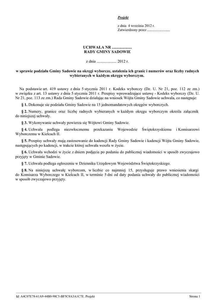 Projekt z dnia 4 września 2012 r. Zatwierdzony przez ......................... UCHWAŁA NR .................... RADY GMINY SADOWIE z dnia .................... 2012 r. w sprawie podziału Gminy Sadowie na okręgi wyborcze, ustalenia ich granic i numerów oraz liczby radnych wybieranych w każdym okręgu wyborczym. Na podstawie art. 419 ustawy z dnia 5 stycznia 2011 r. Kodeks wyborczy (Dz. U. Nr 21, poz. 112 ze zm.) w związku z art. 13 ustawy z dnia 5 stycznia 2011 r. Przepisy wprowadzające ustawę - Kodeks wyborczy (Dz. U. Nr 21, poz. 113 ze zm.) Rada Gminy Sadowie działając na wniosek Wójta Gminy Sadowie uchwala, co następuje: § 1. Dokonuje sie podziału Gminy Sadowie na 15 jednomandatowych okręgów wyborczych. § 2. Numery, granice oraz liczbę radnych wybieranych w każdym okręgu wyborczym określa załącznik do niniejszej uchwały. § 3. Wykonywanie uchwały powierza się Wójtowi Gminy Sadowie. § 4. Uchwała podlega niezwłocznemu Wyborczemu w Kielcach II. przekazaniu Wojewodzie Świętokrzyskiemu i Komisarzowi § 5. Przepisy uchwały mają zastosowanie do kadencji Rady Gminy Sadowie i kadencji Wójta Gminy Sadowie, następujących po kadencji, w trakcie której uchwała weszła w życie. § 6. Uchwała wchodzi w życie z dniem podjęcia po podaniu do publicznej wiadomości w sposób zwyczajowo przyjęty w Gminie Sadowie. § 7. Uchwała podlega ogłoszeniu w Dzienniku Urzędowym Województwa Świętokrzyskiego. § 8. Na niniejszą uchwałę wyborcom, w liczbie co najmniej 15, przysługuje prawo wniesienia skargi do Komisarza Wyborczego w Kielcach II, w terminie 5 dni od daty podania uchwały do publicznej wiadomości w sposób zwyczajowo przyjęty. ————————————————————————————————————————————————————————— Id: A4C07E78-61A9-44B0-98C5-BF5C8A3A1C7E. Projekt Strona 1 Załącznik Nr 1 do Uchwały Nr ..................... Rady Gminy Sadowie z dnia....................2012 r. Podział Gminy Sadowie na okręgi głosowania Nr okręgu wyborczego 1 Granice okręgu wyborczego Liczba wybieranych radnych 1 3 Sołectwo Sadowie od nr 1-46;4969;133;136 wraz z oznaczeniami literowymi. Sołectwo Sadowie od nr 47-48; 70132;134-135 wraz z oznaczeniami literowymi. Sołectwa: Zochcin, Porudzie 4 Sołectwa: Ruszkowiec, Czerwona Góra 1 5 1 7 Sołectwo Jacentów od nr 1-46; 117;119;121-164;170 wraz z oznaczeniami literowymi. Sołectwo Jacentów od nr 47-116;118; 120;165-169;171-187 wraz z oznaczeniami literowymi Sołectwo Ruszków 8 Sołectwo Rżuchów 1 9 Sołectwo Obręczna 1 10 Sołectwa: Wszechświęte, Okręglica, Szczucice 1 11 Sołectwo Bogusławice 1 12 Sołectwa: Grocholice, Małoszyce 1 13 Sołectwo Niemienice 1 14 Sołectwa: Łężyce, Bukowiany, Biskupice 1 15 Sołectwa: Zwola, Truskolasy, Michałów 1 2 6 1 1 1 1 ————————————————————————————————————————————————————————— Id: A4C07E78-61A9-44B0-98C5-BF5C8A3A1C7E. Projekt Strona 1 Uzasadnienie do uchwały Nr .................................... w sprawie podziału Gminy Sadowie na okręgi wyborcze, ustalenia ich granic i numerów oraz liczby radnych wybieranych w każdym okręgu wyborczym. Ustawa z dnia 5 stycznia 2011 r. - Kodeks wyborczy, która weszła w życie z dniem 1 sierpnia 2011, wprowadziła w art. 418 § 1 zasadę, że w okręgu wyborczym tworzonym dla wyboru rady w gminie niebędącej miastem na prawach powiatu wybiera się jednego radnego. Jednocześnie przepis art. 13 ust. z dnia 5 stycznia 2011 r. przepisy wprowadzające ustawę - Kodeks wyborczy zobowiązują wszystkie Rady Gmin do dokonania podziału gminy na okręgi wyborcze w wyborach do Rady Gminy w terminie piętnastu miesięcy od dnia wejścia w życie tej ustawy tzn. do 1 listopada 2012 r. Ponadto w artykule tym stwierdza się, że przy ustalaniu podziału gminy na okręgi wyborcze uwzględnia się liczbę mieszkańców ujętych w stałym rejestrze wyborców danej gminy na koniec kwartału poprzedzającego kwartał, w którym rada gminy dokonuje podziału gminy na okręgi wyborcze. Według stanu na dzień 30 czerwca 2012 r. liczba mieszkańców Gminy Sadowie wynosiła 4163. Zgodnie z art. 17 ustawy z dnia 8 marca 1990 r. o samorządzie gminnym w gminach do 20 000 mieszkańców w skład rady wchodzą radni w liczbie 15. Z porównania danych o liczbie mieszkańców z art. 17 ust. o samorządzie gminnym wynika, że do Rady Gminy Sadowie wybieranych będzie 15 radnych. Podział Rady Gminy Sadowie na okręgi wyborcze opracowany został zgodnie z zasadami tworzenia okręgów wyborczych wynikających z art. 417 - 419 Kodeksu wyborczego, to znaczy: w każdym okręgu wyborczym tworzonym dla wyboru rady wybierany będzie 1 radny. Podział na okręgi wyborcze nie narusza generalnej reguły, że o ilości mandatów decyduje liczba mieszkańców przypadająca na 1 mandat (norma przedstawicielstwa) stanowiąca naczelną zasadę równości wyborów zapisaną w art. 369. Kodeksu wyborczego. Normę przedstawicielstwa oblicza się przez podzielenie liczby mieszkańców gminy przez liczbę radnych. Wynosi ona 277,5. W podziale gminy na okręgi wyborcze uwzględniono zasadę, że okręgiem wyborczym jest jednostka pomocnicza gminy, sołectwo. Jednostki pomocnicze gminy łączono w celu utworzenia okręgu wyborczego. Natomiast sołectwa Sadowie i Jacentów ze względu na normę przedstawicielstwa podzielono każde na dwa okręgi. Wynikało to z konieczności zachowania jednolitej normy przedstawicielstwa. Zgodnie z art. 419 § 2 pkt.1 Kodeksu Wyborczego obliczono ułamki liczby mandatów przypadające dla jednostek pomocniczych dzieląc liczbę mieszkańców jednostki przez jednolitą normę przedstawicielstwa. Następnie ułamki liczby mandatów równe lub większe od 0,5 zaokrąglono w górę do liczby całkowitej. Układ przestrzenny gminy, w powiązaniu z li