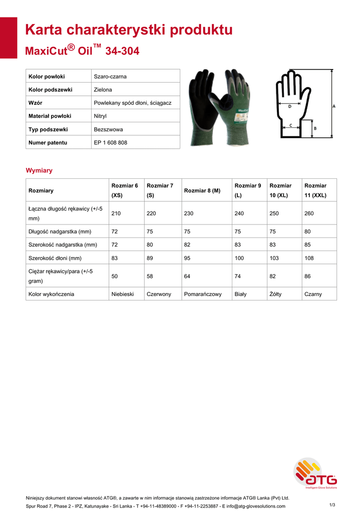 Karta charakterystki produktu MaxiCut® Oil™ 34-304 Kolor powłoki Szaro-czarna Kolor podszewki Zielona Wzór Powlekany spód dłoni, ściągacz Materiał powłoki Nitryl Typ podszewki Bezszwowa Numer patentu EP 1 608 808 Wymiary Rozmiar 6 Rozmiar 7 (XS) (S) 210 220 Długość nadgarstka (mm) 72 Szerokość nadgarstka (mm) Szerokość dłoni (mm) Rozmiary Łączna długość rękawicy (+/-5 mm) Ciężar rękawicy/para (+/-5 gram) Kolor wykończenia Rozmiar 9 Rozmiar Rozmiar (L) 10 (XL) 11 (XXL) 230 240 250 260 75 75 75 75 80 72 80 82 83 83 85 83 89 95 100 103 108 50 58 64 74 82 86 Niebieski Czerwony Pomarańczowy Biały Żółty Czarny Rozmiar 8 (M) Niniejszy dokument stanowi własność ATG®, a zawarte w nim informacje stanowią zastrzeżone informacje ATG® Lanka (Pvt) Ltd. Spur Road 7, Phase 2 - IPZ, Katunayake - Sri Lanka - T +94-11-48389000 - F +94-11-2253887 - E [email protected] 1/3 Karta charakterystki produktu MaxiCut® Oil™ 34-304 Wyniki testów EN Test Jednostka notyfikowana Wynik/zaliczenie EN 420: 2003 + A1: 2009 SATRA Tak EN 388: 2003 SATRA 4331 EN 374-3: 2003 - EN 374-2: 2003 - EN 407: 2004 - EN 511: 2006 - EN 10819 nd. 1935/2004/WE (kontakt z żywnością w EU) - EN 14362-2: 2003 Pomyślny Jeżeli rękawica ze względu na swoją konstrukcję nie spełnia wymagań normy EN 420 w zakresie wymiarów dłoni, wówczas taka rękawica jest klasyfikowana jako rękawica „do zastosowań specjalnych”. Typowe parametry użytkowe EN 420 Sprawność manipulacyjna Stopień 5 EN 420 pH 6.50 EN 388 A. Odporność na ścieranie > 8000 Cycles EN 388 B. Odporność na przecięcia > 5.0 index EN 388 C. Odporność na przedarcie > 50 Niutonów EN 388 D. Odporność na przebicie > 20 Niutonów EN 14362-2 barwniki azowe Nie wykryto obecności amin (<30'mg/kg) Niniejszy dokument stanowi własność ATG®, a zawarte w nim informacje stanowią zastrzeżone informacje ATG® Lanka (Pvt) Ltd. Spur Road 7, Phase 2 - IPZ, Katunayake - Sri Lanka - T +94-11-48389000 - F +94-11-2253887 - E [email protected] 2/3 Karta charakterystki produktu MaxiCut® Oil™ 34-304 HandCare® Skin Health Alliance Dermatologially Accredited Tak REACH compliant Tak OekoTex® 100 Certyfikacja Preparat Sanitized Tak Właściwości szczególne Bez silikonu Tak Opakowanie Liczba par w torebce foliowej 12 Poly bags per carton 6 Liczba kartonów 72 Wymiary kartonu (mm) 500 x 295 x 200 Waga Rozmiary Size 6 (XS) Size 7 (S) Size 8 (M) Size 9 (L) Size 10 (XL) Size 11 (XXL) Masa brutto (kg) 4.8 5.4 5.8 6.5 7 7.4 Masa kartonu (kg) 1 1 1 1 1 1 Masa netto (kg) 3.8 4.4 4.8 5.5 6 6.4 Data publikacji: 22.09.2014 Niniejszy dokument stanowi własność ATG®, a zawarte w nim informacje stanowią zastrzeżone informacje ATG® Lanka (Pvt) Ltd. Spur Road 7, Phase 2 - IPZ, Katunayake - Sri Lanka - T +94-11-48389000 - F +94-11-2253887 - E [email protected] 3/3