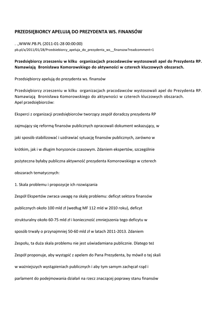PRZEDSIĘBIORCY APELUJĄ DO PREZYDENTA WS. FINANSÓW . .,WWW.PB.PL (2011-01-28 00:00:00) pb.pl/a/2011/01/28/Przedsiebiorcy_apeluja_do_prezydenta_ws__finansow?readcomment=1 Przedsiębiorcy zrzeszeniu w kilku organizacjach pracodawców wystosowali apel do Prezydenta RP. Namawiają Bronisława Komorowskiego do aktywności w czterech kluczowych obszarach. Przedsiębiorcy apelują do prezydenta ws. finansów Przedsiębiorcy zrzeszeniu w kilku organizacjach pracodawców wystosowali apel do Prezydenta RP. Namawiają Bronisława Komorowskiego do aktywności w czterech kluczowych obszarach. Apel przedsiębiorców: Eksperci z organizacji przedsiębiorców tworzący zespół doradczy prezydenta RP zajmujący się reformą finansów publicznych opracowali dokument wskazujący, w jaki sposób stabilizować i uzdrawiać sytuację finansów publicznych, zarówno w krótkim, jak i w długim horyzoncie czasowym. Zdaniem ekspertów, szczególnie pożyteczna byłaby publiczna aktywność prezydenta Komorowskiego w czterech obszarach tematycznych: 1. Skala problemu i propozycje ich rozwiązania Zespół Ekspertów zwraca uwagę na skalę problemu: deficyt sektora finansów publicznych około 100 mld zł (według MF 112 mld w 2010 roku), deficyt strukturalny około 60-75 mld zł i konieczność zmniejszenia tego deficytu w sposób trwały o przynajmniej 50-60 mld zł w latach 2011-2013. Zdaniem Zespołu, ta duża skala problemu nie jest uświadamiana publicznie. Dlatego też Zespół proponuje, aby wystąpić z apelem do Pana Prezydenta, by mówił o tej skali w ważniejszych wystąpieniach publicznych i aby tym samym zachęcał rząd i parlament do podejmowania działań na rzecz znaczącej poprawy stanu finansów publicznych. Prezydent RP powinien też wyjaśniać publicznie, że koszty społeczne wynikające z konieczności redukowania deficytu budżetowego mogą być nieuniknione, ale będą one mniejsze lub nawet dużo mniejsze niż koszty kontynuowania wysokich deficytów i rosnącego długu publicznego. Eksperci stoją na stanowisku, że zwiększanie całkowitych obciążeń fiskalnych zarówno osób fizycznych (w szczególności poprzez podnoszenie stawek podatku od towarów i usług), jak i podmiotów gospodarczych, w żadnej mierze nie poprawi w dłuższej perspektywie sytuacji finansowej Państwa. Zła procedura wydatków jest w stanie zaabsorbować każdą kwotę przychodów, jednocześnie nie hamując wzrostu deficytu budżetowego. 2. Reforma emerytalna rządu Buzka była osiągnięciem Zdaniem Zespołu Ekspertów, prezydent powinien też stanąć w obronie reformy emerytalnej wprowadzonej przez rząd J.Buzka 11 lat temu, określić ją jako jeden z sukcesów 20 lat transformacji, zwrócić uwagę na poparcie tej reformy przez wszystkie partie polityczne reprezentowane wtedy w parlamencie. Reforma ta jest jednym z największych osiągnięć polskiej gospodarki szczególnie na tle reform najbardziej rozwiniętych krajów Unii Europejskiej. Problem pogłębiającego się deficytu w większości krajów Unii na skutek zaniechania reformy systemu emerytalnego będzie nabierał coraz większego znaczenia w najbliższych 3-4 latach. Polska nie powinna zaprzepaścić 11-letniego doświadczenia i przewagi konkurencyjnej nad pozostałymi krajami członkowskimi UE. 3. Deficyt ZUS-u efektem zaniechania planowanych reform emerytalnych i rozszerzenia emerytalnych przywilejów, także zmniejszenia składki rentowej Zespołu Ekspertów proponuje Panu Prezydentowi zwracanie uwagi na fakt, że w ciągu ostatnich 11 lat zmiany w systemie emerytalnym, z wyjątkiem rozpoczęcia w roku 2010 eliminacji uprawnień do przechodzenia na wcześniejszą emeryturę w systemie FUS, zmierzały w kierunku przeciwnym od pierwotnie zamierzonych, co w rezultacie spowodowało zmniejszenie dopływu środków do I filara lub wzrost wydatków tego filara. 4. Potrzeba nowych reform emerytalnych Wreszcie Zespołu Ekspertów proponuje Panu Prezydentowi publiczne odnotowywanie, że w Polsce mamy ciągle bardzo niski efektywny wiek emerytalny, średnio nieco ponad 59 lat. Mamy też bardzo niski stopień aktywności zawodowej Polaków. Ponieważ równocześnie mamy rzecz dobrą, rosnący oczekiwany czas życia, teraz dużo wyższy niż 20 lat temu, to silnie rosną wydatki emerytalne. Pan Prezydent mógłby wystąpić z poparciem możliwie szybkiego zrównania oficjalnego wieku emerytalnego kobiet i mężczyzn na poziomie 65 lat, z czasem 67 lat. Pożyteczne też byłoby poparcie Pana Prezydenta dla postulatu objęcia powszechnym systemem emerytalnym służb mundurowych oraz pracowników prokuratury i sądownictwa. Inne i/lub bardziej szczegółowe propozycje reform emerytalnych zostaną przedstawione Panu Prezydentowi, celem rozważenia i poparcia, przez poszczególne organizacje przedsiębiorców. Podpisano: Amerykańska Izba Gospodarcza Business Centre Club Krajowa Izba Gospodarcza Naczelna Rada Spółdzielcza Naczelna Rada Zrzeszeń Handlu i Usług PKPP Lewiatan Polsko-Niemiecka Izba Przemysłowo-Handlowa Pracodawcy RP Związek Banków Polskich Związek Rzemiosła Polskiego
