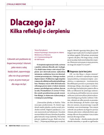 Z pasją o medycynie Dlaczego ja? Kilka refleksji o cierpieniu Człowiek sam pozbawia się bogactwa przeżyć i doznań, jakie niesie z sobą każdy dzień, zapominając albo nie chcąc pamiętać o tym, że jutra może już dla niego nie być. Teresa Świrydowicz Instytut Psychologii, Uniwersytet im. Adama Mickiewicza w Poznaniu ul. A. Szamarzewskiego 89 60-568 Poznań O cierpieniu napisano już wiele, zarówno z punktu widzenia filozofii, jak i teologii. Czy dzięki temu wiemy o nim więcej? Cierpienie jest doświadczeniem najbardziej intymnym, osobistym, bywa też doświadczeniem przerażającym, z którego uwalnia dopiero śmierć. Problem ten ciągle niepokoi i zmusza do refleksji nad kondycją ludzkiego losu. Niniejszy esej to efekt doświadczenia zebranego przeze mnie w trakcie niesienia pomocy psychologicznej osobom chorym na raka. Przemyślenia C.S. Levisa i V. Frankla zostały przedstawione przede wszystkim dlatego, że skutecznie wykorzystuję je w mojej pracy psychologa. „Zauważyłam plamkę na biodrze. Takie zwyczajne przebarwienie. Po dwóch tygo‑ dniach między plamką a pachą zaczęły prze‑ chodzić mrówki. Najpierw pojedynczo, z cza‑ sem maszerowały już kolumnami. Zaczęłam uważnie śledzić ich trasę i dotarłam do punktu, gdzie kończyły swoją wędrówkę. Pod moimi palcami znajdował się guz. Bolał coraz bar‑ dziej. […] Pojawiają się kolejne guzy na rękach, 46 MEDYCYNA I PASJE październik 2010 nogach. Mrówki ogarniają skórę głowy. Nie mogę już spać na plecach, bo na łopatce pojawił się kolejny pagórek. Ból pulsuje, promieniuje i ogarnia całe plecy. Nie mogę zasnąć, a kiedy już mi się udaje, budzi mnie kolejna fala cierpie‑ nia. Dłużej nie wytrzymam, to mnie przerasta, nie mogę tak cierpieć! Co to jest?!”. n Diagnoza: życie bez jutra J.H. van den Berg w „Innym istnieniu” powiada, że człowiek w największym stopniu żyje przyszłością, w mniejszym stopniu – prze‑ szłością, a w najmniejszym – teraźniejszością. Bezrefleksyjnie pozwala na przemijanie dnia dzisiejszego, lokując całą energię w wyobraża‑ nie sobie tego, kim będzie jutro, pojutrze albo za kilka czy kilkanaście lat. Jeżeli jego zamierze‑ nia realizują się, jeśli ludzkie życie nie zostanie zakłócone czymś niezwykłym, jakimś wydarze‑ niem dotykającym go bardzo osobiście i bole‑ śnie, człowiek nie tylko pozwala na przemija‑ nie dnia dzisiejszego, ale bardzo często tego dnia nie zauważa, nie przeżywając w sposób świadomy czasu teraźniejszego. Tym samym człowiek sam pozbawia się bogactwa przeżyć i doznań, jakie niesie z sobą każdy dzień, zapo‑ minając albo nie chcąc pamiętać o tym, że jutra może już dla niego nie być. Ciężka choroba – choroba nieuleczalna lub choroba śmiertelna, w sposób na ogół bardzo n Bunt, rezygnacja, walka Człowiek, którego zdrowie i życie zostały zagrożone chorobą, na utratę perspektywy lep‑ szej przyszłości i konieczności podporządko‑ wania swojego życia bolesnej teraźniejszości reaguje najczęściej albo buntem, albo przygnę‑ bieniem. Bunt wyraża się zwykle w zaprzeczaniu cho‑ robie i jej konsekwencjom: „Lekarz prosi, żeby przyjechał ktoś z rodziny. Mieszkają daleko, a ja jestem już dorosła – mówię mu spokojnie. – Ma pani raka. Długa cisza… I mój przeraźliwy śmiech. Nie wierzę, zróbcie ponownie badania”. Buntowanie się przeciwko zaistniałej przeraża‑ jącej sytuacji wyzwala silną motywację do tego, aby walczyć o swoje zdrowie i życie. Przygnębienie z kolei wywołuje rezygnację. W skróconej perspektywie życia wszystko, łącz‑ nie z własnym życiem, jest postrzegane jako bez‑ sensowne. Przygnębienie i rezygnacja nie są jed‑ nak tym samym, co świadoma zgoda na przyjęcie tego, czego zmienić ani odwrócić już nie można. Takie przekonania, jak: tak musiało być, Pan Bóg tak chce, bo tylko On wie, co dla człowieka jest dobre, mogą towarzyszyć zarówno postawie rezy‑ gnacji, jak i akceptacji. Zasadnicza różnica polega jednak na tym, że rezygnacja wyzwala bierne przyjmowanie tego, co niesie ze sobą zmienia‑ jąca się sytuacja, natomiast akceptacja związana jest z wysiłkiem zachowania wpływu na własne życie oraz troski o jakość tego życia mimo świa‑ domości nieuchronności bliskiego jego końca. Najprawdopodobniej postawa rezygnacji (kiedy nie jest nawykowym sposobem reagowania na sytuację trudną) stanowi najbardziej skuteczny psychologiczny mechanizm obrony przed cier‑ pieniem duchowym, którego intensywność prze‑ kracza próg wytrzymałości psychicznej. Począt‑ kowa reakcja buntu może także przejść w przy‑ gnębienie i rezygnację, jeżeli założony cel, to jest całkowite przywrócenie zdrowia, okaże się nie‑ możliwy do zrealizowania. Rezygnacja chroni przed myśleniem o przerażającej teraźniejszości i przyszłości, przed odczuwaniem grozy i drama‑ tyczności sytuacji. Z kolei niepoddawanie się, próba konstruk‑ tywnego poradzenia sobie z trudną sytuacją zawiera niezwykle istotny – z punktu widze‑ nia skuteczności – etap, który nazwać by można poszukiwaniem sensu. Człowiek zagrożony śmiertelną chorobą staje w obliczu takich pytań, jak: Jaki jest teraz sens mojego życia? Czy moje życie w ogóle miało sens? Jaki sens ma moje cier‑ pienie? Dlaczego to ja jestem przedmiotem tak przykrych doświadczeń? Próba sformułowania odpowiedzi na te pytania to właśnie poszukiwa‑ nie sensu. Próba taka może wypaść negatyw‑ nie albo pozytywnie. Jeżeli rezultatem rozwa‑ żań nad sensem jest przeświadczenie, że moje cierpienie nie ma sensu, moje życie także stra‑ Z pasją o medycynie brutalny zmusza do porzucenia marzeń o jutrze i skoncentrowania się na tym, co jest dziś. „Jest cudownie. Chodzimy po naszych uko‑ chanych ścieżkach, odkrywamy nowe miejsca. Pogoda w kratkę, ale postanowiłam n