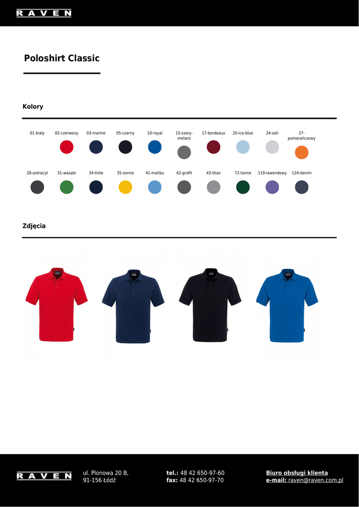 Poloshirt Classic Kolory 01-biały 02-czerwony 03-marine 05-czarny 10-royal 15-szarymelanż 17-bordeaux 20-ice-blue 24-ash 27pomarańczowy 28-antracyt 31-wasabi 34-tinte 35-sonne 41-malibu 42-grafit 43-titan 72-tanne 119-lawendowy 124-denim Zdjęcia ul. Plonowa 20 B, 91-156 Łódź tel.: 48 42 650-97-60 fax: 48 42 650-97-70 Biuro obsługi klienta e-mail: [email protected] ul. Plonowa 20 B, 91-156 Łódź tel.: 48 42 650-97-60 fax: 48 42 650-97-70 Biuro obsługi klienta e-mail: [email protected] ul. Plonowa 20 B, 91-156 Łódź tel.: 48 42 650-97-60 fax: 48 42 650-97-70 Biuro obsługi klienta e-mail: [email protected]
