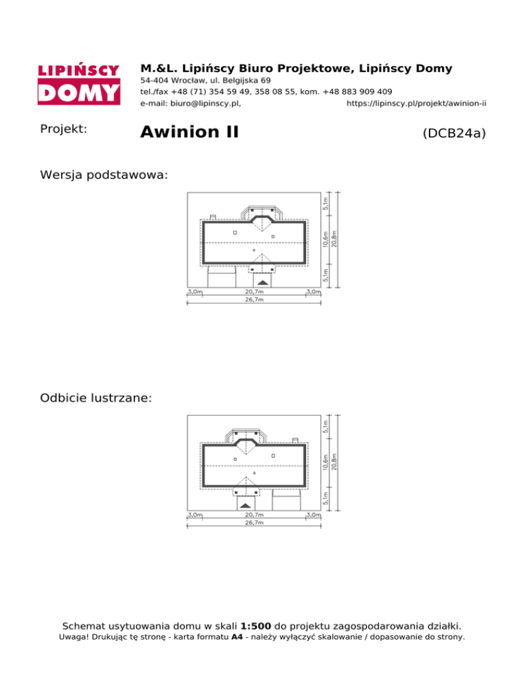 M.&L. Lipińscy Biuro Projektowe, Lipińscy Domy 54-404 Wrocław, ul. Belgijska 69 tel./fax +48 (71) 354 59 49, 358 08 55, kom. +48 883 909 409 Projekt: e-mail: [email protected], https://lipinscy.pl/projekt/awinion-ii Awinion II (DCB24a) Wersja podstawowa: Odbicie lustrzane: Schemat usytuowania domu w skali 1:500 do projektu zagospodarowania działki. Uwaga! Drukując tę stronę - karta formatu A4 - należy wyłączyć skalowanie / dopasowanie do strony. Powered by TCPDF (www.tcpdf.org)