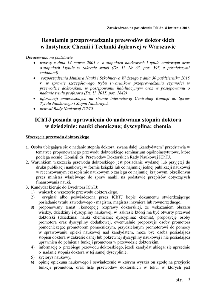 Zatwierdzono na posiedzeniu RN dn. 8 kwietnia 2016 Regulamin przeprowadzania przewodów doktorskich w Instytucie Chemii i Techniki Jądrowej w Warszawie Opracowano na podstawie ustawy z dnia 14 marca 2003 r. o stopniach naukowych i tytule naukowym oraz o stopniach i tytule w zakresie sztuki (Dz. U. Nr 65, poz. 595, z późniejszymi zmianami) rozporządzenia Ministra Nauki i Szkolnictwa Wyższego z dnia 30 października 2015 r. w sprawie szczegółowego trybu i warunków przeprowadzania czynności w przewodzie doktorskim, w postępowaniu habilitacyjnym oraz w postępowaniu o nadanie tytułu profesora (Dz. U. 2015, poz. 1842) informacji umieszczonych na stronie internetowej Centralnej Komisji do Spraw Tytułu Naukowego i Stopni Naukowych uchwał Rady Naukowej IChTJ IChTJ posiada uprawnienia do nadawania stopnia doktora w dziedzinie: nauki chemiczne; dyscyplina: chemia Wszczęcie przewodu doktorskiego 1. Osoba ubiegająca się o nadanie stopnia doktora, zwana dalej „kandydatem” przedstawia w tematyce proponowanego przewodu doktorskiego seminarium ogólnoinstytutowe, które podlega ocenie Komisji ds. Przewodów Doktorskich Rady Naukowej IChTJ. 2. Warunkiem wszczęcia przewodu doktorskiego jest posiadanie wydanej lub przyjętej do druku publikacji naukowej w formie książki lub co najmniej jednej publikacji naukowej w recenzowanym czasopiśmie naukowym o zasięgu co najmniej krajowym, określonym przez ministra właściwego do spraw nauki, na podstawie przepisów dotyczących finansowania nauki. 3. Kandydat kieruje do Dyrektora IChTJ: 1) wniosek o wszczęcie przewodu doktorskiego, 2) oryginał albo poświadczoną przez IChTJ kopię dokumentu stwierdzającego posiadanie tytułu zawodowego - magistra, magistra inżyniera lub równorzędnego, 3) proponowany temat i koncepcję rozprawy doktorskiej, ze wskazaniem obszaru wiedzy, dziedziny i dyscypliny naukowej, w zakresie której ma być otwarty przewód doktorski (dziedzina: nauki chemiczne; dyscyplina: chemia), propozycję osoby promotora oraz dyscypliny dodatkowej, ewentualnie propozycję osoby promotora pomocniczego; promotorem pomocniczym, przydzielonym promotorowi do pomocy w sprawowaniu opieki naukowej nad kandydatem, może być osoba posiadająca stopień doktora w zakresie danej lub pokrewnej dyscypliny naukowej i nie posiadająca uprawnień do pełnienia funkcji promotora w przewodzie doktorskim, 4) informację o przebiegu przewodu doktorskiego, jeżeli kandydat ubiegał się uprzednio o nadanie stopnia doktora w tej samej dyscyplinie, 5) życiorys naukowy, 6) opinię opiekuna naukowego i oświadczenie w którym wyraża on zgodę na przyjęcie funkcji promotora, oraz listę przewodów doktorskich w toku, w których jest str. 1 promotorem. Maksymalna liczba doktorantów, nad którymi promotor lub promotor pomocniczy może sprawować opiekę naukową, wynosi 5, 7) wykaz prac naukowych (z aktualną punktacją MNiSW) oraz informację o działalności popularyzującej naukę, 8) kandydat spoza IChTJ przedstawia pismo dyrektora jednostki w której jest zatrudniony skierowane do Dyrektora IChTJ, popierające wniosek o wszczęcie przewodu doktorskiego oraz zawierające deklarację o pokryciu kosztów przewodu, oraz opcjonalnie: 9) poświadczoną przez IChTJ kopię certyfikatu potwierdzającego znajomość nowożytnego języka obcego wg wykazu certyfikatów potwierdzających znajomość nowożytnego języka obcego (załącznik 1 do rozporządzenia MNiSW z dn. 30 października 2015), 10) wniosek o wyrażenie zgody na przedstawienie rozprawy doktorskiej w innym języku niż język polski. 4. Dyrektor IChTJ po stwierdzeniu prawidłowości złożonych dokumentów przekazuje je Komisji ds. Przewodów Doktorskich Rady Naukowej. 5. Rada Naukowa IChTJ na wniosek Komisji ds. Przewodów Doktorskich podejmuje uchwałę o wszczęciu przewodu doktorskiego pod tytułem zaproponowanym przez kandydata i zaakceptowanym przez Komisję ds. Przewodów Doktorskich. 6. Po wszczęciu przewodu doktorskiego, Rada Naukowa IChTJ wyznacza promotora, (oraz ewentualnie promotora pomocniczego). Warunki uzyskania stopnia doktora 1. Stopień doktora nadaje się osobie, która: 1) posiada tytuł zawodowy magistra, magistra inżyniera, lub posiada dyplom, o którym mowa w art. 191a ust. 3 i 4 ustawy z dnia 27 lipca 2005 r. - Prawo o szkolnictwie wyższym; 2) zdała egzaminy doktorskie w zakresie określonym przez Radę Naukową IChTJ, 3) przedstawiła i obroniła rozprawę doktorską, 4) zdała egzamin z nowożytnego języka obcego lub posiada certyfikat potwierdzający znajomość nowożytnego języka obcego, określony w przepisach wydanych na podstawie art. 31 pkt 5 ustawy. 2. Egzaminy doktorskie są przeprowadzane w zakresie: 1) dyscypliny podstawowej (chemii) odpowiadającej tematowi rozprawy doktorskiej, 2) dyscypliny dodatkowej, której wybór zaakceptowała Komisja ds. Przewodów Doktorskich. 3) obcego języka nowożytnego, w przypadku gdy osoba ubiegająca się o nadanie stopnia doktora nie posiada certyfikatu potwierdzającego znajomość języka obcego, o którym mowa ust. 1 pkt 4. Powołanie komisji 1. Rada Naukowa IChTJ powołuje na początku kadencji Komisję ds. Przewodów Doktorskich spośród członków Rady posiadających tytuł profesora lub stopień doktora habilitowanego w zakresie chemii oraz jej Przewodniczącego. W skład Komisji ds. Przewodów Doktorskich wchodzą ponadto recenzenci rozprawy doktorskiej oraz promotor (z dniem ich powołania). Komisja ds. Przewodów Doktorskich w rozszerzonym składzie liczy co najmniej siedem osób. 2. Rada Naukowa powołuje komisje przeprowadzające egzaminy doktorskie w zakresie: 1) dyscypliny podstawowej odpowiadającej tematowi rozprawy doktorskiej w składzie co najmniej czterech osób posiadających tytuł profesora lub stopień doktora str. 2 habilitowanego w zakresie odpowiednio dziedziny lub dyscypliny naukowej odpowiadającej tematowi rozprawy, w tym promotora, 2) dyscypliny dodatkowej w składzie co najmnie