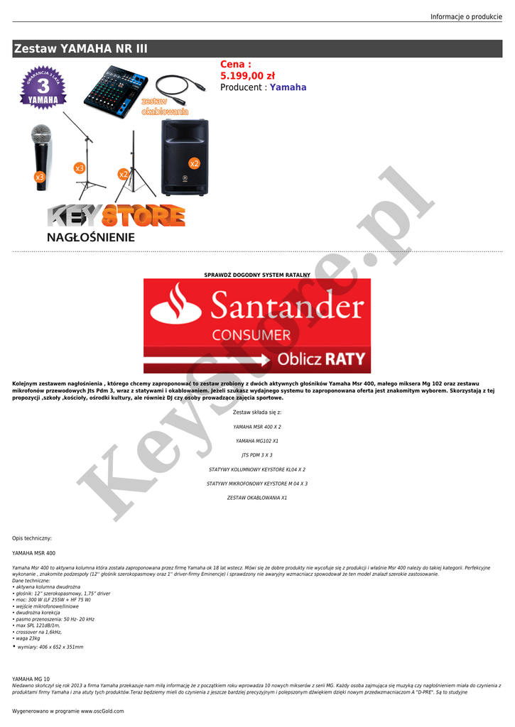 Informacje o produkcie Zestaw YAMAHA NR III Cena : 5.199,00 zł or e. pl Producent : Yamaha St SPRAWDŹ DOGODNY SYSTEM RATALNY Kolejnym zestawem nagłośnienia , którego chcemy zaproponować to zestaw zrobiony z dwóch aktywnych głośników Yamaha Msr 400, małego miksera Mg 102 oraz zestawu mikrofonów przewodowych Jts Pdm 3, wraz z statywami i okablowaniem. Jeżeli szukasz wydajnego systemu to zaproponowana oferta jest znakomitym wyborem. Skorzystają z tej propozycji ,szkoły ,kościoły, ośrodki kultury, ale również DJ czy osoby prowadzące zajęcia sportowe. K ey Zestaw składa się z: YAMAHA MSR 400 X 2 YAMAHA MG102 X1 JTS PDM 3 X 3 STATYWY KOLUMNOWY KEYSTORE KL04 X 2 STATYWY MIKROFONOWY KEYSTORE M 04 X 3 ZESTAW OKABLOWANIA X1 Opis techniczny: YAMAHA MSR 400 Yamaha Msr 400 to aktywna kolumna która została zaproponowana przez firmę Yamaha ok 18 lat wstecz. Mówi się że dobre produkty nie wycofuje się z produkcji i właśnie Msr 400 należy do takiej kategorii. Perfekcyjne wykonanie , znakomite podzespoły (12'' głośnik szerokopasmowy oraz 1'' driver-firmy Eminencje) i sprawdzony nie awaryjny wzmacniacz spowodował że ten model znalazł szerokie zastosowanie. Dane techniczne: • aktywna kolumna dwudrożna • głośnik: 12” szerokopasmowy, 1,75” driver • moc: 300 W (LF 255W + HF 75 W) • wejście mikrofonowe/liniowe • dwudrożna korekcja • pasmo przenoszenia: 50 Hz- 20 kHz • max SPL 121dB/1m, • crossover na 1,6kHz, • waga 23kg • wymiary: 406 x 652 x 351mm YAMAHA MG 10 Niedawno skończył się rok 2013 a firma Yamaha przekazuje nam miłą informację że z początkiem roku wprowadza 10 nowych mikserów z serii MG. Każdy osoba zajmująca się muzyką czy nagłośnieniem miała do czynienia z produktami firmy Yamaha i zna atuty tych produktów.Teraz będziemy mieli do czynienia z jeszcze bardziej precyzyjnym i polepszonym dźwiękiem dzięki nowym przedwzmacniaczom A "D-PRE". Są to studyjne Wygenerowano w programie www.oscGold.com przedwzmacniacze, dostępne również w high-end`owych profesjonalnych mikserach Yamaha, zapewniające jeszcze większą moc o niskim poziomie impedancji i spełniające oczekiwania nawet najbardziej wymagających inżynierów dźwięku. Zapewniając tłuste i naturalne basy, bogate środkowe pasma oraz płynne i klarowne wysokie tony o bardzo niskim poziomie zniekształcenia brzmienia. Propozycja Yamahy to bardzo szeroka oferta gdzie każdy znajdzie dla siebie odpowiedni model..Zaproponowano 5 standardowych modeli mikserów (w zakresie od 6 do 20 wejść) oraz 5 mikserów z wbudowanymi procesorami efektów SPX .Dodatkowe modele XU posiadają również interfejs audio USB 2.0, zapewniając jakość o rozdzielczości 24 bitów/192kHz. Dzięki temu mikser posiada możliwość odtwarzania cyfrowych danych z komputera oraz nagrywania, za pomocą oprogramowania DAW. Do każdego modelu dołączone jest oprogramowanie Steinberg’s Cubase AI oraz USB Audio Class 2.0, umożliwiając niezakłóconą współpracę z tabletami oraz innymi urządzeniami, bez konieczności instalacji sterowników. Wszystkie modele z serii XU są również kompatybilne z urządzeniami Apple - zestawem Camera Connection Kit oraz adapterem Lighting-to-USB Camera Adapter, zapewniając niezakłócony proces nagrywania i odtwarzania cyfrowej zawartości na i z iPad`a lub iPhone`a. ● 10-kanałowa konsola mikserska ● Maksymalnie 4 wejścia mikrofonowe / 10 liniowych (4 mono + 3 stereo) ● 1 szyna stereo bus ● 1 AUX (w tym FX) ● Przedwzmacniacze mikrofonowe "D-PRE" z odwróconymi układami Darlingtona ● 1-pokrętłowe kompresory ● Przełącznik PAD na wejścia mono ● Zasilanie phantom +48V ● Symetryczne wyjścia XLR ● Metalowa obudowa ● Wymiary (szer. x wys. x gł.): 244 mm x 71 mm x 294 mm (9.6"x 2.8"x 11.6") ● Waga netto: 1.9 kg (4.19 lbs.) JTS PDM 3 or e. pl Dane techniczne Mg 10: Jest wiele firm które wzorują się na renomowanych produktach i topowych mikrofonach wokalnych. JTS PDM 3 jest mikrofonem wzorowanym na legendarnym SM 58. Jakość proponowana przez JTS jest zaskakująca a stosunek ceny zadowoli najbardziej wybrednego klienta . Jeżeli nie chcesz wydać kwoty powyżej 250 zł PDM 3 to trafiony pomysł który jest warty przemyślenia. Dane techniczne: Zastosowanie: mikrofon wokalny o bardzo czystym selektywnym brzmieniu Charakterystyka :kardioidalna Pasmo przenoszenia:50 Hz - 16,5 kHz Czułość:- 73 dB (0,18 mV) = 1 V/μ bar Impedancja:600 Ohm Waga:290g Uchwyt mikrofonowy -opcjonalnie STATYW KEYSTORE KL04 St W zestawie okablowanie XLR-XLR 4,5m Mocny stabilny stalowy statyw pod kolumny w najlepszej cenie: ● Waga: 5 kg ● Minimalna wysokość:115cm ● Maksymalna wysokość:200cm ● Udźwig max :30 kg ● Kolor:czarny K STATYW KEYSTORE M05 ey Dane techniczne: Polski stabilny,stalowy statyw mikrofonowy z blokadą motylkową oraz wzmocnionymi nogami w najlepszej cenie. Dane techniczne: ● Waga: 2,6 kg ● Długość ramienia:70 cm ● Minimalna wysokość:90cm ● Maksymalna wysokość:150cm ● Kolor:czarny ZESTAW OKABLOWANIA 2x przewód głośnikowy xlr-xlr ,3x 5 m przewód mikrofonowy. __ zestaw szkolny