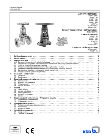 Instrukcja obsługi 0570.82/11-61 Zawory odcinające BOAR-H/HE NORIR 40 NORIR 160 NORIR 320 NORIR 500 NORIR-A NORICHEMR BOACHEMR Zawory rozruchowe i zatrzymujące ZJSVA/ZXSVA Zawory zwrotne NORIR 40 NORIR 160 NORIR 320 NORIR-A RGS NORICHEMR Łapacze zanieczyszczeń NORICHEMR NORIR 40 1 2 3 Deklaracja zgodności . . . . . . . . . . . . . . . . . . . . . . . . . . . . . . . . . . . . . . . . . . . . . . . . . . . . . . . . . . . . . . . . . . . . Uwagi ogólne . . . . . . . . . . . . . . . . . . . . . . . . . . . . . . . . . . . . . . . . . . . . . . . . . . . . . . . . . . . . . . . . . . . . . . . . . . . . Bezpieczeństwo . . . . . . . . . . . . . . . . . . . . . . . . . . . . . . . . . . . . . . . . . . . . . . . . . . . . . . . . . . . . . . . . . . . . . . . . . 2 4 4 4 Transport i składowanie . . . . . . . . . . . . . . . . . . . . . . . . . . . . . . . . . . . . . . . . . . . . . . . . . . . . . . . . . . . . . . . . . . 5 5 Beschreibung der Armaturen . . . . . . . . . . . . . . . . . . . . . . . . . . . . . . . . . . . . . . . . . . . . . . . . . . . . . . . . . . . . . 5 6 Montaż . . . . . . . . . . . . . . . . . . . . . . . . . . . . . . . . . . . . . . . . . . . . . . . . . . . . . . . . . . . . . . . . . . . . . . . . . . . . . . . . . . 10 7 Eksploatacja / Uruchomienie / Wyłączenie z ruchu . . . . . . . . . . . . . . . . . . . . . . . . . . . . . . . . . . . . . . . . . 11 8 Konserwacja / naprawy . . . . . . . . . . . . . . . . . . . . . . . . . . . . . . . . . . . . . . . . . . . . . . . . . . . . . . . . . . . . . . . . . . . 11 9 Usterki i ich usuwanie . . . . . . . . . . . . . . . . . . . . . . . . . . . . . . . . . . . . . . . . . . . . . . . . . . . . . . . . . . . . . . . . . . . . 12 c3.1 3.2 3.3 3.4 3.5 3.6 3.7 4.1 4.2 5.1 5.2 5.3 5.4 6.1 6.2 6.3 6.4 6.5 7.1 7.2 8.1 8.2 8.3 9.1 9.2 Oznakowanie wskazówek w instrukcji obsługi . . . . . . . . . . . . . . . . . . . . . . . . . . . . . . . . . . . . . . . . . . . . . . . . . . . . . . Zagrożenia w przypadku nieprzestrzegania wskazówek dotyczących bezpieczeństwa . . . . . . . . . . . . . . . . . . . Praca ze świadomością bezpieczeństwa . . . . . . . . . . . . . . . . . . . . . . . . . . . . . . . . . . . . . . . . . . . . . . . . . . . . . . . . . . Wskazówki dotyczące bezpieczeństwa dla użytkownika / obsługi . . . . . . . . . . . . . . . . . . . . . . . . . . . . . . . . . . . . . Wskazówki dotyczące bezpieczeństwa przy konserwacji, inspekcji, montażu . . . . . . . . . . . . . . . . . . . . . . . . . . . Samodzielne przeróbki i wytwarzanie części zamiennych . . . . . . . . . . . . . . . . . . . . . . . . . . . . . . . . . . . . . . . . . . . . Niedopuszczalne sposoby eksploatacji . . . . . . . . . . . . . . . . . . . . . . . . . . . . . . . . . . . . . . . . . . . . . . . . . . . . . . . . . . . . Transport . . . . . . . . . . . . . . . . . . . . . . . . . . . . . . . . . . . . . . . . . . . . . . . . . . . . . . . . . . . . . . . . . . . . . . . . . . . . . . . . . . . . . Składowanie . . . . . . . . . . . . . . . . . . . . . . . . . . . . . . . . . . . . . . . . . . . . . . . . . . . . . . . . . . . . . . . . . . . . . . . . . . . . . . . . . . . Oznakowanie . . . . . . . . . . . . . . . . . . . . . . . . . . . . . . . . . . . . . . . . . . . . . . . . . . . . . . . . . . . . . . . . . . . . . . . . . . . . . . . . . . Rysunki / dokumentacja . . . . . . . . . . . . . . . . . . . . . . . . . . . . . . . . . . . . . . . . . . . . . . . . . . . . . . . . . . . . . . . . . . . . . . . . . Wykaz części . . . . . . . . . . . . . . . . . . . . . . . . . . . . . . . . . . . . . . . . . . . . . . . . . . . . . . . . . . . . . . . . . . . . . . . . . . . . . . . . . . Sposób działania . . . . . . . . . . . . . . . . . . . . . . . . . . . . . . . . . . . . . . . . . . . . . . . . . . . . . . . . . . . . . . . . . . . . . . . . . . . . . . . Uwagi ogólne . . . . . . . . . . . . . . . . . . . . . . . . . . . . . . . . . . . . . . . . . . . . . . . . . . . . . . . . . . . . . . . . . . . . . . . . . . . . . . . . . . Montaż w instalacji . . . . . . . . . . . . . . . . . . . . . . . . . . . . . . . . . . . . . . . . . . . . . . . . . . . . . . . . . . . . . . . . . . . . . . . . . . . . . Instrukcja montażu . . . . . . . . . . . . . . . . . . . . . . . . . . . . . . . . . . . . . . . . . . . . . . . . . . . . . . . . . . . . . . . . . . . . . . . . . . . . . Armatura z napędem . . . . . . . . . . . . . . . . . . . . . . . . . . . . . . . . . . . . . . . . . . . . . . . . . . . . . . . . . . . . . . . . . . . . . . . . . . . Izolacja . . . . . . . . . . . . . . . . . . . . . . . . . . . . . . . . . . . . . . . . . . . . . . . . . . . . . . . . . . . . . . . . . . . . . . . . . . . . . . . . . . . . . . . Eksploatacja / uruchomienie . . . . . . . . . . . . . . . . . . . . . . . . . . . . . . . . . . . . . . . . . . . . . . . . . . . . . . . . . . . . . . . . . . . . . Wyłączenie z ruchu . . . . . . . . . . . . . . . . . . . . . . . . . . . . . . . . . . . . . . . . . . . . . . . . . . . . . . . . . . . . . . . . . . . . . . . . . . . . . Wskazówki dotyczące bezpieczeństwa . . . . . . . . . . . . . . . . . . . . . . . . . . . . . . . . . . . . . . . . . . . . . . . . . . . . . . . . . . . . Konserwacja . . . . . . . . . . . . . . . . . . . . . . . . . . . . . . . . . . . . . . . . . . . . . . . . . . . . . . . . . . . . . . . . . . . . . . . . . . . . . . . . . . . Montaż armatury . . . . . . . . . . . . . . . . . . . . . . . . . . . . . . . . . . . . . . . . . . . . . . . . . . . . . . . . . . . . . . . . . . . . . . . . . . . . . . . Uwagi ogólne . . . . . . . . . . . . . . . . . . . . . . . . . . . . . . . . . . . . . . . . . . . . . . . . . . . . . . . . . . . . . . . . . . . . . . . . . . . . . . . . . . - Usterki > Usuwanie . . . . . . . . . . . . . . . . . . . . . . . . . . . . . . . . . . . . . . . . . . . . . . . . . . . . . . . . . . . . . . . . . . . . . . . . . . . DUC 97/23/UE 4 5 5 