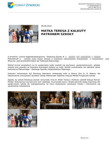 Starostwo Powiatowe w Żywcu ul. Krasińskiego 13 +48 33 860 50 23 [email protected] 09.09.2015 MATKA TERESA Z KALKUTY PATRONEM SZKOŁY 5 września Liceum Ogólnokształcącemu - Edukacja Żywiec #℣佐⌡⌀䰀椀挀攀甀洀 搀氀愀 䐀漀爀漀猁䈀礀挀栀 椀 匀稀欀漁䈀a Policealna#℣䍐⌡⌀ 渀愀搀愀渀漀 椀洀椁ᤀ 䴀愀琀欀椀 吀攀爀攀猀礀 稀 䬀愀氀欀甀琀礀⸀ 唀爀漀挀稀礀猀琀漁嬁 ܀爀漀稀瀀漀挀稁ᤀ琀漀 眀 簀礀眀椀攀挀欀椀攀樀 欀漀渀欀 Mszą św. pod przewodnictwem bp Tadeusza Rakoczego. Wśród licznie przybyłych na to wydarzenie osób znaleźli się duchowni, parlamentarzyści, władze miasta oraz powiatu ze Starostą Andrzejem Kalatą na czele. Wśród uczestników nie zabrakło także Kazimierza Matusznego – Radnego Sejmiku Województwa Śląskiego. Gościem honorowym był Pierwszy Sekretarz Ambasady Indii w Polsce Shri G. R. Meena. Na zakończenie uroczystości dyrektor szkoły Aleksander Sapiński wręczył Medal Przyjaciela Szkoły. Zgodę, by szkoła Edukacja Żywiec otrzymały imię bł. Matki Teresy z Kalkuty udzielił biskup Roman Pindel. Ordynariusz wyraził przy tym nadzieję, że przykład życia i dzieła patronki będą inspiracja dla społeczności szkoły do zaangażowania na rzecz budowania cywilizacji miłości i kierowania się wyobraźnią miłosierdzia. Strona 1/2 Starostwo Powiatowe w Żywcu ul. Krasińskiego 13 +48 33 860 50 23 [email protected] Strona 2/2 Powered by TCPDF (www.tcpdf.org)