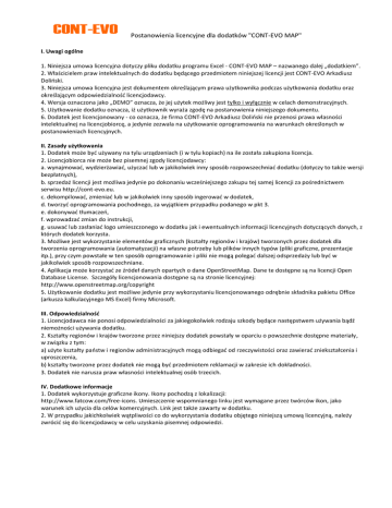 Postanowienia licencyjne dla dodatków "CONT-EVO MAP" I. Uwagi ogólne 1. Niniejsza umowa licencyjna dotyczy pliku dodatku programu Excel - CONT-EVO MAP – nazwanego dalej „dodatkiem”. 2. Właścicielem praw intelektualnych do dodatku będącego przedmiotem niniejszej licencji jest CONT-EVO Arkadiusz Doliński. 3. Niniejsza umowa licencyjna jest dokumentem określającym prawa użytkownika podczas użytkowania dodatku oraz określającym odpowiedzialność licencjodawcy. 4. Wersja oznaczona jako „DEMO” oznacza, że jej użytek możliwy jest tylko i wyłącznie w celach demonstracyjnych. 5. Użytkowanie dodatku oznacza, iż użytkownik wyraża zgodę na postanowienia niniejszego dokumentu. 6. Dodatek jest licencjonowany - co oznacza, że firma CONT-EVO Arkadiusz Doliński nie przenosi prawa własności intelektualnej na licencjobiorcę, a jedynie zezwala na użytkowanie oprogramowania na warunkach określonych w postanowieniach licencyjnych. II. Zasady użytkowania 1. Dodatek może być używany na tylu urządzeniach (i w tylu kopiach) na ile została zakupiona licencja. 2. Licencjobiorca nie może bez pisemnej zgody licencjodawcy: a. wynajmować, wydzierżawiać, użyczać lub w jakikolwiek inny sposób rozpowszechniać dodatku (dotyczy to także wersji bezpłatnych), b. sprzedaż licencji jest możliwa jedynie po dokonaniu wcześniejszego zakupu tej samej licencji za pośrednictwem serwisu http://cont-evo.eu. c. dekompilować, zmieniać lub w jakikolwiek inny sposób ingerować w dodatek, d. tworzyć oprogramowania pochodnego, za wyjątkiem przypadku podanego w pkt 3. e. dokonywać tłumaczeń, f. wprowadzać zmian do instrukcji, g. usuwać lub zasłaniać logo umieszczonego w dodatku jak i ewentualnych informacji licencyjnych dotyczących danych, z których dodatek korzysta. 3. Możliwe jest wykorzystanie elementów graficznych (kształty regionów i krajów) tworzonych przez dodatek dla tworzenia oprogramowania (automatyzacji) na własne potrzeby lub plików innych typów (pliki graficzne, prezentacje itp.), przy czym powstałe w ten sposób oprogramowanie i pliki nie mogą polegać dalszej odsprzedaży lub być w jakikolwiek sposób rozpowszechniane. 4. Aplikacja może korzystać ze źródeł danych opartych o dane OpenStreetMap. Dane te dostępne są na licencji Open Database License. Szczegóły licencjonowania dostępne są na stronie licencyjnej: http://www.openstreetmap.org/copyright 5. Użytkowanie dodatku jest możliwe jedynie przy wykorzystaniu licencjonowanego odrębnie składnika pakietu Office (arkusza kalkulacyjnego MS Excel) firmy Microsoft. III. Odpowiedzialność 1. Licencjodawca nie ponosi odpowiedzialności za jakiegokolwiek rodzaju szkody będące następstwem używania bądź niemożności używania dodatku. 2. Kształty regionów i krajów tworzone przez niniejszy dodatek powstały w oparciu o powszechnie dostępne materiały, w związku z tym: a) użyte kształty państw i regionów administracyjnych mogą odbiegać od rzeczywistości oraz zawierać zniekształcenia i uproszczenia, b) kształty tworzone przez dodatek nie mogą być przedmiotem reklamacji w zakresie ich dokładności. 3. Dodatek nie narusza praw własności intelektualnej osób trzecich. IV. Dodatkowe informacje 1. Dodatek wykorzystuje graficzne ikony. Ikony pochodzą z lokalizacji: http://www.fatcow.com/free-icons. Umieszczenie wspomnianego linku jest wymagane przez twórców ikon, jako warunek ich użycia dla celów komercyjnych. Link jest także zawarty w dodatku. 2. W przypadku jakichkolwiek wątpliwości co do wykorzystania dodatku objętego niniejszą umową licencyjną, należy zwrócić się do licencjodawcy w celu uzyskania pisemnej odpowiedzi.