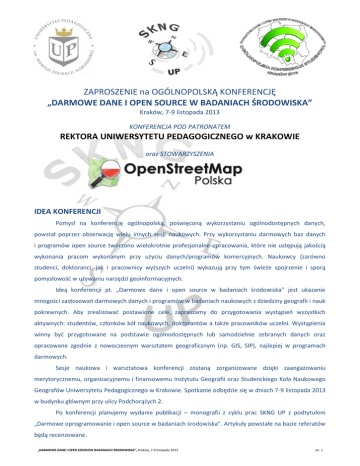ZAPROSZENIE na OGÓLNOPOLSKĄ KONFERENCJĘ „DARMOWE DANE I OPEN SOURCE W BADANIACH ŚRODOWISKA” Kraków, 7-9 listopada 2013 KONFERENCJA POD PATRONATEM REKTORA UNIWERSYTETU PEDAGOGICZNEGO w KRAKOWIE oraz STOWARZYSZENIA IDEA KONFERENCJI Pomysł na konferencję ogólnopolską, poświęconą wykorzystaniu ogólnodostępnych danych, powstał poprzez obserwację wielu innych sesji naukowych. Przy wykorzystaniu darmowych baz danych i programów open source tworzono wielokrotnie profesjonalne opracowania, które nie ustępują jakością wykonania pracom wykonanym przy użyciu danych/programów komercyjnych. Naukowcy (zarówno studenci, doktoranci, jak i pracownicy wyższych uczelni) wykazują przy tym świeże spojrzenie i sporą pomysłowość w używaniu narzędzi geoinformacyjnych. Ideą konferencji pt. „Darmowe dane i open source w badaniach środowiska” jest ukazanie mnogości zastosowań darmowych danych i programów w badaniach naukowych z dziedziny geografii i nauk pokrewnych. Aby zrealizować postawione cele, zapraszamy do przygotowania wystąpień wszystkich aktywnych: studentów, członków kół naukowych, doktorantów a także pracowników uczelni. Wystąpienia winny być przygotowane na podstawie ogólnodostępnych lub samodzielnie zebranych danych oraz opracowane zgodnie z nowoczesnym warsztatem geograficznym (np. GIS, SIP), najlepiej w programach darmowych. Sesje naukowa i warsztatowa konferencji zostaną zorganizowane dzięki zaangażowaniu merytorycznemu, organizacyjnemu i finansowemu Instytutu Geografii oraz Studenckiego Koła Naukowego Geografów Uniwersytetu Pedagogicznego w Krakowie. Spotkanie odbędzie się w dniach 7-9 listopada 2013 w budynku głównym przy ulicy Podchorążych 2. Po konferencji planujemy wydanie publikacji – monografii z cyklu prac SKNG UP z podtytułem „Darmowe oprogramowanie i open source w badaniach środowiska”. Artykuły powstałe na bazie referatów będą recenzowane. „DARMOWE DANE I OPEN SOURCEW BADANIACH ŚRODOWISKA”, Kraków, 7-9 listopada 2013 str. 1 ZACHĘCAMY DO WZIĘCIA UDZIAŁU W KONFERENCJI: - studentów i doktorantów, szczególnie kierunków geograficznych, ekonomicznych, technicznych i innych zainteresowanych problematyką konferencji, - pracowników naukowych i naukowo-dydaktycznych z kraju i zagranicy zajmujących się problematyką szeroko rozumianego GISu, - przedstawicieli fundacji i stowarzyszeń promujących dostęp do darmowych danych i wolnego oprogramowania, - przedstawicieli władz państwowych i samorządowych zainteresowanych rozwojem jednostek administracyjnych i gospodarką przestrzenną, - nauczycieli geografii, przedsiębiorczości, przyrody, informatyki przedmiotów ekonomicznych i innych mających w swoich programach treści związane z tematyką konferencji, - przedsiębiorców i innych praktyków życia gospodarczego, - wszystkie inne osoby zainteresowane problematyką konferencji. ZGŁOSZENIA Zgłoszenia prosimy nadsyłać do 31 lipca 2013. Sesja naukowa odbędzie się w dniach 7-8 XI 2013. Obrady rozpoczną się o godz. 10:00 w sali 532 sesją plenarną. W dniu 9 XI 2013 zaplanowano warsztaty. Planujemy kilka bloków tematycznych poświęconych takim programom jak: GRASS, QGIS, ILWIS oraz OpenStreetMap. W razie większego zainteresowania warsztatami niż pojemność naszych sal decydować będzie kolejność zgłoszeń. KOSZT Pełna opłata konferencyjna wynosi 150 zł i obejmuje: 2 noclegi, 2 obiady, poczęstunki w przerwach kawowych, materiały konferencyjne, publikację pokonferencyjną w Pracach SKNG UP oraz warsztaty. MIEJSCE OBRAD Instytut Geografii Uniwersytet Pedagogiczny w Krakowie ul. Podchorążych 2, sala 532 30-084 Kraków Współrzędne: 50°4'25.93", 19°54'30.83" Sekretarz Konferencji – Agnieszka Ślęzak Zgłoszenia i wszelką inną korespondencję prosimy kierować na [email protected] więcej informacji na stronie www.opengis.up.krakow.pl/ „DARMOWE DANE I OPEN SOURCEW BADANIACH ŚRODOWISKA”, Kraków, 7-9 listopada 2013 str. 2