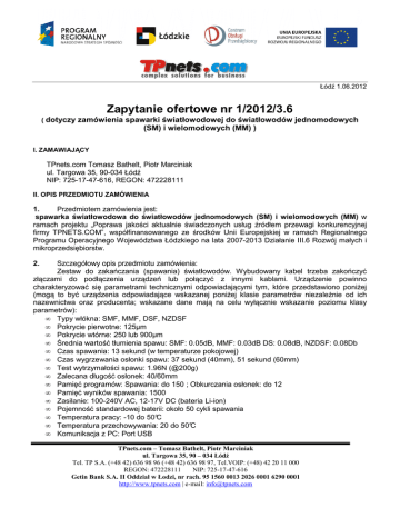 Łódź 1.06.2012 Zapytanie ofertowe nr 1/2012/3.6 ( dotyczy zamówienia spawarki światłowodowej do światłowodów jednomodowych (SM) i wielomodowych (MM) ) I. ZAMAWIAJĄCY TPnets.com Tomasz Bathelt, Piotr Marciniak ul. Targowa 35, 90-034 Łódź NIP: 725-17-47-616, REGON: 472228111 II. OPIS PRZEDMIOTU ZAMÓWIENIA 1. Przedmiotem zamówienia jest: spawarka światłowodowa do światłowodów jednomodowych (SM) i wielomodowych (MM) w ramach projektu „Poprawa jakości aktualnie świadczonych usług źródłem przewagi konkurencyjnej firmy TPNETS.COM”, współfinansowanego ze środków Unii Europejskiej w ramach Regionalnego Programu Operacyjnego Województwa Łódzkiego na lata 2007-2013 Działanie III.6 Rozwój małych i mikroprzedsiębiorstw. 2. Szczegółowy opis przedmiotu zamówienia: Zestaw do zakańczania (spawania) światłowodów. Wybudowany kabel trzeba zakończyć złączami do podłączenia urządzeń lub połączyć z innymi kablami. Urządzenie powinno charakteryzować się parametrami technicznymi odpowiadającymi tym, które przedstawiono poniżej (mogą to być urządzenia odpowiadające wskazanej poniżej klasie parametrów niezależnie od ich nazewnictwa oraz producenta; wskazane dane mają na celu wyłącznie wskazanie poziomu klasy parametrów): • Typy włókna: SMF, MMF, DSF, NZDSF • Pokrycie pierwotne: 125µm • Pokrycie wtórne: 250 lub 900µm • Średnia wartość tłumienia spawu: SMF: 0.05dB, MMF: 0.03dB DS: 0.08dB, NZDSF: 0.08Db • Czas spawania: 13 sekund (w temperaturze pokojowej) • Czas wygrzewania osłonki spawu: 37 sekund (40mm), 51 sekund (60mm) • Test wytrzymałości spawu: 1.96N (@200g) • Zalecana długość osłonek: 40/60mm • Pamięć programów: Spawania: do 150 ; Obkurczania osłonek: do 12 • Pamięć wyników spawania: 1500 • Zasilanie: 100-240V AC, 12-17V DC (bateria Li-ion) • Pojemność standardowej baterii: około 50 cykli spawania • Temperatura pracy: -10 do 50°C • Temperatura przechowywania: 20 do 50°C • Komunikacja z PC: Port USB TPnets.com – Tomasz Bathelt, Piotr Marciniak ul. Targowa 35, 90 – 034 Łódź Tel. TP S.A. (+48 42) 636 98 96 (+48 42) 636 98 97, Tel.VOIP: (+48) 42 20 11 000 REGON: 472228111 NIP: 725-17-47-616 Getin Bank S.A. II Oddział w Łodzi, nr rach. 95 1560 0013 2026 0001 6290 0001 http://www.tpnets.com | e-mail: [email protected] 3. 4. Zamawiający dopuszcza/niedopuszcza możliwości składania ofert częściowych. Zamawiający dopuszcza/niedopuszcza możliwości powierzenia części lub całości zamówienia podwykonawcom. III. TERMIN DOSTARCZENIA ZAMÓWIENIA Maksymalny termin dostarczenia przedmiotu zamówienia: do 1.12.2012 r. IV. OPIS SPOSOBU PRZYGOTOWANIA OFERTY Oferta powinna zawierać : - specyfikacje techniczną - oświadczenie o spełnianiu kryteriów zamówienia - ceny wyrażone w kwocie netto i brutto, - opatrzona danymi firmowymi, - posiadać datę sporządzenia, - zawierać dane teleadresowe , numer telefonu oraz numer NIP, V. MIEJSCE ORAZ TERMIN SKŁADANIA OFERT 1. Oferta powinna być przesłana / dostarczona za pośrednictwem ( do wyboru) : a) b) c) d) e) poczty elektronicznej na adres: [email protected] faksem na nr: 42 636 98 96, pocztą tradycyjną, kurierem osobiście na adres zamawiającego do dnia 29.06.2012 roku Ocena ofert zostanie dokonana w dniu 2.07.2012 roku a wyniki i wybór najkorzystniejszej oferty zostanie ogłoszony o godzinie 12:00 w siedzibie TPnets.com ul. Targowa 35 oraz na stronie internetowej pod adresem http://tpnets.com/?page_id=394 2. Oferty złożone po terminie nie będą rozpatrywane 3. Oferent może przed upływem terminu składania ofert zmienić lub wycofać swoją ofertę. 4. W toku badania i oceny ofert Zamawiający może żądać od oferentów wyjaśnień dotyczących treści złożonych ofert. Zapytanie ofertowe zamieszczono na stronie: http://tpnets.com/?page_id=394 VI. OCENA OFERT Zamawiający dokona oceny ważnych ofert na podstawie następujących kryteriów: 1. Spełnienie wymagań specyfikacji technicznej : 10 % 2. Cena - 80% 3. Okres gwarancji - 10% VII. INFORMACJE DOTYCZĄCE WYBORU NAJKORZYSTNIEJSZEJ OFERTY O wyborze najkorzystniejszej oferty Zamawiający zawiadomi oferentów za pośrednictwem strony internetowej znajdującej się pod adresem http://tpnets.com/?page_id=394 VIII. DODATKOWE INFORMACJE Dodatkowych informacji udziela Tomasz Bathelt/Beata Bajer pod numerem telefonu 42 636 98 96 lub 42 636 98 97 oraz adresem email: [email protected] TPnets.com – Tomasz Bathelt, Piotr Marciniak ul. Targowa 35, 90 – 034 Łódź Tel. TP S.A. (+48 42) 636 98 96 (+48 42) 636 98 97, Tel.VOIP: (+48) 42 20 11 000 REGON: 472228111 NIP: 725-17-47-616 Getin Bank S.A. II Oddział w Łodzi, nr rach. 95 1560 0013 2026 0001 6290 0001 http://www.tpnets.com | e-mail: [email protected]