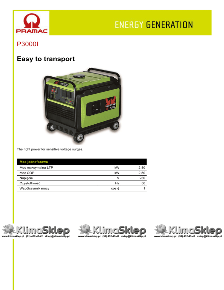 P3000I Easy to transport The right power for sensitive voltage surges. Moc jednofazowa Moc maksymalna LTP kW 2.80 Moc COP kW 2.50 Napięcie Częstotliwość Współczynnik mocy V 230 Hz 50 cos ϕ 1 Dane silnika Producent silnika Robin-Subaru Type Pojemność EX170 cm³ Cylindrów Power Max 169 1 inclined kW Paliwo 4.0 Petrol Zasysanie Wolnossący System chłodzenia silnika Powietrza System rozruchu Ręczny Moc Moc g/kWh 360 Consumption at 75% of load l/h 1.25 Pojemność zbiornika paliwa l 10.8 h 8.6 Acoustic power LWA dB(A) 90 Acoustic pressure at 7m dB(A) 58 (L) mm 537 Szerokość (W) mm 482 Wysokość (H) mm 583 Kg 54 Czas pracy przy 75% mocy COP Poziom hałasu Dane wymiarowe Długość Waga (suchy) Panel Sterowania Woltomierz ● Licznik motogodzin ● Częstotliwościomierz ● Economiser ● Fuel gauge ● Wheels and handles ● Ładowarka akumulatora (12V 8.3A) GNIAZDA ● 2 SCHUKO 230V 16A Zabezpieczenie Czujnik braku oleju ● Zwarcie ● Przeciążenie ● Zatrzymanie spowodowane nadobrotami ● Przed przegrzaniem ● ● : Standard ● : Standard KLIMASKLEP ul. Orzechowa 3 72-010 Przęsocin k/Szczecina tel.: (91) 432-43-42 tel.: (91) 432-43-49 e-mail: [email protected] www: www.KlimaSklep.pl Printed on 25/07/2015 (ID 2306) ©2012 | PR INDUSTRIAL s.r.l. | All rights reserved | Image shown may not reflect actual package. Specifications subject to change without notice | ENERGY GENERATION is registered trademarks of PR INDUSTRIAL s.r.l. Other company, product or service names may be trademarks or service marks of others. RevA (06/2012).