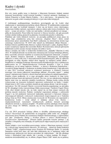 Kadry i dymki Piotr Kasiński Kto wie, może grałby teraz w drużynie z Marcinem Gortatem. Jednak zamiast trenować koszykówkę, wolał rysować komiksy i tworzyć animacje. Studiujący w Szkole Filmowej w Łodzi Marcin Podolec – bo o nim mowa – do pokaźnej listy sukcesów na polu sztuk wizualnych dołożył w tym roku kilka kolejnych. Z rodzinnego podkarpackiego Jarosławia przyciągnęła go do Łodzi chęć studiowania w najsłynniejszej polskiej szkole filmowej. W październiku rozpocznie piąty rok zajęć na wydziale animacji. I choć ma na koncie cztery interesujące, animowane krótkie metraże, największe sukcesy odnosi jako twórca komiksów. Jak mówi – rysuje od zawsze. I tylko raz nad kartkę i ołówek przedłożył coś innego – piłkę do koszykówki. Przez kilka lat trenował w Zniczu Jarosław, ale gdy przyszło wybrać szkołę średnią, postawił na plastykę i koszykówka poszła w odstawkę. Podobnie jak wielu młodych twórców, na początku publikował swoje prace na blogu. Jego sztandarową serią był wówczas „Kapitan Sheer”, który został dostrzeżony przez amerykański Top Shelf i pokazany na internetowej stronie tego cenionego wydawnictwa. W 2010 roku ukazał się debiutancki album Marcina – Kultura Gniewu opublikowała zbiorcze wydanie historyjek z cyklu „Kapitan Sheer” (część scenariuszy napisał dla rysownika Robert Wyrzykowski), których głównymi bohaterami są dwa szczury toczące dysputy nie tylko o życiu. Sława i uznanie, nie tylko w środowisku komiksowym, „dopadły” Marcina w roku 2012. W mediach ukazały się niezliczone entuzjastyczne recenzje kolejnego albumu, który rysownik, stworzył wspólnie ze scenarzystą Grzegorzem Januszem. „Czasem” (wyd. Kultura Gniewu) opowiada o mężczyźnie dokonującym niezwykłego odkrycia w starej willi oraz o nieoczekiwanych konsekwencjach, jakie to odkrycie pociągnęło za sobą. Komiks zdobył dwie nagrody za najlepszy polski album – triumfował w rankingu Polskiego Stowarzyszenia Komiksowego oraz w plebiscycie publiczności na 23. Międzynarodowym Festiwalu Komiksu i Gier w Łodzi (dodatkowo, na tej samej imprezie, Podolec – w duecie z Robertem Popieleckim – wywalczył drugą nagrodę w konkursie na krótką formę komiksową). Ciąg sukcesów w roku 2012 rysownik zakończył wydaniem (ponownie w Kulturze Gniewu) trzeciego, tym razem całkowicie autorskiego albumu „Wszystko zajęte” – pełnej emocji i tajemniczości historii o dwóch braciach prowadzących zakład pogrzebowy. Podolec często podkreśla, że w jego przypadku okres studencki to etap życia, podczas którego może jak najwięcej rysować. Nie wie, czy po zakończeniu edukacji będzie miał czas na autorskie projekty komiksowe. Dlatego każdą wolną chwilę wykorzystuje na tworzenie kolejnych opowieści rozłożonych na kadry i dymki. Dzięki temu w 2013 roku czytelnicy dostali do rąk kolejne dzieło. I jak do tej pory – największe. Na 240 stronach Marcin wyrysował historię popularnego na początku lat 90. ubiegłego wieku warszawskiego klubu muzycznego. Tytułowy Fugazi Music Club, choć działał niecały rok, na stałe wpisał się na listę miejsc ważnych dla polskiej muzyki rockowej. Podolec wysłuchał wspomnień jednego z założycieli Fugazi i na ich podstawie narysował znakomitą opowieść o barwnym miejscu, interesujących ludziach i ciekawych wydarzeniach rozgrywających się w budynku byłego kina na Woli. Mimo artystycznej wycieczki do Warszawy nie zapomniał o komiksowej Łodzi i wziął udział w kolejnej edycji City Stories – międzynarodowych warsztatów komiksowych, podczas których powstają obrazkowe nowele o „mieście prządek”. W polsko-czeskiej antologii, która ukazała się przy okazji 24. MFKiG, znalazły się aż trzy historyjki narysowane przez Marcina. Czy rok 2014 przyniesie kolejny album w dorobku utalentowanego młodego twórcy? Oczywiście! W październiku na księgarskie półki trafić ma „Podgląd”, narysowany przez Podolca do scenariusza Daniela Chmielewskiego, a zapowiadany jest jako „komiksowy dialog z Krótkim filmem o miłości Kieślowskiego i Powiększeniem Antonioniego”. Historia będzie poruszała kwestie pamięci i jej związku z fotografią oraz tematykę ról społecznych odgrywanych przez mężczyzn i kobiety. Zanim jednak o tym wszystkim przeczytamy, razem z Marcinem możemy cieszyć się z innych jego tegorocznych sukcesów. Po pierwsze – dotarł do finału konkursu „Talenty Trójki”, organizowanego przez Program III Polskiego Radia. Co prawda laureatem został ktoś inny, ale sam fakt znalezienia się w najlepszej trójce tak prestiżowego plebiscytu jest dużym powodem do zadowolenia – tak dla młodego twórcy i miłośników jego talentu, jak i uczelni, w której studiuje. Po drugie – niedawno dowiedzieliśmy się, że album „Fugazi Music Club” ukaże się za granicą. Prawa do wydania komiksu kupiły dwa wydawnictwa: francuski Gallimard Jeunesse i włoskie Bao Publishing. Premiery zapowiadają na wiosnę przyszłego roku. Jak mówi autor: – Nakład tylko francuskiej wersji będzie większy niż suma wszystkich egzemplarzy moich czterech komiksów wydanych w Polsce. A to nie koniec – wiele wskazuje na to, że „Fugazi” ukaże się też w innych krajach. Wbrew pozorom nie to jednak Marcin uznaje za swój największy sukces. Najbardziej dumny jest z tego, że dzięki rysowaniu komiksów poznał swoją obecną dziewczynę. Na nadmiar wolnego czasu nie narzeka, ale zawsze znajdzie chwilę, by oddać się dobrej lekturze – ostatnio najczęściej sięga po książki Cormaca McCarthy’ego, Juliana Barnesa i Herty Müller oraz opracowania o architekturze. Przyznaje, że komiksów nie kupuje zbyt dużo, a najbardziej inspirują go twórcy włoscy – Fior, Gipi i Igort. Aby utrzymać dobrą formę, wciąż rekreacyjnie grywa w koszykówkę albo wędruje po Bieszczadach. Gdy siada do rysowania, z głośni