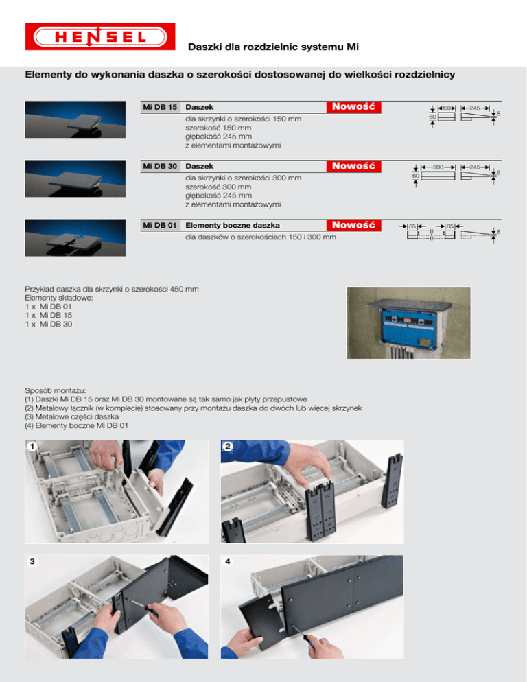Daszki dla rozdzielnic systemu Mi Elementy do wykonania daszka o szerokości dostosowanej do wielkości rozdzielnicy Mi DB 15 Nowość Daszek ��� Mi DB 30 Nowość Daszek Elementy boczne daszka Nowość dla daszków o szerokościach 150 i 300 mm Przykład daszka dla skrzynki o szerokości 450 mm Elementy składowe: 1 x Mi DB 01 1 x Mi DB 15 1 x Mi DB 30 Sposób montażu: (1) Daszki Mi DB 15 oraz Mi DB 30 montowane są tak samo jak płyty przepustowe (2) Metalowy łącznik (w komplecie) stosowany przy montażu daszka do dwóch lub więcej skrzynek (3) Metalowe części daszka (4) Elementy boczne Mi DB 01 1 2 3 4 ��� ��� �� dla skrzynki o szerokości 300 mm szerokość 300 mm głębokość 245 mm z elementami montażowymi Mi DB 01 ��� �� dla skrzynki o szerokości 150 mm szerokość 150 mm głębokość 245 mm z elementami montażowymi �� �� � � � Daszki dla rozdzielnic systemu Enystar Elementy do wykonania daszka o szerokości dostosowanej do wielkości rozdzielnicy FP DB 27 Nowość Daszek ��� dla obudowy o szerokości 270 mm szerokość 270 mm głębokość 245 mm z elementami montażowymi FP DB 36 Nowość Daszek Elementy boczne daszka Nowość dla daszków o szerokościach 270 i 360 mm Przykład daszka dla rozdzielnicy o szerokości 546 mm Elementy składowe: 1 x Mi DB 01 2 x FP DB 27 Sposób montażu: (1) Daszki FP DB 27 oraz FP DB 36 montowane są tak samo jak ścianki boczne (2) Metalowy łącznik (w komplecie) stosowany przy montażu daszka do dwóch lub więcej obudów (3) Metalowe części daszka (4) Elementy boczne Mi DB 01 1 2 3 4 ��� ��� �� dla obudowy o szerokości 360 mm szerokość 360 mm głębokość 245 mm z elementami montażowymi Mi DB 01 ��� �� �� �� � � �
