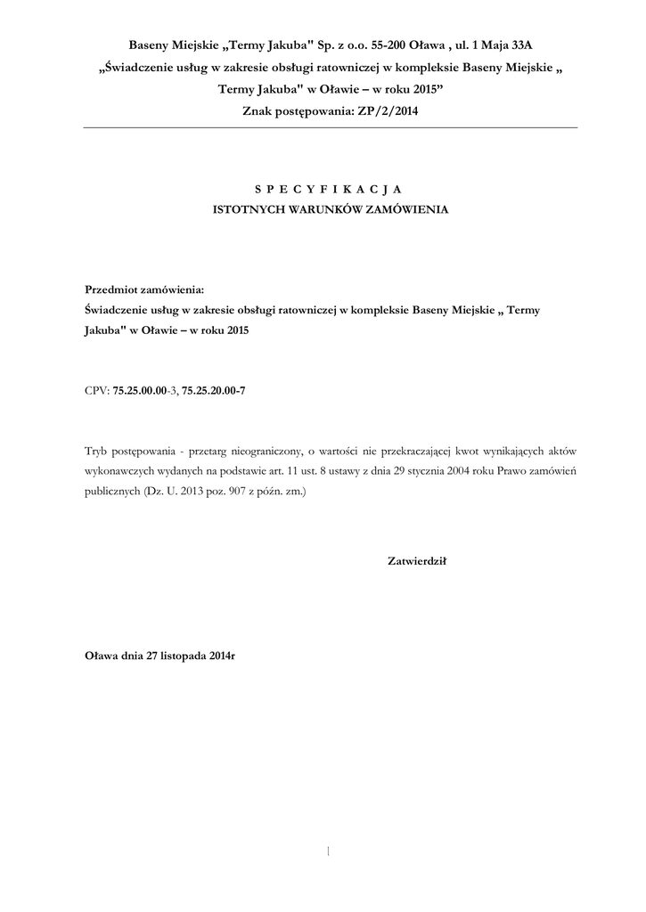 Baseny Miejskie „Termy Jakuba" Sp. z o.o. 55-200 O awa , ul. 1 Maja 33A wiadczenie us ug w zakresie obs ugi ratowniczej w kompleksie Baseny Miejskie „ Termy Jakuba" w O awie – w roku 2015” Znak post powania: ZP/2/2014 S P E C Y F I K A C J A ISTOTNYCH WARUNKÓW ZAMÓWIENIA Przedmiot zamówienia: wiadczenie us ug w zakresie obs ugi ratowniczej w kompleksie Baseny Miejskie „ Termy Jakuba" w O awie – w roku 2015 CPV: 75.25.00.00-3, 75.25.20.00-7 Tryb post powania - przetarg nieograniczony, o warto ci nie przekraczaj cej kwot wynikaj cych aktów wykonawczych wydanych na podstawie art. 11 ust. 8 ustawy z dnia 29 stycznia 2004 roku Prawo zamówie publicznych (Dz. U. 2013 poz. 907 z pó n. zm.) Zatwierdzi awa dnia 27 listopada 2014r 1 Baseny Miejskie „Termy Jakuba" Sp. z o.o. 55-200 O awa , ul. 1 Maja 33A wiadczenie us ug w zakresie obs ugi ratowniczej w kompleksie Baseny Miejskie „ Termy Jakuba" w O awie – w roku 2015” Znak post powania: ZP/2/2014 Specyfikacja istotnych warunków zamówienia zawiera: I. Nazw oraz adres zamawiaj cego. Informacje ogólne; II. Tryb udzielenia zamówienia; III. Opis przedmiotu zamówienia; IV. Termin wykonania zamówienia; V. Warunki udzia u w post powaniu oraz opis sposobu dokonywania oceny spe niania tych warunków; VI. Wykaz o wiadcze lub dokumentów, jakie maj dostarczy wykonawcy w celu potwierdzenia spe niania warunków udzia u w post powaniu; VII. Informacje o sposobie porozumiewania si zamawiaj cego z wykonawcami oraz przekazania o wiadcze lub dokumentów, a tak e wskazanie osób uprawnionych do porozumiewania si z wykonawcami; VIII. Wymagania dotycz ce wadium: IX. Termin zwi zania ofert : X. Opis sposobu przygotowania ofert: XI. Miejsce oraz termin sk adania i otwarcia ofert; XII. Opis sposobu obliczenia ceny; XIII. Opis kryteriów, którymi zamawiaj cy b dzie si kierowa przy wyborze oferty, wraz z podaniem znaczenia tych kryteriów oraz sposobu oceny ofert; XIV. Informacje o formalno ciach, jakie powinny zosta dope nione po wyborze oferty w celu zawarcia umowy w sprawie zamówienia publicznego; XV. Istotne dla stron postanowienia, które zostan wprowadzone do tre ci zawieranej umowy w sprawie zamówienia publicznego, ogólne warunki umowy albo wzór umowy, je eli zamawiaj cy wymaga od wykonawcy, aby zawar z nim umow w sprawie zamówienia publicznego na takich warunkach; XVI. Wymagania dotycz ce zabezpieczenia nale ytego wykonania umowy; XVII. Pouczenie o rodkach ochrony prawnej przys uguj cych wykonawcy w toku post powania o udzielenie zamówienia; XVIII. Poprawianie omy ek; XIX. Dodatkowe postanowienia specyfikacji; XX. Postanowienia ko cowe. 2 Baseny Miejskie „Termy Jakuba" Sp. z o.o. 55-200 O awa , ul. 1 Maja 33A wiadczenie us ug w zakresie obs ugi ratowniczej w kompleksie Baseny Miejskie „ Termy Jakuba" w O awie – w roku 2015” Znak post powania: ZP/2/2014 I. Nazwa oraz adres zamawiaj cego. Informacje ogólne; Zamawiaj cy: Baseny Miejskie „Termy Jakuba" Sp zo.o., 55-200 O awa, ul. 1 Maja 33A KRS0000424430, NIP 9121872850 Regon 021890799 www.termyjakuba.olawa.pl, e.mail: [email protected] Tel: (71) 306 71 00 1. Og oszenie o zamówieniu umieszczone zosta o: - w Biuletynie Zamówie Publicznych pod numerem 389744 z dnia 27.11.2014 r. to do usuni cia? - na tablicy og osze oraz w BIP na stronie internetowej - www.termyjakuba.olawa.pl 2. Specyfikacja Istotnych Warunków Zamówienia udost pniona zosta a na stronie internetowej od dnia zamieszczenia og oszenia o zamówieniu w Biuletynie Zamówie Publicznych do up ywu terminu sk adania ofert. 3. Godziny urz dowania Zamawiaj cego: od poniedzia ku do pi tku od godz. 7:30 do 15:30. 4. Post powanie prowadzone jest zgodnie z ustaw z dnia 29 stycznia 2004 r. Prawo zamówie publicznych (tekst jednolity Dz. U. z 2013 r. poz. 907 z pó n.zm.) zwan dalej ustaw lub Pzp 5. Do czynno ci podejmowanych przez Zamawiaj cego i Wykonawc stosuje si przepisy ustawy z dnia 23 kwietnia 1964r. - Kodeks cywilny (Dz.U. nr 16, poz. 93 z pó n. zm.), je eli przepisy ustawy Pzp nie stanowi inaczej. 6. Jako podstawowy dokument do sporz dzenia ofert nale y traktowa niniejsz Specyfikacj wraz z za cznikami. 7. Na strome internetowej www.termyjakuba.olawa.pl zamieszczono: - SIWZ wraz ze wszystkimi za cznikami II. Tryb udzielenia zamówienia; Post powanie o udzielenie zamówienia publicznego prowadzone jest w trybie przetargu nieograniczonego, o warto ci nie przekraczaj cej kwot wynikaj cych aktów wykonawczych wydanych na podstawie art. 11 ust. 8 ustawy z dnia 29 stycznia 2004 roku Prawo zamówie publicznych ( Dz.U. z 2013 r. poz.907, z pó n. zm.) III. Opis przedmiotu zamówienia. 3 Baseny Miejskie „Termy Jakuba" Sp. z o.o. 55-200 O awa , ul. 1 Maja 33A wiadczenie us ug w zakresie obs ugi ratowniczej w kompleksie Baseny Miejskie „ Termy Jakuba" w O awie – w roku 2015” Znak post powania: ZP/2/2014 1. Przedmiotem zamówienia jest bie ce wiadczenie us ug zwi zanych z obs ug ratownicz krytej ywalni w sk ad której wchodz : - basen p ywacki- o wymiarach 25mxl6m , g boko ci od l,35m do l,8m. z 6-cioma torami ywackimi, - basen rekreacyjny z atrakcjami wodnymi- nieregularny pow. lustra wody 187,4 m2., g boko ci od l,05 m do l,20m, po czony z niecka do nauki p ywania o wymiarach 6mxl2,5m z 3-ma torami ywackimi, - brodzik dla dzieci- pow. lustra wody 39,37 m2.g boko do 0,45 m. - dwie wanny hydromasa u- pow. lustra wody 2x2,46 m2.g boko - zje lm. alnia o d ugo ci 70,8m z wann hamown . w kompleksie Baseny Miejskie „Termy Jakuba" Sp. z o.o. ul. 1 Maja 33a, 55-200 O awa. 2. Obiekt funkcjonuje codziennie w godz.: 6.00- 22.00 od poniedzia ku do pi tku i w godz.8.00-22.00 w soboty i niedziele za wyj tkiem nast puj cych dni: Wielkanoc ( l-szy dzie ), Wszystkich wi tych, Wigilia, Bo e Narodzenie ( l-szy dzie ) i tzw. przerwy technologicznej w pracy obiektu. 3. Zamawiaj cy wymaga aby us uga ratownicza sprawowana by a w godzinach funkcjonowania obiektu, przez 3 ratowników na ka dej zmianie. 4. Zamawiaj cy zastrzega sobie pra