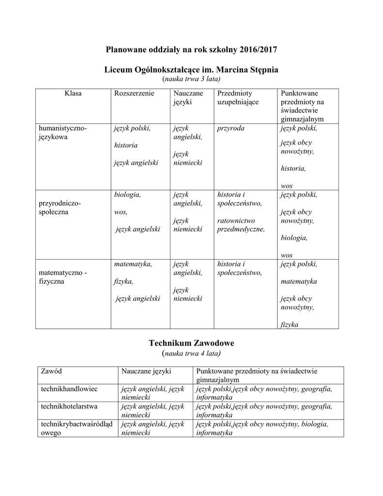 Planowane oddziały na rok szkolny 2016/2017 Liceum