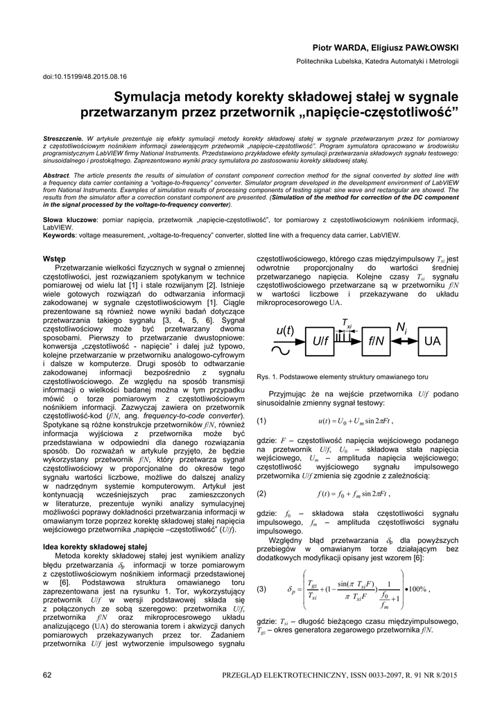 Piotr WARDA, Eligiusz PAWŁOWSKI Politechnika Lubelska, Katedra Automatyki i Metrologii doi:10.15199/48.2015.08.16 Symulacja metody korekty składowej stałej w sygnale przetwarzanym przez przetwornik „napięcie-częstotliwość” Streszczenie. W artykule prezentuje się efekty symulacji metody korekty składowej stałej w sygnale przetwarzanym przez tor pomiarowy z częstotliwościowym nośnikiem informacji zawierającym przetwornik „napięcie-częstotliwość”. Program symulatora opracowano w środowisku programistycznym LabVIEW firmy National Instruments. Przedstawiono przykładowe efekty symulacji przetwarzania składowych sygnału testowego: sinusoidalnego i prostokątnego. Zaprezentowano wyniki pracy symulatora po zastosowaniu korekty składowej stałej. Abstract. The article presents the results of simulation of constant component correction method for the signal converted by slotted line with a frequency data carrier containing a “voltage-to-frequency” converter. Simulator program developed in the development environment of LabVIEW from National Instruments. Examples of simulation results of processing components of testing signal: sine wave and rectangular are showed. The results from the simulator after a correction constant component are presented. (Simulation of the method for correction of the DC component in the signal processed by the voltage-to-frequency converter). Słowa kluczowe: pomiar napięcia, przetwornik „napięcie-częstotliwość”, tor pomiarowy z częstotliwościowym nośnikiem informacji, LabVIEW. Keywords: voltage measurement, „voltage-to-frequency” converter, slotted line with a frequency data carrier, LabVIEW. Wstęp Przetwarzanie wielkości fizycznych w sygnał o zmiennej częstotliwości, jest rozwiązaniem spotykanym w technice pomiarowej od wielu lat [1] i stale rozwijanym [2]. Istnieje wiele gotowych rozwiązań do odtwarzania informacji zakodowanej w sygnale częstotliwościowym [1]. Ciągle prezentowane są również nowe wyniki badań dotyczące przetwarzania takiego sygnału [3, 4, 5, 6]. Sygnał częstotliwościowy może być przetwarzany dwoma sposobami. Pierwszy to przetwarzanie dwustopniowe: konwersja „częstotliwość - napięcie” i dalej już typowo, kolejne przetwarzanie w przetworniku analogowo-cyfrowym i dalsze w komputerze. Drugi sposób to odtwarzanie zakodowanej informacji bezpośrednio z sygnału częstotliwościowego. Ze względu na sposób transmisji informacji o wielkości badanej można w tym przypadku mówić o torze pomiarowym z częstotliwościowym nośnikiem informacji. Zazwyczaj zawiera on przetwornik częstotliwość-kod (f/N, ang. frequency-to-code converter). Spotykane są różne konstrukcje przetworników f/N, również informacja wyjściowa z przetwornika może być przedstawiana w odpowiedni dla danego rozwiązania sposób. Do rozważań w artykule przyjęto, że będzie wykorzystany przetwornik f/N, który przetwarza sygnał częstotliwościowy w proporcjonalne do okresów tego sygnału wartości liczbowe, możliwe do dalszej analizy w nadrzędnym systemie komputerowym. Artykuł jest kontynuacją wcześniejszych prac zamieszczonych w literaturze, prezentuje wyniki analizy symulacyjnej możliwości poprawy dokładności przetwarzania informacji w omawianym torze poprzez korektę składowej stałej napięcia wejściowego przetwornika „napięcie –częstotliwość” (U/f). Idea korekty składowej stałej Metoda korekty składowej stałej jest wynikiem analizy błędu przetwarzania p informacji w torze pomiarowym z częstotliwościowym nośnikiem informacji przedstawionej w [6]. Podstawowa struktura omawianego toru zaprezentowana jest na rysunku 1. Tor, wykorzystujący przetwornik U/f w wersji podstawowej składa się z połączonych ze sobą szeregowo: przetwornika U/f, przetwornika f/N oraz mikroprocesrowego układu analizującego (UA) do sterowania torem i akwizycji danych pomiarowych przekazywanych przez tor. Zadaniem przetwornika U/f jest wytworzenie impulsowego sygnału 62 częstotliwościowego, którego czas międzyimpulsowy Txi jest odwrotnie proporcjonalny do wartości średniej przetwarzanego napięcia. Kolejne czasy Txi sygnału częstotliwościowego przetwarzane są w przetworniku f/N w wartości liczbowe i przekazywane do układu mikroprocesorowego UA. u(t) Txi U/f f/N Ni UA Rys. 1. Podstawowe elementy struktury omawianego toru Przyjmując że na wejście przetwornika U/f podano sinusoidalnie zmienny sygnał testowy: (1) u (t ) U 0 U m sin 2Ft , gdzie: F – częstotliwość napięcia wejściowego podanego na przetwornik U/f, U0 – składowa stała napięcia wejściowego, Um – amplituda napięcia wejściowego; częstotliwość wyjściowego sygnału impulsowego przetwornika U/f zmienia się zgodnie z zależnością: (2) f (t ) f 0 f m sin 2Ft , gdzie: f0 – składowa stała częstotliwości sygnału impulsowego, fm – amplituda częstotliwości sygnału impulsowego. Względny błąd przetwarzania p dla powyższych przebiegów w omawianym torze działającym bez dodatkowych modyfikacji opisany jest wzorem [6]: (3) Tgz sin( Txi F ) 1 p ) 100% , (1 f0 T Txi F 1 xi fm gdzie: Txi – długość bieżącego czasu międzyimpulsowego, Tgz – okres generatora zegarowego przetwornika f/N. PRZEGLĄD ELEKTROTECHNICZNY, ISSN 0033-2097, R. 91 NR 8/2015 Z analizy zależności (3) można wysnuć wniosek, że wzrost stosunku f0 do fm zmniejsza wprowadzaną przez tor wartość błędu p. Można przyjąć, że czas Txi sygnału wyjściowego przetwornika U/f jest odwrotnie proporcjonalny do całki napięcia u(t) podanego na ten przetwornik [8]: (4) 1 Txi K u (t )dt t i 1 ti 1 , gdzie K – stała przetwarzania przetwornika U/f, ti-1, ti – chwila rozpoczęcia i zakończenia Txi na osi czasu. Można wnioskować, że zarówno składowa stała f0 jak i amplituda fm częstotliwości wyjściowego sygnału impulsowego przetwornika U/f są proporcjonalne do składowej stałej U0 i amplitudy Um wejściowe