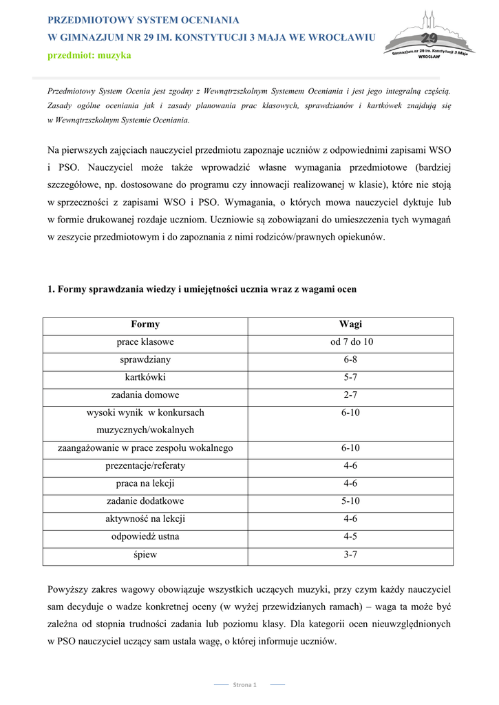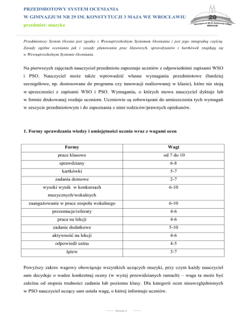 PRZEDMIOTOWY SYSTEM OCENIANIA W GIMNAZJUM NR 29 IM. KONSTYTUCJI 3 MAJA WE WROCŁAWIU przedmiot: muzyka Przedmiotowy System Ocenia jest zgodny z Wewnątrzszkolnym Systemem Oceniania i jest jego integralną częścią. Zasady ogólne oceniania jak i zasady planowania prac klasowych, sprawdzianów i kartkówek znajdują się w Wewnątrzszkolnym Systemie Oceniania. Na pierwszych zajęciach nauczyciel przedmiotu zapoznaje uczniów z odpowiednimi zapisami WSO i PSO. Nauczyciel może także wprowadzić własne wymagania przedmiotowe (bardziej szczegółowe, np. dostosowane do programu czy innowacji realizowanej w klasie), które nie stoją w sprzeczności z zapisami WSO i PSO. Wymagania, o których mowa nauczyciel dyktuje lub w formie drukowanej rozdaje uczniom. Uczniowie są zobowiązani do umieszczenia tych wymagań w zeszycie przedmiotowym i do zapoznania z nimi rodziców/prawnych opiekunów. 1. Formy sprawdzania wiedzy i umiejętności ucznia wraz z wagami ocen Formy Wagi prace klasowe od 7 do 10 sprawdziany 6-8 kartkówki 5-7 zadania domowe 2-7 wysoki wynik w konkursach 6-10 muzycznych/wokalnych zaangażowanie w prace zespołu wokalnego 6-10 prezentacje/referaty 4-6 praca na lekcji 4-6 zadanie dodatkowe 5-10 aktywność na lekcji 4-6 odpowiedź ustna 4-5 śpiew 3-7 Powyższy zakres wagowy obowiązuje wszystkich uczących muzyki, przy czym każdy nauczyciel sam decyduje o wadze konkretnej oceny (w wyżej przewidzianych ramach) – waga ta może być zależna od stopnia trudności zadania lub poziomu klasy. Dla kategorii ocen nieuwzględnionych w PSO nauczyciel uczący sam ustala wagę, o której informuje uczniów. Strona 1 PRZEDMIOTOWY SYSTEM OCENIANIA W GIMNAZJUM NR 29 IM. KONSTYTUCJI 3 MAJA WE WROCŁAWIU przedmiot: muzyka 2. Zasady oceniania prac klasowych i sprawdzianów Liczba zdobytych punktów w procentach ocena 100%-90% 5 89%-85% 5- 89%-85% 4+ 79%-75% 4 74%- 70% 4- 69% - 65% 3+ 64%-60%- 3 59%- 55%- 3- 54% - 45% 2+ 44%- 37%- 2 36%- 30% 2- 29% - 0% 1 Ocenę celującą otrzymuje uczeń, który uzyskał ocenę bardzo dobrą i poprawnie rozwiązał zadania dodatkowe. Nie wszystkie prace kontrolne są oceniane w tej skali, część sprawdzianów i kartkówek jest oceniana w skali bardzo dobry – niedostateczny. Nie wszystkie prace są punktowane, za część prac nauczyciel wystawia ocenę i uzasadnia ją w formie pisemnej lub ustnej. 3. Liczba dopuszczalnych nieprzygotowań (na semestr) : 1 4. Wymagania edukacyjne na poszczególne oceny semestralne i roczne ocena celująca Uczeń i powinien umiejętności w opanować zakresie wiedzę rozszerzonym w stosunku do proponowanego materiału Strona 2 PRZEDMIOTOWY SYSTEM OCENIANIA W GIMNAZJUM NR 29 IM. KONSTYTUCJI 3 MAJA WE WROCŁAWIU przedmiot: muzyka nauczania, odnosić sukcesy w fakultatywnych zespołach muzycznych, konkursach, itp., a także posiada wszystkie wymagane oceny z prac pisemnych. ocena bardzo dobra Uczeń i powinien umiejętności w opanować wiedzę zakresie pełnym w stosunku do proponowanego materiału nauczania i posiada wszystkie wymagane oceny z prac pisemnych. ocena dobra Ocenę dobrą otrzymuje uczeń, który: - w dużym zakresie opanował wiadomości określone programem nauczania; - potrafi zastosować zdobyte wiadomości do rozwiązywania zadań typowych lub problemowych; - aktywnie pracuje w czasie zajęć lekcyjnych. ocena dostateczna Ocenę dostateczną otrzymuje uczeń, który: - opanował wiadomości w i zakresie podstawowym umiejętności określone programem nauczania; - wykazuje przedmiotem, minimalne odrabia zainteresowanie zadania domowe, jest czasami aktywny. ocena dopuszczająca Ocenę dopuszczającą otrzymuje uczeń, który: - posiada braki i umiejętnościach w wiadomościach określonych programem nauczania; - nie wykazuje większego zainteresowania przedmiotem. ocena niedostateczna Ocenę niedostateczną stawia się uczniowi w zupełnie wyjątkowych przypadkach jawnego lekceważenia przedmiotu. Strona 3 PRZEDMIOTOWY SYSTEM OCENIANIA W GIMNAZJUM NR 29 IM. KONSTYTUCJI 3 MAJA WE WROCŁAWIU przedmiot: muzyka Osiągnięcia ucznia w zakresie aktywności twórczej zależą nie tylko od jego sumienności i pracowitości, lecz są związane przede wszystkim z wrodzonymi uzdolnieniami, które trudno zmierzyć, a jeszcze trudniej sprawiedliwie ocenić. W tej sytuacji najrozsądniejsze wydaje się zsumowanie oceny z wiadomości o muzyce i oceny z osiągnięć artystycznych ucznia. Należy równocześnie obserwować zaangażowanie, staranność i dyscyplinę pracy, które to cechy powinny być docenione nawet przy słabszych osiągnięciach artystycznych. Zgodnie z rozporządzeniem Ministra Edukacji Narodowej z dnia 30 kwietnia 2013 roku w sprawie zasad udzielania i organizacji pomocy psychologiczno-pedagogicznej w publicznych przedszkolach, szkołach i placówkach (Dz.U. 2013 poz. 532) przy ocenianiu uczniów uwzględnia się zalecenia wynikające z opracowanych indywidualnych lub grupowych programów pomocy psychologiczno-pedagogicznej oraz Indywidualnych Programów Edukacyjno – Terapeutycznych. 5. Klasyfikacja semestralna i roczna Przy ustalaniu oceny klasyfikacyjnej z zajęć edukacyjnych nauczyciel kieruje się zasadami wyszczególnionymi w WSO. W sytuacji, gdy uczeń uzyskał oceny ze wszystkich obowiązkowych form sprawdzania wiedzy i umiejętności, ocena klasyfikacyjna nie może być niższa od średniej ważonej: ocena dopuszczająca – od 1,60 ocena dostateczna – od 2,60 ocena dobra – od 3,60 ocena bardzo dobra - od 4,60 ocena celująca – nie obowiązuje 6. Zmiany w PSO dokonywane są na wniosek członków zespołu przedmiotowego na podstawie ewaluacji PSO i WSO oraz pojawiających się zmian w przepisach prawa oświatowego mających wpływ na ocenianie, klasyfikowanie i promowanie uczniów. Strona 4