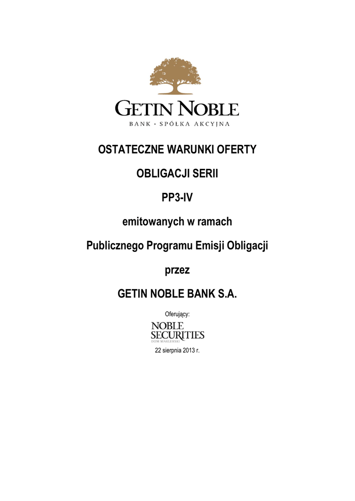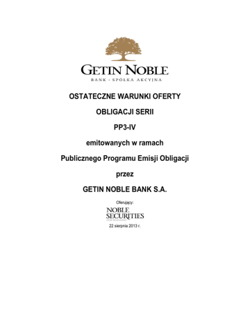 OSTATECZNE WARUNKI OFERTY OBLIGACJI SERII PP3-IV emitowanych w ramach Publicznego Programu Emisji Obligacji przez GETIN NOBLE BANK S.A. Oferujący: 22 sierpnia 2013 r. OŚWIADCZENIE Emitent zwraca uwagę, że pełne informacje na temat Emitenta i Oferty Obligacji można uzyskać wyłącznie na podstawie zestawienia Prospektu, Podstawowych Warunków Emisji oraz niniejszych Ostatecznych Warunków Oferty Serii PP3-IV i ewentualnych aneksów do Prospektu i komunikatów aktualizujących. Prospekt wraz z Podstawowymi Warunkami Emisji został udostępniony do publicznej wiadomości w dniu 13 maja 2013 roku. Z Prospektem zapoznać się można na stronie internetowej Emitenta www.gnb.pl oraz Oferującego www.noblesecurities.pl Wszelkie wyrażenia pisane w niniejszym dokumencie wielką literą mają znaczenie przypisane im w Prospekcie. 1 PODSTAWOWE DANE DOTYCZĄCE PUBLICZNEJ OFERTY OBLIGACJI SERII PP3-IV Ostateczne Warunki Oferty Serii PP3-IV przygotowane zostały w związku z emisją Obligacji Serii PP3IV dokonaną na podstawie uchwały Zarządu Getin Noble Bank S.A. z dnia 20 sierpnia 2013. Łączna wartość nominalna emitowanych na podstawie niniejszych Ostatecznych Warunków Oferty Obligacji Serii PP3-IV wynosi nie więcej niż 15.000.000 zł (słownie: piętnaście milionów złotych). Wielkość minimalnej liczby Obligacji Serii PP3-IV objętej zapisem wynosi 5.000 sztuk. 2 TERMINY ZWIĄZANE Z OFERTĄ Termin rozpoczęcia przyjmowania zapisów na Obligacje Serii PP3-IV: 22 sierpnia 2013. Termin zakończenia przyjmowania zapisów na Obligacje Serii PP3-IV: 27 sierpnia 2013. Termin dokonywania wpłat na Obligacje Serii PP3-IV: 27 sierpnia 2013. Termin przydziału Obligacji Serii stanowiący jednocześnie Dzień Emisji PP3-IV: 28 sierpnia 2013. Zgodnie z art. 51a Ustawy o Ofercie, jeżeli po rozpoczęciu przyjmowania zapisów na Obligacje Serii PP3-IV zostanie udostępniony aneks dotyczący zdarzenia lub okoliczności zaistniałych przed dokonaniem przydziału Obligacji Serii PP3-IV, o których Emitent powziął wiadomość przed przydziałem, przydział dokonany zostanie nie wcześniej niż 3 (trzeciego) Dnia Roboczego po dniu podania do publicznej wiadomości tego aneksu. Powyższe powodować będzie konieczność dokonania przez Zarząd Emitenta w drodze uchwały zmiany niniejszych Ostatecznych Warunków Oferty Serii PP3-IV. Ogłoszenie o zmianie niniejszych Ostatecznych Warunków Oferty Serii PP3-IV zostanie opublikowane w formie raportu bieżącego jeżeli będzie to wynikało z obowiązujących przepisów prawa oraz w sposób w jaki został opublikowany Prospekt i będzie dostępne na stronie internetowej Emitenta – www.gnb.pl. 3 SZCZEGÓŁOWE INFORMACJE O OSTATECZNYCH WARUNKACH EMISJI OBLIGACJI SERII PP3-IV 1. Seria: PP3-IV 2. Dzień Emisji: 28 sierpnia 2013 3. Dni Płatności Odsetek: 28 lutego 2014; 28 sierpnia 2014; 2 marca 2015; 28 sierpnia 2015; 29 lutego 2016; 29 sierpnia 2016; 28 lutego 2017; 28 sierpnia 2017; 28 lutego 2018; 28 sierpnia 2018; 28 lutego 2019; 28 sierpnia 2019; 28 lutego 2020; 28 sierpnia 2020; 4. Dzień Wykupu: 28 sierpnia 2020 5. Liczba Obligacji emitowana w serii: do 15.000 sztuk 6. Łączna wartość nominalna serii: nie więcej niż 15.000.000 PLN (słownie: piętnaście milionów złotych) 7. Oprocentowanie: Zmienne 8. Marża: 3,00 punkty procentowe 9. Ogłoszona Stawka Referencyjna: WIBOR dla 6 miesięcznych depozytów 10. Banki Referencyjne: Bank Gospodarki Żywnościowej S.A.; Bank Gospodarstwa Krajowego; Bank Polska Kasa Opieki S.A.; Bank Zachodni WBK S.A.; BRE Bank S.A.; Deutsche Bank Polska S.A.; ING Bank Śląski S.A.; Powszechna Kasa Oszczędności Bank Polski S.A. 11. Stopa procentowa dla Obligacji o stałym oprocentowaniu: nie dotyczy 12. Wcześniejszy Wykup za Zgodą KNF zgodnie z paragrafem 6.2 Podstawowych Warunków Emisji: dotyczy 13. Premia płatna zgodnie z paragrafem 6.1 Podstawowych Warunków Emisji: Premia nie przysługuje 14. Premia płatna zgodnie z paragrafem 6.2 Podstawowych Warunków Emisji: Premia nie przysługuje 4 PODSUMOWANIE DLA POSZCZEGÓLNYCH EMISJI Wartość nominalna 1 Obligacji wynosi 1.000 zł (słownie: jeden tysiąc złotych). Cena Emisyjna Obligacji jest równa jej Wartości Nominalnej i wynosi 1.000 zł (słownie: jeden tysiąc złotych). Obligacje są zdematerializowanymi papierami wartościowymi na okaziciela. Prawa z Obligacji danej Serii powstaną z chwilą zapisania ich w Ewidencji. Po Dacie Emisji Emitent podejmie starania w celu rejestracji Obligacji danej serii w KDPW zgodnie z art. 5a ust. 6 Ustawy o Obligacjach oraz art. 5 Ustawy o Obrocie Instrumentami Finansowymi. Obligacje nie są zabezpieczone bezpośrednio ani pośrednio. Celem emisji Obligacji jest podniesienie poziomu funduszy własnych (uzupełniających) Getin Noble Banku pozwalające na rozwój działalności. Emitent będzie ubiegał się o wprowadzenie Obligacji Serii PP3-IV do ASO. W przypadku wydania przez KNF zgody na zaliczenie środków pozyskanych z emisji Obligacji do funduszy uzupełniających Emitenta, zobowiązania z Obligacji stanowią, zgodnie z art. 127 ust. 3 pkt 2 lit. b Prawa Bankowego, podporządkowane zobowiązania Emitenta, a środki uzyskane z emisji Obligacji powiększą fundusze uzupełniające Emitenta.