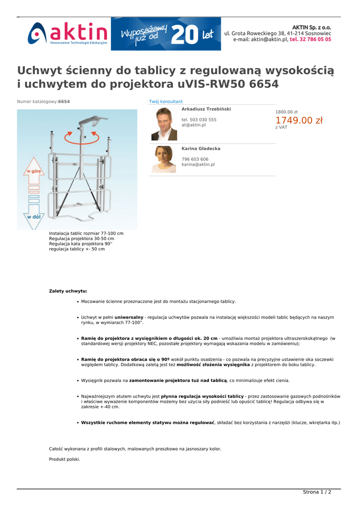 Uchwyt ścienny do tablicy z regulowaną wysokością i uchwytem do projektora uVIS-RW50 6654 Numer katalogowy:6654 Twój konsultant Arkadiusz Trzebiński tel. 503 030 555 [email protected] NOWOŚĆ W OFERCIE 1800.00 zł 1749.00 zł z VAT Karina Gładecka 796 603 606 [email protected] Instalacja tablic rozmiar 77-100 cm Regulacja projektora 30-50 cm Regulacja kata projektora 90'' regulacja tablicy +- 50 cm Zalety uchwytu: Mocowanie ścienne przeznaczone jest do montażu stacjonarnego tablicy. Uchwyt w pełni uniwersalny - regulacja uchwytów pozwala na instalację większości modeli tablic będących na naszym rynku, w wymiarach 77-100”. Ramię do projektora z wysięgnikiem o długości ok. 20 cm - umożliwia montaż projektora ultraszerokokątnego (w standardowej wersji projektory NEC, pozostałe projektory wymagają wskazania modelu w zamówieniu); Ramię do projektora obraca się o 90º wokół punktu osadzenia - co pozwala na precyzyjne ustawienie oka soczewki względem tablicy. Dodatkową zaletą jest też możliwość złożenia wysięgnika z projektorem do boku tablicy. Wysięgnik pozwala na zamontowanie projektora tuż nad tablicą, co minimalizuje efekt cienia. Najważniejszym atutem uchwytu jest płynna regulacja wysokości tablicy - przez zastosowanie gazowych podnośników i właściwe wyważenie komponentów możemy bez użycia siły podnieść lub opuścić tablicę! Regulacja odbywa się w zakresie +-40 cm. Wszystkie ruchome elementy statywu można regulować, składać bez korzystania z narzędzi (klucze, wkrętarka itp.) Całość wykonana z profili stalowych, malowanych proszkowo na jasnoszary kolor. Produkt polski. Strona 1 / 2 Szanowni kliencie, planujesz instalować (na statywie/uchwycie) projektor i tablicę innych marek niż będące w naszej ofercie? Z uwagi na fakt zróżnicowanego pod względem wagi sprzętu, prosimy o oszacowanie typu siłownika jaki powinien zostać zastosowany w uchwycie/statywie. Prosimy o podanie typu siłownika w zamówieniu. Jak dopasować typ siłownika do zestawu statywu/uchwytu z tablicą i projektorem? Oblicz łączną wagę netto projektora i tablicy i sprawdź, w którym zakresie się mieści. siłownik 200N 250N od od suma wagi netto projektora + tablicy 15 kg do 23 kg do 27 kg 33 kg Strona 2 / 2 Powered by TCPDF (www.tcpdf.org)