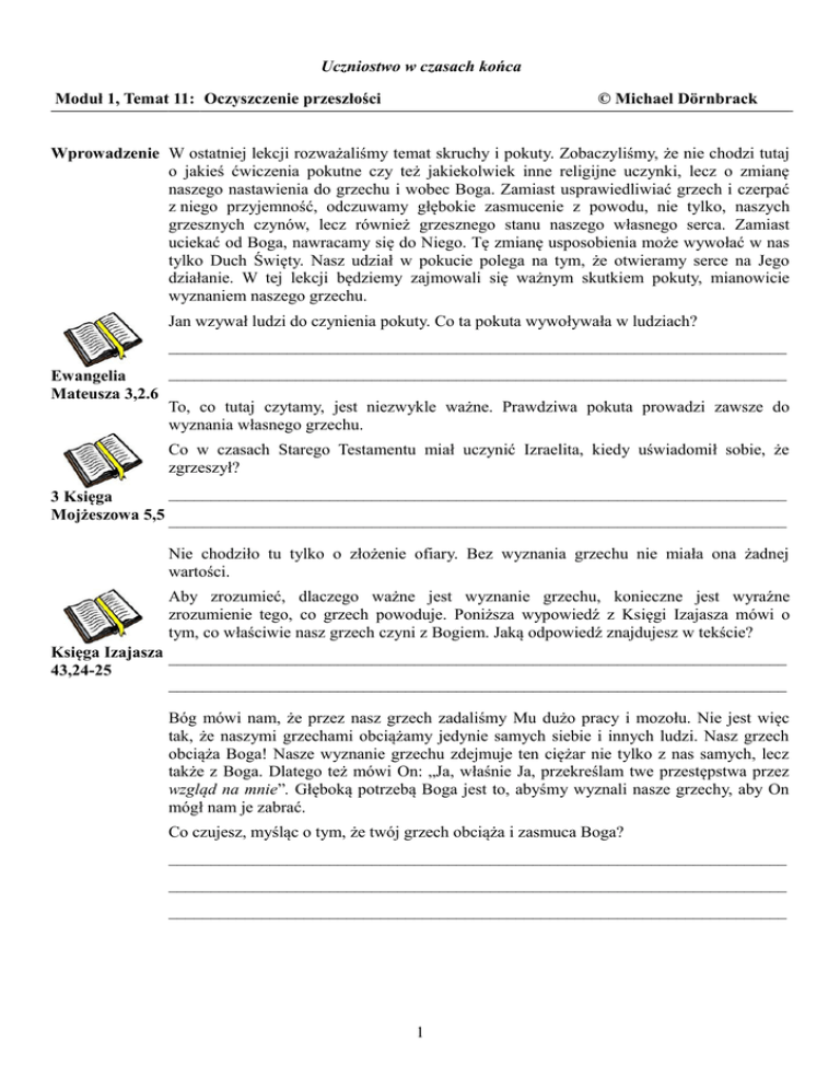 Uczniostwo w czasach końca Moduł 1, Temat 11: Oczyszczenie przeszłości © Michael Dörnbrack Wprowadzenie W ostatniej lekcji rozważaliśmy temat skruchy i pokuty. Zobaczyliśmy, że nie chodzi tutaj o jakieś ćwiczenia pokutne czy też jakiekolwiek inne religijne uczynki, lecz o zmianę naszego nastawienia do grzechu i wobec Boga. Zamiast usprawiedliwiać grzech i czerpać z niego przyjemność, odczuwamy głębokie zasmucenie z powodu, nie tylko, naszych grzesznych czynów, lecz również grzesznego stanu naszego własnego serca. Zamiast uciekać od Boga, nawracamy się do Niego. Tę zmianę usposobienia może wywołać w nas tylko Duch Święty. Nasz udział w pokucie polega na tym, że otwieramy serce na Jego działanie. W tej lekcji będziemy zajmowali się ważnym skutkiem pokuty, mianowicie wyznaniem naszego grzechu. Jan wzywał ludzi do czynienia pokuty. Co ta pokuta wywoływała w ludziach? _________________________________________________________________________ _________________________________________________________________________ Ewangelia Mateusza 3,2.6 To, co tutaj czytamy, jest niezwykle ważne. Prawdziwa pokuta prowadzi zawsze do wyznania własnego grzechu. Co w czasach Starego Testamentu miał uczynić Izraelita, kiedy uświadomił sobie, że zgrzeszył? _________________________________________________________________________ 3 Księga Mojżeszowa 5,5 _________________________________________________________________________ Nie chodziło tu tylko o złożenie ofiary. Bez wyznania grzechu nie miała ona żadnej wartości. Aby zrozumieć, dlaczego ważne jest wyznanie grzechu, konieczne jest wyraźne zrozumienie tego, co grzech powoduje. Poniższa wypowiedź z Księgi Izajasza mówi o tym, co właściwie nasz grzech czyni z Bogiem. Jaką odpowiedź znajdujesz w tekście? Księga Izajasza _________________________________________________________________________ 43,24-25 _________________________________________________________________________ Bóg mówi nam, że przez nasz grzech zadaliśmy Mu dużo pracy i mozołu. Nie jest więc tak, że naszymi grzechami obciążamy jedynie samych siebie i innych ludzi. Nasz grzech obciąża Boga! Nasze wyznanie grzechu zdejmuje ten ciężar nie tylko z nas samych, lecz także z Boga. Dlatego też mówi On: „Ja, właśnie Ja, przekreślam twe przestępstwa przez wzgląd na mnie”. Głęboką potrzebą Boga jest to, abyśmy wyznali nasze grzechy, aby On mógł nam je zabrać. Co czujesz, myśląc o tym, że twój grzech obciąża i zasmuca Boga? _________________________________________________________________________ _________________________________________________________________________ _________________________________________________________________________ 1 Z czym porównuje Izajasz nasz grzech? Co wyraża to porównanie? _________________________________________________________________________ Księga Izajasza _________________________________________________________________________ 44,22 Co musimy uczynić, aby doświadczyć przebaczenia? _________________________________________________________________________ _________________________________________________________________________ Co rozprasza mgłę? _________________________________________________________________________ Niewyznany grzech jest jak mgła, zakrywająca widok Boga i bliźniego. Nie widzimy już wyraźnie, tracimy zdolność właściwej oceny rzeczywistości, podejmujemy błędne decyzje i poruszamy się po omacku w niewłaściwym kierunku. Niewyznany grzech obciąża również naszą relację z Bogiem i naszymi bliźnimi. Tak jak mgła rozpraszana jest tylko przez słońce, podobnie przebaczenie naszych grzechów następuje wyłącznie przez Jezusa Chrystusa. Bez Niego nie możemy usunąć naszej winy, podobnie jak o własnych siłach nie moglibyśmy rozpędzić mgły. Uwidacznia się tutaj jeszcze jeden ważny aspekt. Przebaczenie grzechów jest odkupieniem. Bóg mówi: „Powróć do Mnie, bom cię odkupił”. Pragnie On nie tylko przebaczyć naszą winę. Chce też odnowienia relacji. Wyznanie grzechu ma sens tylko wtedy, jeśli przez ten akt oddajemy również nasze życie Chrystusowi. No bo co mi da przebaczenie jednego określonego grzechu, jeśli decyduję się żyć w oddaleniu od Boga, to znaczy w grzechu? Największy grzech człowieka polega na tym, że żyje on bez Boga i nie przyjmuje zbawczej oferty Jezusa. Jezus mógłby nam przebaczyć 1000 pojedynczych grzechów. Jeśli jednak nie wyznamy grzechu, który ostatecznie jest korzeniem wszystkich pozostałych grzechów, żyjemy wciąż jeszcze w stanie winy. Dawid był człowiekiem, który doświadczył tego, jak bardzo niewyznany grzech ciąży i czyni chorym oraz jak przebaczenie uwalnia od tego. Uwidacznia się to szczególnie w Psalmie 32. Psalm 32,1-8 Jak Dawid opisuje to, co dzieje się, gdy wyznajemy naszą winę? (w. 1-2) _________________________________________________________________________ _________________________________________________________________________ _________________________________________________________________________ _________________________________________________________________________ Co się stało z Dawidem, gdy chciał zataić swój grzech? (w. 3-4) _________________________________________________________________________ _________________________________________________________________________ _________________________________________________________________________ _________________________________________________________________________ _________________________________________________________________________ _________________________________________________________________________ 2 Pomyśl o jakiejś sytuacji, w której zawiniłeś. Co ta wina czyniła z tobą, dopóki nie uporządkowałeś sprawy? _________________________________________________________________________ ________________________________________________________________________