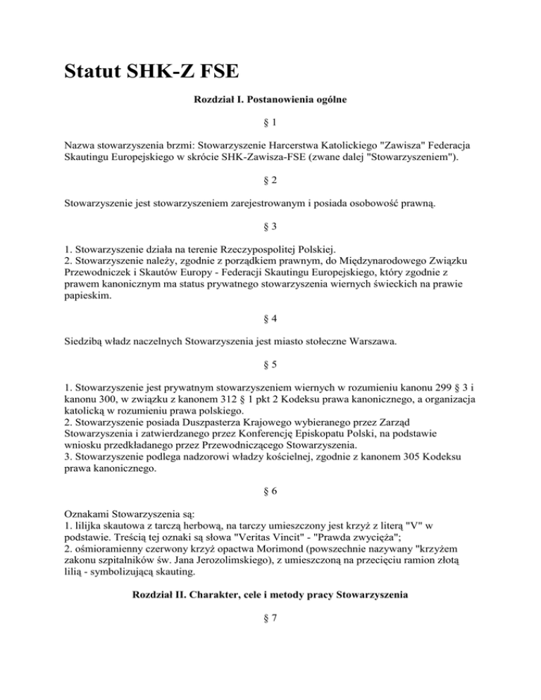 Statut SHK-Z FSE Rozdział I. Postanowienia ogólne §1 Nazwa stowarzyszenia brzmi: Stowarzyszenie Harcerstwa Katolickiego "Zawisza" Federacja Skautingu Europejskiego w skrócie SHK-Zawisza-FSE (zwane dalej "Stowarzyszeniem"). §2 Stowarzyszenie jest stowarzyszeniem zarejestrowanym i posiada osobowość prawną. §3 1. Stowarzyszenie działa na terenie Rzeczypospolitej Polskiej. 2. Stowarzyszenie należy, zgodnie z porządkiem prawnym, do Międzynarodowego Związku Przewodniczek i Skautów Europy - Federacji Skautingu Europejskiego, który zgodnie z prawem kanonicznym ma status prywatnego stowarzyszenia wiernych świeckich na prawie papieskim. §4 Siedzibą władz naczelnych Stowarzyszenia jest miasto stołeczne Warszawa. §5 1. Stowarzyszenie jest prywatnym stowarzyszeniem wiernych w rozumieniu kanonu 299 § 3 i kanonu 300, w związku z kanonem 312 § 1 pkt 2 Kodeksu prawa kanonicznego, a organizacja katolicką w rozumieniu prawa polskiego. 2. Stowarzyszenie posiada Duszpasterza Krajowego wybieranego przez Zarząd Stowarzyszenia i zatwierdzanego przez Konferencję Episkopatu Polski, na podstawie wniosku przedkładanego przez Przewodniczącego Stowarzyszenia. 3. Stowarzyszenie podlega nadzorowi władzy kościelnej, zgodnie z kanonem 305 Kodeksu prawa kanonicznego. §6 Oznakami Stowarzyszenia są: 1. lilijka skautowa z tarczą herbową, na tarczy umieszczony jest krzyż z literą "V" w podstawie. Treścią tej oznaki są słowa "Veritas Vincit" - "Prawda zwycięża"; 2. ośmioramienny czerwony krzyż opactwa Morimond (powszechnie nazywany "krzyżem zakonu szpitalników św. Jana Jerozolimskiego), z umieszczoną na przecięciu ramion złotą lilią - symbolizującą skauting. Rozdział II. Charakter, cele i metody pracy Stowarzyszenia §7 Stowarzyszenie prowadzi działalność oświatowo-wychowawczą na rzecz ogółu społeczności, której celem jest dostarczenie dzieciom i młodzieży środków osobistego rozwoju, poprzez praktykowanie tradycyjnej metody skautowej opracowanej przez założyciela skautingu Roberta Baden-Powella, rozwiniętej przez Jakuba Sevina i założycieli harcerstwa polskiego, w oparciu o zasady religii rzymskokatolickiej i poprzez możliwie najszerszą współpracę z młodymi ludźmi z innych krajów europejskich. §8 Do zadań Stowarzyszenia należy promowanie wśród swoich uczestników i członków oraz innych osób: 1. dbałości o zdrowie, higienę osobistą, kulturę fizyczną i sport oraz szacunek dla przyrody, 2. troski o rozwijanie umiejętności praktycznych, zaradności i gospodarności, 3. dbałości o zdobywanie wiedzy w szkole i poza nią, kształtowanie charakteru i przygotowanie do wykonywania zawodu, 4. troski o okazywanie szacunku oraz niesienie pomocy innym bez względu na rasę, narodowość i wyznanie, a w szczególności o rozwijanie przyjacielskich kontaktów z młodymi ludźmi z innych krajów europejskich i naukę języków obcych oraz podtrzymywanie tradycji narodowej, pielęgnowanie polskości oraz rozwój świadomości narodowej, obywatelskiej i kulturowej, 5. dbałości o poznanie i praktykowanie swojej wiary. §9 Stowarzyszenie realizuje swoje cele w szczególności poprzez: 1. prowadzenie pracy wychowawczej w sposób zróżnicowany, w odrębnych jednostkach dla chłopców i dla dziewcząt, szanując ich zróżnicowane potrzeby i możliwości psychofizyczne; 2. bliską współpracę z rodzicami dzieci i młodzieży, uczestniczących w pracy wychowawczej Stowarzyszenia; 3. organizowanie zajęć harcerskich w ciągu roku (zbiórek, biwaków i imprez na łonie przyrody, zajęć upowszechniających kulturę fizyczną i sport); 4. organizowanie zimowisk, obozów i wędrówek letnich; 5. organizowanie akcji zarobkowych przez jednostki Stowarzyszenia na potrzeby działalności statutowej; 6. organizowanie obozów szkoleniowych i kursów kształcenia dla kadry wychowawczej; 7. prowadzenie działalności wydawniczej i informacyjnej na potrzeby Stowarzyszenia; 8. organizowanie zaopatrzenia uczestników i członków Stowarzyszenia w mundury, oznaczenia, wydawnictwa, materiały pedagogiczne i podstawowy ekwipunek harcerski, 9. organizowanie sympozjów naukowych, wystaw, imprez kulturalnych, itp. Rozdział III. Członkowie i uczestnicy, ich prawa i obowiązki § 10 Ze względu na wychowawczy charakter Stowarzyszenia jego członkiem może być jedynie osoba pełnoletnia, która formalnie zadeklaruje akceptację charakteru i celu Stowarzyszenia oraz podejmie w Stowarzyszeniu czynną pracę wychowawczą lub inną formę pomocy w realizacji zadań Stowarzyszenia. § 11 Ze względu na charakter podjętego zaangażowania członkowie Stowarzyszenia dzielą się na członków czynnych i członków wspierających. § 12 Osoby niepełnoletnie, a także pełnoletnie ze wszystkich gałęzi wiekowych, które uczestniczą w pracy wychowawczej Stowarzyszenia w jego jednostkach, posiadają status uczestników. § 13 1. Członkami czynnymi są osoby pełniące funkcje wychowawcze w Stowarzyszeniu. Są to w szczególności: Przewodniczący Stowarzyszenia, Naczelnik Harcerzy i jego zastępcy oraz asystenci, Naczelniczka Harcerek i jej zastępcy oraz asystenci, Skarbnik Stowarzyszenia, Sekretarz Krajowy, Namiestnicy / Namiestniczki gałęzi i ich asystenci, członkowie Ekip Krajowych i władz naczelnych, komendanci / komendantki chorągwi i ich zastępcy oraz asystenci, hufcowi / hufcowe i ich zastępcy oraz asystenci, szczepowi / szczepowe, , szefowie / szefowe jednostek Stowarzyszenia oraz ich przyboczni. 2. Osoba pragnąca zostać członkiem czynnym Stowarzyszenia winna przejść w Stowarzyszeniu okres kandydacki uzyskując w tym czasie podstawowe kwalifikacje wychowawcze. Uzyskanie członkostwa następuje w chwili powołania na funkcję przez Naczelnika Harcerzy lub Naczelniczkę Harcerek. 3. Członek czynny Stowarzyszenia nie może należeć do innej organizacji harcerskiej lub skautowej. 4. Członkowie czynni mają prawo: a) czynnie uczestniczyć we wszystkich f