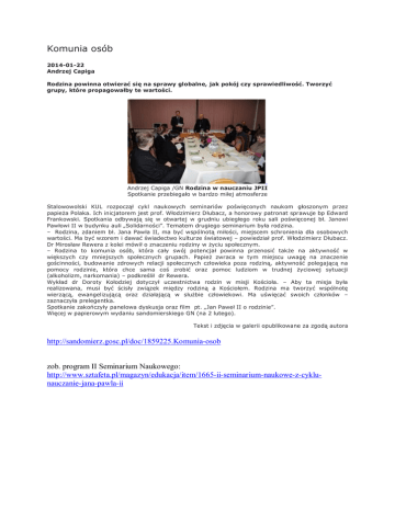 Komunia osób 2014-01-22 Andrzej Capiga Rodzina powinna otwierać się na sprawy globalne, jak pokój czy sprawiedliwość. Tworzyć grupy, które propagowałby te wartości. Andrzej Capiga /GN Rodzina w nauczaniu JPII Spotkanie przebiegało w bardzo miłej atmosferze Stalowowolski KUL rozpoczął cykl naukowych seminariów poświęconych naukom głoszonym przez papieża Polaka. Ich inicjatorem jest prof. Włodzimierz Dłubacz, a honorowy patronat sprawuje bp Edward Frankowski. Spotkania odbywają się w otwartej w grudniu ubiegłego roku sali poświęconej bł. Janowi Pawłowi II w budynku auli „Solidarności”. Tematem drugiego seminarium była rodzina. – Rodzina, zdaniem bł. Jana Pawła II, ma być wspólnotą miłości, miejscem schronienia dla osobowych wartości. Ma być wzorem i dawać świadectwo kulturze światowej – powiedział prof. Włodzimierz Dłubacz. Dr Mirosław Rewera z kolei mówił o znaczeniu rodziny w życiu społecznym. – Rodzina to komunia osób, która cały swój potencjał powinna przenosić także na aktywność w większych czy mniejszych społecznych grupach. Papież zwraca w tym miejscu uwagę na znaczenie gościnności, budowanie zdrowych relacji społecznych człowieka poza rodziną, aktywność polegającą na pomocy rodzinie, która chce sama coś zrobić oraz pomoc ludziom w trudnej życiowej sytuacji (alkoholizm, narkomania) – podkreślił dr Rewera. Wykład dr Doroty Kołodziej dotyczył uczestnictwa rodzin w misji Kościoła. – Aby ta misja była realizowana, musi być ścisły związek między rodziną a Kościołem. Rodzina ma tworzyć wspólnotę wierzącą, ewangelizującą oraz działającą w służbie człowiekowi. Ma uświęcać swoich członków – zaznaczyła prelegentka. Spotkanie zakończyły panelowa dyskusja oraz film pt. „Jan Paweł II o rodzinie”. Więcej w papierowym wydaniu sandomierskiego GN (na 2 lutego). Tekst i zdjęcia w galerii opublikowane za zgodą autora http://sandomierz.gosc.pl/doc/1859225.Komunia-osob zob. program II Seminarium Naukowego: http://www.sztafeta.pl/magazyn/edukacja/item/1665-ii-seminarium-naukowe-z-cyklunauczanie-jana-pawla-ii