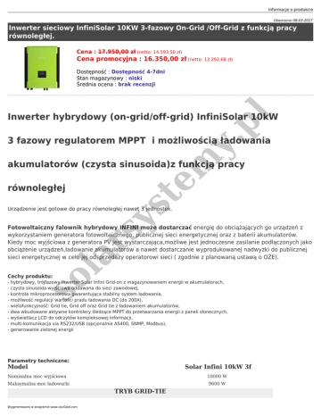 Informacje o produkcie Utworzono 08-03-2017 Inwerter sieciowy InfiniSolar 10KW 3-fazowy On-Grid /Off-Grid z funkcją pracy równoległej. Cena : 17.950,00 zł (netto: 14.593,50 zł) Cena promocyjna : 16.350,00 zł (netto: 13.292,68 zł) Dostępność : Dostępność 4-7dni Stan magazynowy : niski Średnia ocena : brak recenzji y. p l Inwerter hybrydowy (on-grid/off-grid) InfiniSolar 10kW te m 3 fazowy regulatorem MPPT i możliwością ładowania akumulatorów (czysta sinusoida)z funkcją pracy ys równoległej Urządzenie jest gotowe do pracy równoległej nawet 3 jednostek. so Cechy produktu: la rs Fotowoltaiczny falownik hybrydowy INFINI może dostarczać energię do obciążających go urządzeń z wykorzystaniem generatora fotowoltaicznego, publicznej sieci energetycznej oraz z baterii akumulatorów. Kiedy moc wyjściowa z generatora PV jest wystarczająca,możliwe jest jednoczesne zasilanie podłączonych jako obciążenie urządzeń,ładowanie akumulatorów a nawet dostarczanie wyprodukowanej nadwyżki do publicznej sieci energetycznej w celu jej odsprzedaży operatorowi sieci ( zgodnie z planowaną ustawą o OŹE). - hybrydowy, trójfazowy Inwerter Solar Infini Grid-on z magazynowaniem energii w akumulatorach, - czysta sinusoida wyjściowa oddawana do sieci zawodowej, - kontrola mikroprocesorowa gwarantująca stabilny system ładowania, - możliwość regulacji wartości pradu ładowania DC (do 200A), - wielofunkcyjność: Grid tie, Grid off oraz Grid tie z ładowaniem akumulatorów, - dwa wbudowane aktywne kontrolery śledzące MPPT do przetwarzania energii z paneli słonecznych, - wyświetlacz LCD do odczytów kompleksowej informacji, - multi-komunikacja via RS232/USB (opcjonalnie AS400, SNMP, Modbus), - generowanie zielonej energii Parametry techniczne: Model Solar Infini 10kW 3f Nominalna moc wyjściowa 10000 W Maksymalna moc ładowarki 9600 W TRYB GRID-TIE Wygenerowano w programie www.oscGold.com Wejście PV (DC) Maksymalna moc DC 14850W Nominalne napięcie DC / Maksymalne napięcie DC 720 VDC / 900 VDC Napięcie startu / Napięcie inicjacji ładowania 320 VDC / 350 VDC Zakres napięć MPPT 350 VDC ~ 850 VDC Ilość kontrolerów MPPT / Maksymalny prąd wejściowy 2 / 2 x 18.6A GRID wyjście (AC) Nominalne napięcie wyjściowe 230 VAC (P-N) / 400 VAC (P-P) Zakres napięć wyjściowych 184 - 265 VAC na fazę Nominalny prąd wyjściowy 14.5A na fazę Współczynnik mocy > 0.99 > 96% Wg norm europejskich > 95% TRYB OFF-GRID Wejście AC Napięcie startu AC/Napięcie auto-restartu y. p DC AC l Wydajność (DC > AC) 120 - 140 VAC na fazę / 180 VAC na fazę Zakres napięć wejściowych AC 170 - 280 VAC na fazę 25A Wejście PV (DC) Maksymalne napięcie DC te m Maksymalny prąd wejściowy 900 VDC Zakres napięć MPPT 350 VDC ~ 850 VDC Ilość kontrolerów MPPT / Maksymalny prąd wejściowy Tryb bateryjny wyjście (AC) Nominalne napięcie wyjściowe 230 VAC (P-N) / 400 VAC (P-P) ys Kształt napięcia 2 / 2 x 18.6A Wydajność (DC > AC) Pełna sinusoida 91% Wejście PV (DC) la rs TRYB HYBRYDY Nominalne napięcie DC / Maksymalne napięcie DC 720 VDC / 900 VDC Napięcie startu / Napięcie inicjacji ładowania 320 VDC / 350 VDC Zakres napięć MPPT 350 VDC ~ 850 VDC Ilość kontrolerów MPPT / Maksymalny prąd wejściowy GRID wyjście (AC) so Nominalne napięcie wyjściowe 2 / 2 x 18.6A 230 VAC (P-N) / 400 VAC (P-P) Zakres napięć wyjściowych 184 - 265 VAC na fazę Nominalny prąd wyjściowy 14.5A na fazę Wejście AC Napięcie startu AC/Napięcie auto-restartu 120 - 140 VAC na fazę / 180 VAC na fazę Zakres napięć wejściowych AC 170 - 280 VAC na fazę Maksymalny prąd wejściowy 25A Tryb bateryjny wyjście (AC) Nominalne napięcie wyjściowe 230 VAC (P-N) / 400 VAC (P-P) Wydajność (DC > AC) 91% Ładowanie akumulatorów Nominalne napięcie DC 48 VDC Maksymalny prąd ładowania 60A (domyślnie), 5A - 200A (zakres) INNE Wymiary i waga Wymiary, wys x szer x głęb (mm) 622 x 500 x 167.5 Informacje o produkcie Waga (kg) 45 Komunikacja Porty komunikacyjne RS-232/USB i CAN Inteligent Port Opcjonalnie SNMP, Modbus i AS-400 Otoczenie Stopień ochrony IP20 Wilgotność 0 ~ 90% (Bez kondensacji) Temperatura otoczenia -10 ~ 55°C Wysokość 0 ~ 1000 m* * redukcja mocy o 1% na każde 100m powyżej 1000m so la rs ys te m y. p l UWAGA !!! InfiniSolar 3-10kw nie wysyłamy za pobraniem Wygenerowano w programie www.oscGold.com