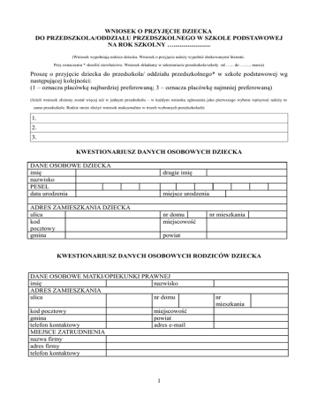 WNIOSEK O PRZYJĘCIE DZIECKA DO PRZEDSZKOLA/ODDZIAŁU PRZEDSZKOLNEGO W SZKOLE PODSTAWOWEJ NA ROK SZKOLNY …....................... (Wniosek wypełniają rodzice dziecka. Wniosek o przyjęcie należy wypełnić drukowanymi literami. Przy oznaczeniu * skreślić niewłaściwe. Wniosek składamy w sekretariacie przedszkola/szkoły od …... do …...... marca) Proszę o przyjęcie dziecka do przedszkola/ oddziału przedszkolnego* w szkole podstawowej wg następującej kolejności: (1 – oznacza placówkę najbardziej preferowaną; 3 – oznacza placówkę najmniej preferowaną) (Jeżeli wniosek złożony został więcej niż w jednym przedszkolu – w każdym wniosku zgłoszenia jako pierwszego wyboru wpisywać należy to samo przedszkole. Rodzic może złożyć wniosek maksymalnie w trzech wybranych przedszkolach) 1. 2. 3. KWESTIONARIUSZ DANYCH OSOBOWYCH DZIECKA DANE OSOBOWE DZIECKA imię nazwisko PESEL data urodzenia drugie imię miejsce urodzenia ADRES ZAMIESZKANIA DZIECKA ulica kod pocztowy gmina nr domu miejscowość nr mieszkania powiat KWESTIONARIUSZ DANYCH OSOBOWYCH RODZICÓW DZIECKA DANE OSOBOWE MATKI/OPIEKUNKI PRAWNEJ imię nazwisko ADRES ZAMIESZKANIA ulica nr domu kod pocztowy gmina telefon kontaktowy MIEJSCE ZATRUDNIENIA nazwa firmy adres firmy telefon kontaktowy miejscowość powiat adres e-mail 1 nr mieszkania DANE OSOBOWE OJCA/OPIEKUNA PRAWNEGO imię nazwisko ADRES ZAMIESZKANIA ulica nr domu kod pocztowy gmina telefon kontaktowy MIEJSCE ZATRUDNIENIA nazwa firmy adres firmy telefon kontaktowy nr mieszkania miejscowość powiat adres e-mail Na podstawie art. 14 ustawy o systemie oświaty z dnia 7 września 1991r. (j.t. Dz.U. z 2004r. nr 256, poz. 2572 ze. zm.) dzieci 5 oraz 6-letnie(odraczane od realizacji obowiązku szkolnego) realizują roczne obowiązkowe przygotowanie przedszkolne. Złożenie wniosku jest jednoznaczne z przyjęciem dziecka do przedszkola. KRYTERIA PRZYJĘĆ (w przypadku spełniania danego kryterium proszę postawić znak „X”, ilość punktów przyznaje komisja rekrutacyjna) Kryteria ustawowe przyjęcia do przedszkola (art. 20c ust. 2 ustawy z dnia 7 września 1991 r. o systemie oświaty (Dz.U. z 2004 r. nr 256, poz. 2572 ze zm.) 1. Wielodzietność rodziny kandydata. załącznik: oświadczenie o wielodzietności rodziny kandydata. 2. Niepełnosprawność kandydata. załącznik: orzeczenie o potrzebie kształcenia specjalnego wydane ze względu na niepełnosprawność, orzeczenie o niepełnosprawności lub o stopniu niepełnosprawności lub orzeczenie równoważne w rozumieniu przepisów ustawy z dnia 27 sierpnia 1997 r. rehabilitacji zawodowej i społecznej oraz zatrudnianiu osób niepełnosprawnych (Dz.U. z 2011 r. nr 127, poz. 721 ze zm.). 3. Niepełnosprawność jednego z rodziców kandydata. Załącznik: orzeczenie o niepełnosprawności lub 2 TAK NIE ILOŚĆ PKT. o stopniu niepełnosprawności lub orzeczenie równoważne w rozumieniu przepisów ustawy z dnia 27 sierpnia 1997 r. rehabilitacji zawodowej i społecznej oraz zatrudnianiu osób niepełnosprawnych (Dz.U. z 2011 r. nr 127, poz. 721 ze zm.). 4. Niepełnosprawność obojga rodziców kandydata. załącznik: orzeczenie o niepełnosprawności lub o stopniu niepełnosprawności lub orzeczenie równoważne w rozumieniu przepisów ustawy z dnia 27 sierpnia 1997 r. rehabilitacji zawodowej i społecznej oraz zatrudnianiu osób niepełnosprawnych (Dz.U. z 2011 r. nr 127, poz. 721 ze zm.). 5. Niepełnosprawność rodzeństwa kandydata. załącznik: orzeczenie o potrzebie kształcenia specjalnego wydane ze względu na niepełnosprawność, orzeczenie o niepełnosprawności lub o stopniu niepełnosprawności lub orzeczenie równoważne w rozumieniu przepisów ustawy z dnia 27 sierpnia 1997 r. rehabilitacji zawodowej i społecznej oraz zatrudnianiu osób niepełnosprawnych (Dz.U. z 2011 r. nr 127, poz. 721 ze zm.). 6. Samotne wychowywanie kandydata w rodzinie. załącznik: prawomocny wyrok sądu rodzinnego orzekający rozwód lub separację lub akt zgonu oraz oświadczenie o samotnym wychowywaniu dziecka oraz niewychowywaniu żadnego dziecka wspólnie z jego rodzicem). 7. Objęcie kandydata pieczą zastępczą. załącznik: dokument potwierdzający objęcie dziecka pieczą zastępczą zgodnie z ustawą z dnia 9 czerwca 2011 r. o wspieraniu rodziny i systemie pieczy zastępczej (Dz.U. z 2013 r. poz.135). Suma pkt. Poszczególne kryteria ustawowe mają wartość 1 punktu. 3 KRYTERIA DODATKOWE - ustalone w porozumieniu z Burmistrzem Łaz (w przypadku spełniania danego kryterium proszę postawić znak „X”, ilość punktów przyznaje komisja rekrutacyjna) Lp. Kryteria dodatkowe przyjęcia do przedszkola 1. Dziecko 4 - letnie 2. Dziecko 3 - letnie 3. TAK NIE Ilość pkt. Dziecko, którego oboje rodziców pracuje, studiuje lub uczy się w trybie dziennym. załącznik: oświadczenie wnioskodawcy o zatrudnieniu, studiowaniu lub nauce w trybie dziennym; 4. Dziecko, którego rodzeństwo uczęszcza do danego przedszkola. Załącznik: oświadczenie wnioskodawcy o uczęszczaniu rodzeństwa dziecka do danego przedszkola; 5. Dziecko, którego rodzeństwo kandyduje do tego samego przedszkola. Załącznik: oświadczenie wnioskodawcy o kandydowaniu rodzeństwa do danego przedszkola . 6. Dziecko, którego rodzina korzysta ze świadczeń opieki społecznej. załącznik: oświadczenie wnioskodawcy o korzystaniu z pomocy Ośrodka Pomocy Społecznej; Suma pkt. INFORMACJE O DZIECKU Informacje o stanie zdrowia dziecka mogące mieć znaczenie podczas pobytu dziecka w przedszkolu/ oddziale przedszkolnym w szkole podstawowej*. 4 Załączniki obowiązujące do wniosku: • oświadczenie o wielodzietności rodziny kandydata; • orzeczenie o potrzebie kształcenia specjalnego wydane ze względu na niepełnosprawność; orzeczenie o niepełnosprawności lub o stopniu niepełnosprawności lub orzeczenie równoważne w rozumieniu przepisów ustawy z dnia 27 sierpnia 1997 r. rehabilitacji zawodowej i społecznej oraz zatrudnianiu o