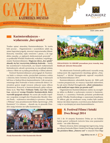 Bezpłatny INFORMATOR URZĘDU MIASTA W KA ZIMIER ZU DOLNYM C 2014 NR 7 (34) LIPIE Kazimiernikejszyn – wydarzenie „bez spinki” Trudno opisać atmosferę Kazimiernikejszyn. To trzeba było poczuć… Organizatorom i uczestnikom udało się, mimo kapryśnej pogody, stworzyć niepowtarzalny klimat. Koncerty, warsztaty, rajdy rowerowe i piesze, a do tego dobra muzyka „w pięknych okolicznościach przyrody” – co podkreślał Włodek Dembowski, wokalista i współorganizator Kazimiernikejszyn. Magiczne słowa „bez spinki” okazały się być rzeczywistą definicją festiwalu – każdy, kto uczestniczył w koncertach, czy innych wydarzeniach festiwalowych, odczuł z pewnością, że czas płynął wolniej, a deszcz i błoto nie są żadną przeszkodą w dobrej zabawie. Festiwal Kazimiernikejszyn przyciągnął do Kazimierza ludzi w różnym wieku, przyjechało mnóstwo rodzin z dziećmi, które świetnie się bawiły brodząc w kaloszach lub boso w białym błocie kamieniołomów. Całe szczęście, ostatniego dnia Festiwalu w końcu zaświeciło słońce i festiwalowi goście mogli wreszcie zobaczyć jasne oblicze Kazimierza. Koncerty w kamieniołomach, gdzie usłyszeliśmy m.in. Voo Voo i Trebunie Tutki, Lao Che i Łąki Łan, zakończył występ Dziadów Kazimierskich, który wyzwolił apogeum emocji. Na scenie jak zwykle wspólnie z zespołem wystąpił chór Dziadowskie Słowiki i Marcin Pisula – wykonawca introdukcji w piosence „Banany z Plebany” oraz przedstawiciele Klubu Sportowego „Orły Kazimierz”. Co ciekawe… okazało się, że piosenki Dziadów znają świetnie nie tylko kazimierzacy. YOGA&WALKA NA KOLORY prowadzone przez trenerkę Annę Kushch, fot. Sylwester Doraczyński Na zakończenie Festiwalu publiczność wyraziła swoją wdzięczność dla organizatorów skandując głośno „Dziękujemy!”, a Michał Niewęgłowski zaprosił wszystkich na Kazimiernikejszyn 2015. Kazimiernikejszyn odwiedziło łącznie ok. 3000 osób i można przypuszczać, że wszyscy wyjechali zadowoleni, bo jak mówi Michał Niewęgłowski: „Ilość entuzjastycznych maili jest super duża, po prostu szał!”. Organizatorom Kazimiernikejszyn należy się szczególny ukłon za dbałość o zachowanie czystości w kamieniołomach, a i uczestnicy Festiwalu poważnie potraktowali prośby Włodka Dembowskiego o szanowanie krajobrazu. W efekcie, gdy już rozebrano scenę, trudno było znaleźć ślad po tak dużej imprezie, oczywiście poza śladami butów i stóp w wyschniętej już ziemi kamieniołomów. 8. Festiwal Filmu i Sztuki Dwa Brzegi 2014 Od 2 do 10 sierpnia Kazimierz Dolny po raz kolejny będzie gościć wybitnych twórców kina oraz pasjonatów sztuki – nie tylko filmowej. Filmem otwarcia, który zainauguruje tegoroczną, ósmą już edycję Festiwalu Filmu i Sztuki Dwa Brzegi, będzie polska premiera filmu „Zimowy sen” w reżyserii Nuri Bilge Dziady Kazimierskie i Chór Kazimierskie Słowiki ciąg dalszy na str. 2 1 Szanowni Państwo Ten numer naszej Gazety stoi pod znakiem festiwali – tych, które już za nami i tych, które już wkrótce. Kazimierz jest miejscem szczególnym i warto dbać o to, aby przedsięwzięcia, które mają tu miejsce, nie były przypadkowe. W ostatnim czasie coraz bardziej klaruje się marka Kazimierza, jako miejsca z ciekawą ofertą, daleką od tak powszechnej dziś komercji. Świetnie sprawdził się nowy pomysł – Festiwal Kazimiernikejszyn, który poza muzyką promował również miasto, jego klimat oraz styl wypoczynku wśród kazimierskiej przyrody. Od blisko 50-u lat towarzyszy nam Festiwal Kapel i Śpiewaków Ludowych, jedyna tego typu impreza w Polsce pokazująca sztukę ludową we wszystkich jej przejawach. Od 1981 r., w czasie Letnich Wieczorów Organowych, kazimierska fara gości mistrzów organów z całego świata. Festiwal Dwa Brzegi, którego nie trzeba już reklamować, wkrótce uczyni nas na jakiś czas filmową stolicą Polski. Jeszcze w sierpniu Pardes Festival, nawiązujący do historii naszego miasta, które przed wojną licznie zamieszkiwała ludność żydowska, a we wrześniu Festiwal Kolonii Artystycznych – nowy pomysł na pokazanie Kazimierza jako prawdziwego miasta artystów. Mam nadzieję, że zarówno odwiedzający nas goście jak i mieszkańcy, znajdą wśród tej bogatej oferty coś dla siebie. W tym wydaniu Gazety przeczytacie Państwo o szczegółach wydarzeń kulturalnych odbywających się w tym roku w naszym mieście. Mamy także niespodziankę dla tych, którzy bardziej niż doznania artystyczne, cenią sobie emocje sportowe. Od tego wydania będziemy mieć w Gazecie Kazimierza Dolnego stałą rubrykę sportową, gdzie na bieżąco będzie można zapoznawać się z osiągnięciami naszej drużyny KKS Orły Kazimierz oraz innych klubów sportowych działających na terenie naszej gminy. Zapraszam do lektury. Burmistrz Grzegorz Dunia 8. Festiwal Filmu i Sztuki Dwa Brzegi 2014 ciąg dalszy ze str. 1 Ceylan, który zdobył Złotą Palmę na festiwalu w Cannes. Na Dwóch Brzegach zobaczymy jak zwykle najlepsze filmy wyselekcjonowane na polskich i zagranicznych festiwalach, premiery i obrazy, które odegrały znaczącą rolę w rozwoju światowej kinematografii, jak również spektakle, wystawy, spotkania z twórcami i wydarzenia z innych dziedzin kultury. Świat pod namiotem zaprezentuje zestaw filmów, pokazujących najnowsze trendy sztuki filmowej z całego świata. Zobaczymy tu m.in. „Dyplomację” V. Schlöndorffa, „Psie pole” L. Majewskiego, „W imię” M. Szumowskiej. W przeglądzie z cyklu Na krótką metę zaprezentowane zostaną polskie i zagraniczne filmy krótkometrażowe, wśród nich wiele nagrodzonych na międzynarodowych festiwalach. W sekcji Retrospektywy reżyserskie główną bohaterką tegorocznego festiwalu będzie Małgorzata Szumowska i jej filmy m.in. „Ono”, „33 sceny z życia”, „W imię”, natomiast gościem tegorocznego cyklu I Bóg stworzył aktora bę