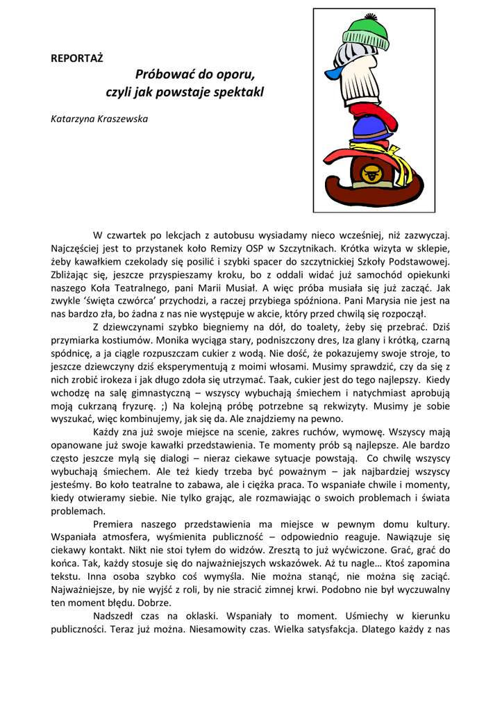 REPORTAŻ Próbować do oporu, czyli jak powstaje spektakl Katarzyna Kraszewska W czwartek po lekcjach z autobusu wysiadamy nieco wcześniej, niż zazwyczaj. Najczęściej jest to przystanek koło Remizy OSP w Szczytnikach. Krótka wizyta w sklepie, żeby kawałkiem czekolady się posilić i szybki spacer do szczytnickiej Szkoły Podstawowej. Zbliżając się, jeszcze przyspieszamy kroku, bo z oddali widać już samochód opiekunki naszego Koła Teatralnego, pani Marii Musiał. A więc próba musiała się już zacząć. Jak zwykle ‘święta czwórca’ przychodzi, a raczej przybiega spóźniona. Pani Marysia nie jest na nas bardzo zła, bo żadna z nas nie występuje w akcie, który przed chwilą się rozpoczął. Z dziewczynami szybko biegniemy na dół, do toalety, żeby się przebrać. Dziś przymiarka kostiumów. Monika wyciąga stary, podniszczony dres, Iza glany i krótką, czarną spódnicę, a ja ciągle rozpuszczam cukier z wodą. Nie dość, że pokazujemy swoje stroje, to jeszcze dziewczyny dziś eksperymentują z moimi włosami. Musimy sprawdzić, czy da się z nich zrobić irokeza i jak długo zdoła się utrzymać. Taak, cukier jest do tego najlepszy. Kiedy wchodzę na salę gimnastyczną – wszyscy wybuchają śmiechem i natychmiast aprobują moją cukrzaną fryzurę. ;) Na kolejną próbę potrzebne są rekwizyty. Musimy je sobie wyszukać, więc kombinujemy, jak się da. Ale znajdziemy na pewno. Każdy zna już swoje miejsce na scenie, zakres ruchów, wymowę. Wszyscy mają opanowane już swoje kawałki przedstawienia. Te momenty prób są najlepsze. Ale bardzo często jeszcze mylą się dialogi – nieraz ciekawe sytuacje powstają. Co chwilę wszyscy wybuchają śmiechem. Ale też kiedy trzeba być poważnym – jak najbardziej wszyscy jesteśmy. Bo koło teatralne to zabawa, ale i ciężka praca. To wspaniałe chwile i momenty, kiedy otwieramy siebie. Nie tylko grając, ale rozmawiając o swoich problemach i świata problemach. Premiera naszego przedstawienia ma miejsce w pewnym domu kultury. Wspaniała atmosfera, wyśmienita publiczność – odpowiednio reaguje. Nawiązuje się ciekawy kontakt. Nikt nie stoi tyłem do widzów. Zresztą to już wyćwiczone. Grać, grać do końca. Tak, każdy stosuje się do najważniejszych wskazówek. Aż tu nagle… Ktoś zapomina tekstu. Inna osoba szybko coś wymyśla. Nie można stanąć, nie można się zaciąć. Najważniejsze, by nie wyjść z roli, by nie stracić zimnej krwi. Podobno nie był wyczuwalny ten moment błędu. Dobrze. Nadszedł czas na oklaski. Wspaniały to moment. Uśmiechy w kierunku publiczności. Teraz już można. Niesamowity czas. Wielka satysfakcja. Dlatego każdy z nas tak bardzo kocha tą zabawę w teatr i za każdym razem wraca. Tej atmosferze mało która inna się równa. ODKOPANE SONDY Pamiętacie, jak w zeszłym roku przeprowadzaliśmy ankiety wśród uczniów? OtóŜ nasza redakcja przekopała archiwum i oto prezentujemy opinię publiczną naszej szkoły. Zdania, jak to zawsze bywa, były podzielone, a niektóre odpowiedzi bardzo zaskakujące... Przekonajcie się sami! Co sądzisz o parach, które okazują sobie miłość na korytarzu? 20 15 10 5 0 Ilość ankietowanych uczniów Jest mi to obojętne. Bulwersuje mnie to. Podoba mi się to. To jest śmieszne! Co myślisz o dziewczynach, które niezgodnie z regulaminem pokazują swoje brzuchy i plecy w szkole? 20 15 10 5 0 Nie w szkole. Fajnie to wygląda, Jest to nieestetyczne. jeśli dziewczyna ma co pokazać. NAUCZYCIEL ROKU UCZEŃ ROKU 2006/2007 Rywalizacja o tytuł najlepszego juŜ zakończona...Walka była zacięta mnóstwo kandydatów, a tylko dwie korony...;) A komu one przypadły? Najlepszym nauczycielem w opinii uczniów okazał się p. Wiktor Mętel! Natomiast na drugim miejscu znalazł się p.Zbigniew Watoła. Co do najlepszego ucznia, okazał się nim być Łukasz Pieprzyk (3c) ,a zaraz za nim Natalia Ormanty (absolwentka). No, no.. Ciekawe tylko jakimi kryteriami kierowali się ankietowani ;) GRATULUJEMY ZWYCIĘZCOM! 30 25 20 15 10 5 0 TAK, WIEM NIE WIEM Jakie jest twoje zdanie na temat dołączenia oddziału ze Szczytnik do gimnazjum w Niegowici? Ilość ankietowanych uczniów Ilość ankietowanych uczniów Czy wiesz, kto jest przewodniczącym szkoły? 14 12 10 8 6 4 2 0 W ogóle nie podoba mi się ten pomysł. Jest mi to obojętne. W sumie fajnie. Bardzo dobrze, Ŝe dołączyli. ROK NA WAGĘ śYCIA, czyli jak to z tymi trzeciakami jest… Katarzyna Kraszewska Dla niektórych z nas jest to ostatni rok nauki w gimnazjum. I tak naprawdę jest to rok, który całkowicie zawaŜy na naszym przyszłym Ŝyciu. Ostatnio zdałam sobie z tego sprawę. Jeśli nie wypracuję satysfakcjonujących mnie ocen,napiszę źle egzamin gimnazjalny. Nie dostanę się do dobrej szkoły. Niedostatecznie przygotuję się do matury i studiów. Na te studia w końcu nie zdam Albo zdam na wydział w ogóle mnie niesatysfakcjonujący Koniec końców nici z wymarzonego zawodu. I wtedy juŜ całe Ŝycie zawodowe nie po mojej myśli… Tyczy się to wszystkich. Niestety – nie wszyscy zdają sobie z tego sprawę. A wypadałoby chyba. Więc moŜe zacznijmy myśleć o naszej przyszłości? Wiele rzeczy w szkole nam się nie podoba. Zmieniając cały świat – zacznijmy od siebie. Opowiadanie BEZSILNOŚĆ? Karolina Stopa Pada deszcz. Siedzę na parapecie wpatrując się w okno. Patrzę, ale niewiele widzę. Moje myśli są zupełnie gdzie indziej. Gdzie? OtóŜ w głowie ciągle mam jeszcze wczorajszy dzień. Co się stało? Wchodzę do szkoły, słyszę jakieś krzyki. Przystaję. Po chwili skupienia orientuję się skąd dochodzą te odgłosy. Przez krzaki widzę dwóch trzecioklasistów pastwiących się nad pierwszakiem. Chłopcy wymuszali na młodszym pieniądze, lecz on nie chciał ich im dać. WyŜsi i duŜo lepiej zbudowani zaczynają kopać Kamila (bo tak, jak się później dowiedziałam, miała na imię ich ofiara). On upada na ziemię, ale tamci nie