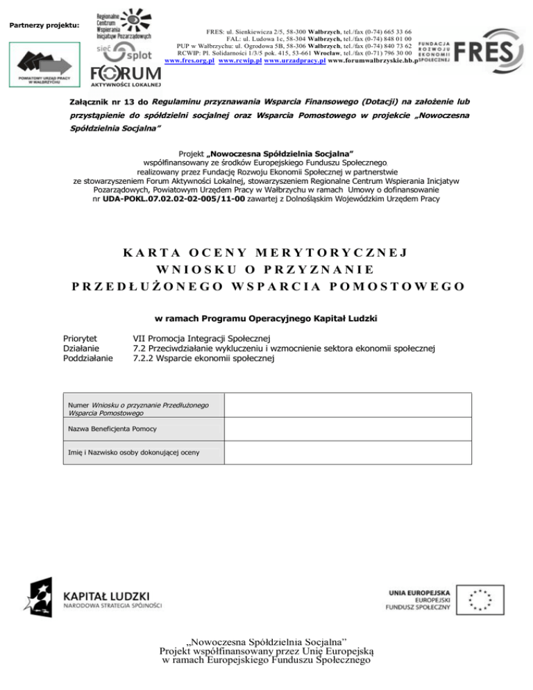 Partnerzy projektu: FRES: ul. Sienkiewicza 2/5, 58-300 Wałbrzych, tel./fax (0-74) 665 33 66 FAL: ul. Ludowa 1c, 58-304 Wałbrzych, tel./fax (0-74) 848 01 00 PUP w Wałbrzychu: ul. Ogrodowa 5B, 58-306 Wałbrzych, tel./fax (0-74) 840 73 62 RCWIP: Pl. Solidarności 1/3/5 pok. 415, 53-661 Wrocław, tel./fax (0-71) 796 30 00 www.fres.org.pl www.rcwip.pl www.urzadpracy.pl www.forumwalbrzyskie.hb.pl Załącznik nr 13 do Regulaminu przyznawania Wsparcia Finansowego (Dotacji) na założenie lub przystąpienie do spółdzielni socjalnej oraz Wsparcia Pomostowego w projekcie „Nowoczesna Spółdzielnia Socjalna” Projekt „Nowoczesna Spółdzielnia Socjalna” współfinansowany ze środków Europejskiego Funduszu Społecznego, realizowany przez Fundację Rozwoju Ekonomii Społecznej w partnerstwie ze stowarzyszeniem Forum Aktywności Lokalnej, stowarzyszeniem Regionalne Centrum Wspierania Inicjatyw Pozarządowych, Powiatowym Urzędem Pracy w Wałbrzychu w ramach Umowy o dofinansowanie nr UDA-POKL.07.02.02-02-005/11-00 zawartej z Dolnośląskim Wojewódzkim Urzędem Pracy KARTA OCENY MERYTORYCZNEJ WNIOSKU O PRZYZNANIE PRZEDŁUŻONEGO WSPARCIA POMOSTOWEGO w ramach Programu Operacyjnego Kapitał Ludzki Priorytet Działanie Poddziałanie VII Promocja Integracji Społecznej 7.2 Przeciwdziałanie wykluczeniu i wzmocnienie sektora ekonomii społecznej 7.2.2 Wsparcie ekonomii społecznej Numer Wniosku o przyznanie Przedłużonego Wsparcia Pomostowego Nazwa Beneficjenta Pomocy Imię i Nazwisko osoby dokonującej oceny „Nowoczesna Spółdzielnia Socjalna” Projekt współfinansowany przez Unię Europejską w ramach Europejskiego Funduszu Społecznego Partnerzy projektu: FRES: ul. Sienkiewicza 2/5, 58-300 Wałbrzych, tel./fax (0-74) 665 33 66 FAL: ul. Ludowa 1c, 58-304 Wałbrzych, tel./fax (0-74) 848 01 00 PUP w Wałbrzychu: ul. Ogrodowa 5B, 58-306 Wałbrzych, tel./fax (0-74) 840 73 62 RCWIP: Pl. Solidarności 1/3/5 pok. 415, 53-661 Wrocław, tel./fax (0-71) 796 30 00 www.fres.org.pl www.rcwip.pl www.urzadpracy.pl www.forumwalbrzyskie.hb.pl Deklaracja bezstronności i poufności: Oświadczam, że: Wyrażam zgodę na mój udział w procedurze oceny merytorycznej Wniosku w ramach Projektu "Nowoczesna Spółdzielnia Socjalna" i deklaruję, że: - Nie pozostaję w związku małżeńskim ani w faktycznym pożyciu albo stosunku pokrewieństwa lub powinowactwa w linii prostej, pokrewieństwa lub powinowactwa w linii bocznej do drugiego stopnia, oraz nie jestem związany (-a) z tytułu przysposobienia, opieki lub kurateli z osobami wnioskującymi o przyznanie Przedłużonego Wsparcia Pomostowego. - Przed upływem trzech lat od daty rozpoczęcia Projektu "Nowoczesna Spółdzielnia Socjalna" nie pozostawałem (-am) w stosunku pracy lub zlecenia z osobami wnioskującymi o przyznanie Przedłużonego Wsparcia Pomostowego. - Nie pozostaję z osobami wnioskującymi o przyznanie Przedłużonego Wsparcia Pomostowego (Uczestnikami Projektu) w takim stosunku prawnym lub faktycznym, że może to budzić uzasadnione wątpliwości co do mojej bezstronności. - Jeżeli okaże się, że w trakcie trwania procesu oceny merytorycznej Wniosku zaistnieją jakiekolwiek okoliczności mogące budzić wątpliwości, co do mojej bezstronności, bezzwłocznie wstrzymam się z wyrażaniem opinii i z dokonaniem oceny Wniosku. Fakt taki zgłoszę niezwłocznie Przewodniczącemu Komisji Oceny Wniosków. - Zobowiązuję się utrzymywać w tajemnicy i poufności wszelkie informacje i dokumenty, które zostały mi ujawnione, przygotowane przeze mnie w trakcie procesu oceny Wniosku. - Będę bezstronnie i uczciwie wykonywać swoje obowiązki związane z oceną Wniosków. Zobowiązuję się stosować do obowiązujących regulacji dotyczących zasad, warunków i sposobów oceny merytorycznej Wniosków. - Poprzez złożenie niniejszej deklaracji, potwierdzam, że zapoznałam/zapoznałem się z dostępnymi do dnia dzisiejszego wytycznymi dotyczącymi oceny Wniosków. …………………….…………………………… …………………….……………………………… Data Podpis oceniającego „Nowoczesna Spółdzielnia Socjalna” Projekt współfinansowany przez Unię Europejską w ramach Europejskiego Funduszu Społecznego Partnerzy projektu: FRES: ul. Sienkiewicza 2/5, 58-300 Wałbrzych, tel./fax (0-74) 665 33 66 FAL: ul. Ludowa 1c, 58-304 Wałbrzych, tel./fax (0-74) 848 01 00 PUP w Wałbrzychu: ul. Ogrodowa 5B, 58-306 Wałbrzych, tel./fax (0-74) 840 73 62 RCWIP: Pl. Solidarności 1/3/5 pok. 415, 53-661 Wrocław, tel./fax (0-71) 796 30 00 www.fres.org.pl www.rcwip.pl www.urzadpracy.pl www.forumwalbrzyskie.hb.pl L.p. Kryteria oceny Max Min ilość Ilość ilość punktów punktów punktów przyznana Jakie sukcesy w prowadzonej działalności gospodarczej do tej pory odniosła spółdzielnia socjalna? Do ilu potencjalnych klientów udało się dotrzeć spółdzielni socjalnej ze swoją ofertą? Jakie inwestycje/wydatki zostały zrealizowane w spółdzielni socjalnej od momentu rozpoczęcia działalności? 10 6 10 6 5 3 4 Jakie są najważniejsze cele spółdzielni socjalnej na okres 6 miesięcy od momentu uzyskania przedłużonego wsparcia finansowego? 10 6 5 Jakie czynniki mają bezpośredni wpływ na niezadowalającą sytuację spółdzielni socjalnej (typ problemu, uzasadnienie przyznania przedłużonego wsparcia pomostowego)? 20 12 6 Problemy z płynnością finansową wynikają z: 5 3 7 Jakie środki zaradcze podejmie spółdzielnia socjalna w celu poprawy swojej sytuacji ekonomicznej? Odzyskanie płynności finansowej będzie zależało od: 10 6 Stopień realizacji Planu (przychody, koszty, odchylenia): 30 18 a. w jaki sposób kształtują się następujące wskaźniki płynności finansowej: 15 9 - Wskaźnik bieżącej płynności = (zapasy + należności + środki pieniężne + aktywa bieżące) / zobowiązania krótkoterminowe 5 3 - Wskaźnik szybkiej płynności = (majątek obrotowy - zapasy - rozliczenia międzyok