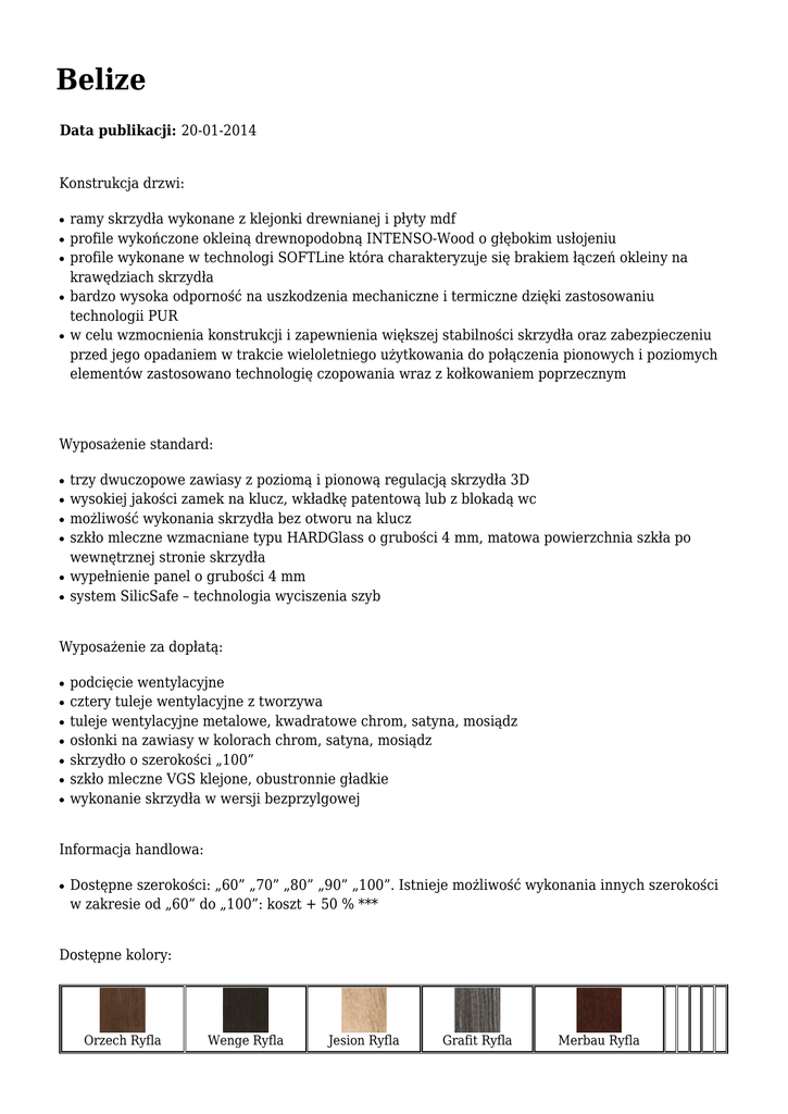 Belize Data publikacji: 20-01-2014 Konstrukcja drzwi: ● ● ● ● ● ramy skrzydła wykonane z klejonki drewnianej i płyty mdf profile wykończone okleiną drewnopodobną INTENSO-Wood o głębokim usłojeniu profile wykonane w technologi SOFTLine która charakteryzuje się brakiem łączeń okleiny na krawędziach skrzydła bardzo wysoka odporność na uszkodzenia mechaniczne i termiczne dzięki zastosowaniu technologii PUR w celu wzmocnienia konstrukcji i zapewnienia większej stabilności skrzydła oraz zabezpieczeniu przed jego opadaniem w trakcie wieloletniego użytkowania do połączenia pionowych i poziomych elementów zastosowano technologię czopowania wraz z kołkowaniem poprzecznym Wyposażenie standard: ● ● ● ● ● ● trzy dwuczopowe zawiasy z poziomą i pionową regulacją skrzydła 3D wysokiej jakości zamek na klucz, wkładkę patentową lub z blokadą wc możliwość wykonania skrzydła bez otworu na klucz szkło mleczne wzmacniane typu HARDGlass o grubości 4 mm, matowa powierzchnia szkła po wewnętrznej stronie skrzydła wypełnienie panel o grubości 4 mm system SilicSafe – technologia wyciszenia szyb Wyposażenie za dopłatą: ● ● ● ● ● ● ● podcięcie wentylacyjne cztery tuleje wentylacyjne z tworzywa tuleje wentylacyjne metalowe, kwadratowe chrom, satyna, mosiądz osłonki na zawiasy w kolorach chrom, satyna, mosiądz skrzydło o szerokości „100” szkło mleczne VGS klejone, obustronnie gładkie wykonanie skrzydła w wersji bezprzylgowej Informacja handlowa: ● Dostępne szerokości: „60” „70” „80” „90” „100”. Istnieje możliwość wykonania innych szerokości w zakresie od „60” do „100”: koszt + 50 % *** Dostępne kolory: Orzech Ryfla Wenge Ryfla Jesion Ryfla Grafit Ryfla Merbau Ryfla