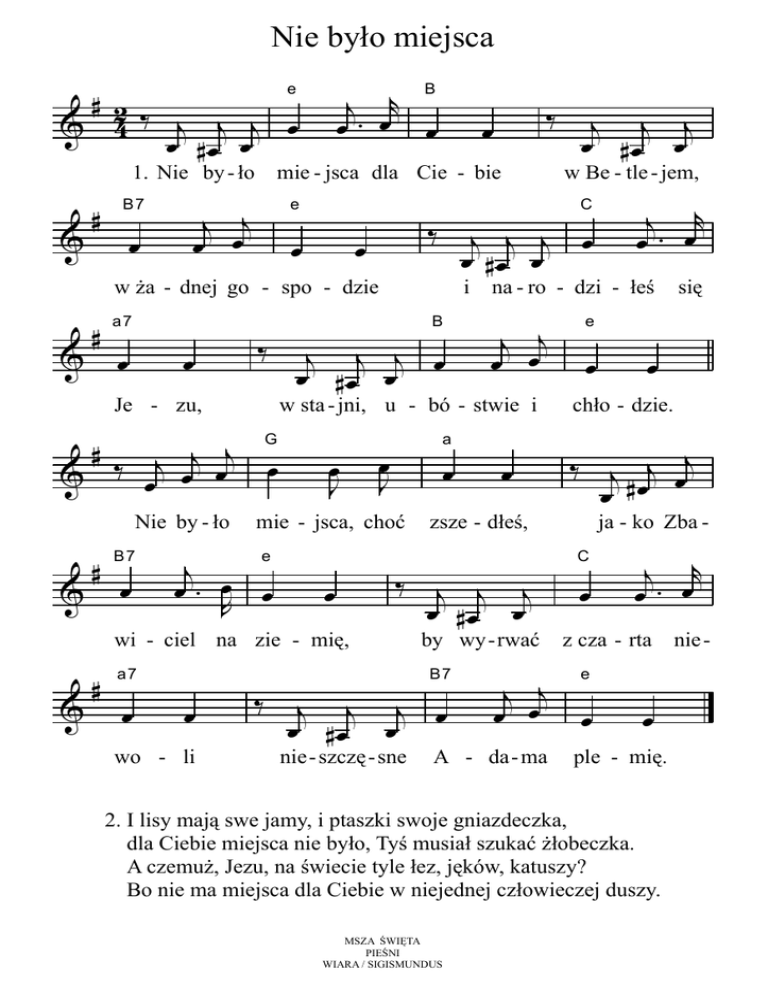 Nie było miejsca B j r œ. œ œ e # 2‰ & 4 j j j œ œ #œ œ 1. Nie by - ło & # B7 œ j œj œ e œ C ‰ œ & a7 œ œ ‰ Je - zu, j j j œ œ #œ œ G j j & ‰ œj œ œ œ Nie by - ło & # B7 œ B j j j œ #œ œ œ œ J j œ e œ. R œ & a7 œ œ wo - li a œ J œ mie - jsca, choć œ wi - ciel na zie - mię, # i j j œ œ ‰ œ zsze - dłeś, ‰ j j j œ #œ œ by wy-rwać B7 j j j œ #œ œ œ nie- szczę -sne j r œ. œ na - ro - dzi - łeś w sta - jni, u - bó - stwie i # j j j œ #œ œ w Be - tle - jem, mie - jsca dla Cie - bie w ża - dnej go - spo - dzie # ‰ œ e œ œ chło - dzie. ‰ j j œj œ #œ ja - ko Zba - C œ j œr œ. z cza - rta j j œ œ œ A - da- ma e œ ple - mię. 2. I lisy mają swe jamy, i ptaszki swoje gniazdeczka, dla Ciebie miejsca nie było, Tyś musiał szukać żłobeczka. A czemuż, Jezu, na świecie tyle łez, jęków, katuszy? Bo nie ma miejsca dla Ciebie w niejednej człowieczej duszy. MSZA ŚWIĘTA PIEŚNI WIARA / SIGISMUNDUS się nie -